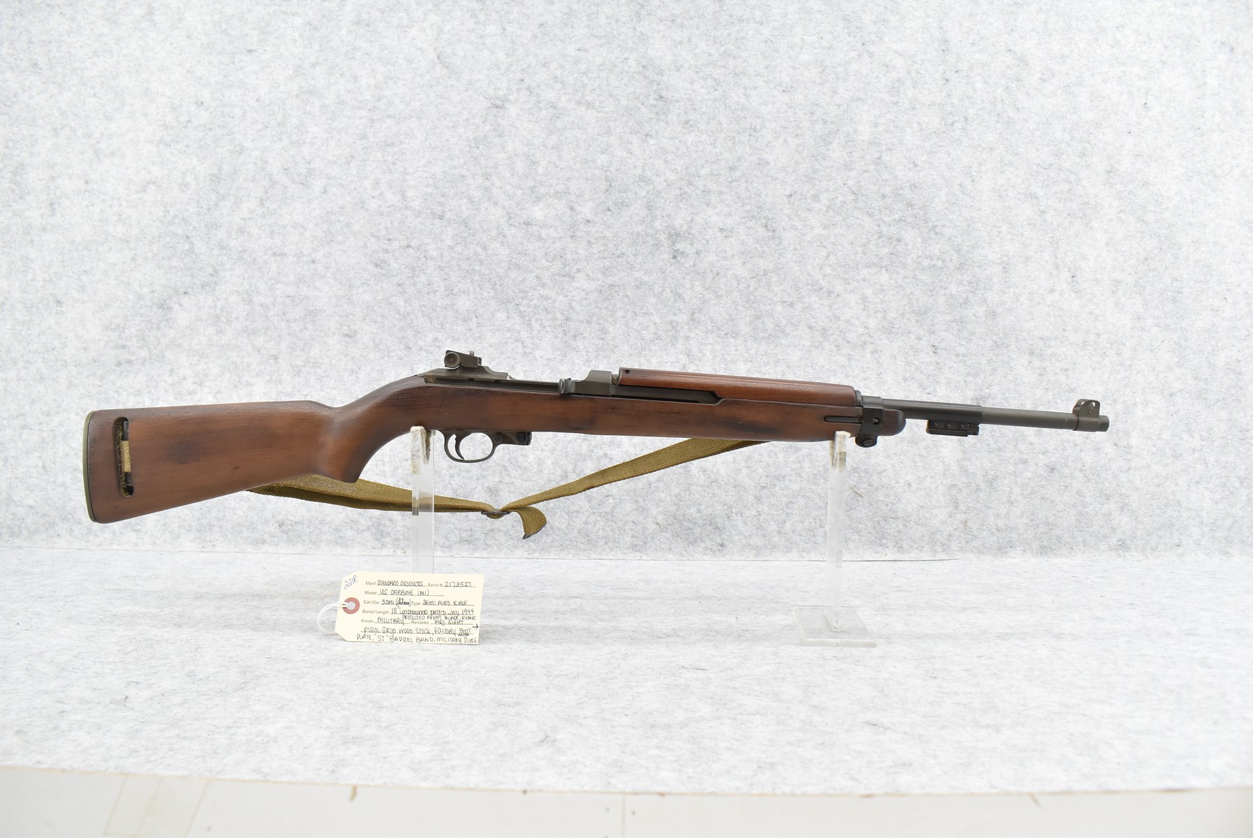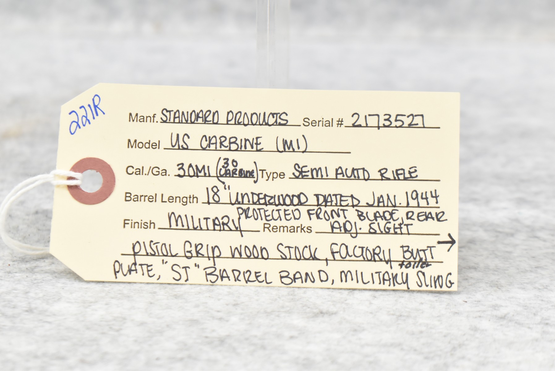 221R. Standard Products – Mod. M1 Carbine – 30 Carbine Cal. Semi-Auto Rifle – w/18” Underwood Jan. 1944 Dated Barrel w/Protected Front & Blade Rear Adj. Sights – Military Finish – w/Pistol Grip Wood Stock w/Factory Butt Plate w/Vivid Cartouche on Right Side of Butt Stock – w/“ST” Barrel Band – w/Military Sling – w/Oiler