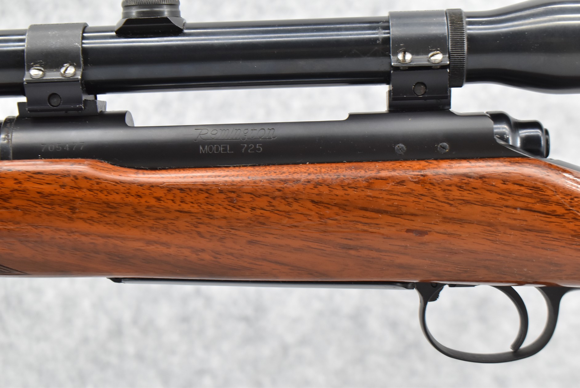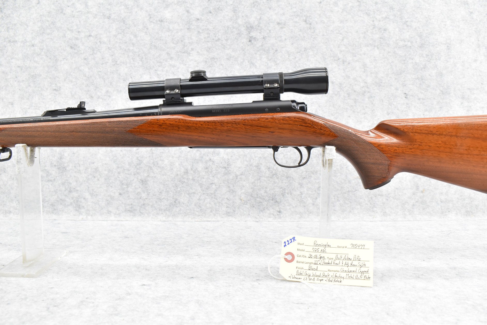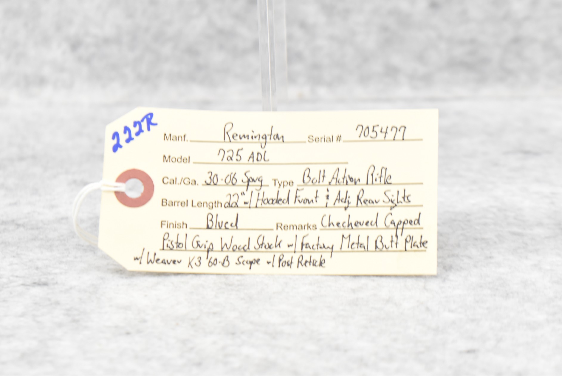222R. Remington – Mod. 725 ADL – 30-06 Sprg. Cal. Bolt Action Rifle – w/22” Barrel w/Hooded Front & Adj. Rear Sights – Blued Finish – w/Checkered Capped Pistol Grip Wood Stock w/Factory Medal Butt Plate – w/Weaver K3 60-B Scope w/Post Reticle
