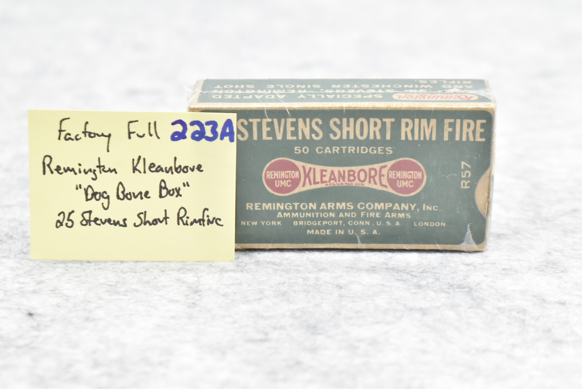 223A. Remington – Kleanbore 25 Stevens Short Rimfire Cal. “Dog Bone Box” BOA – FF