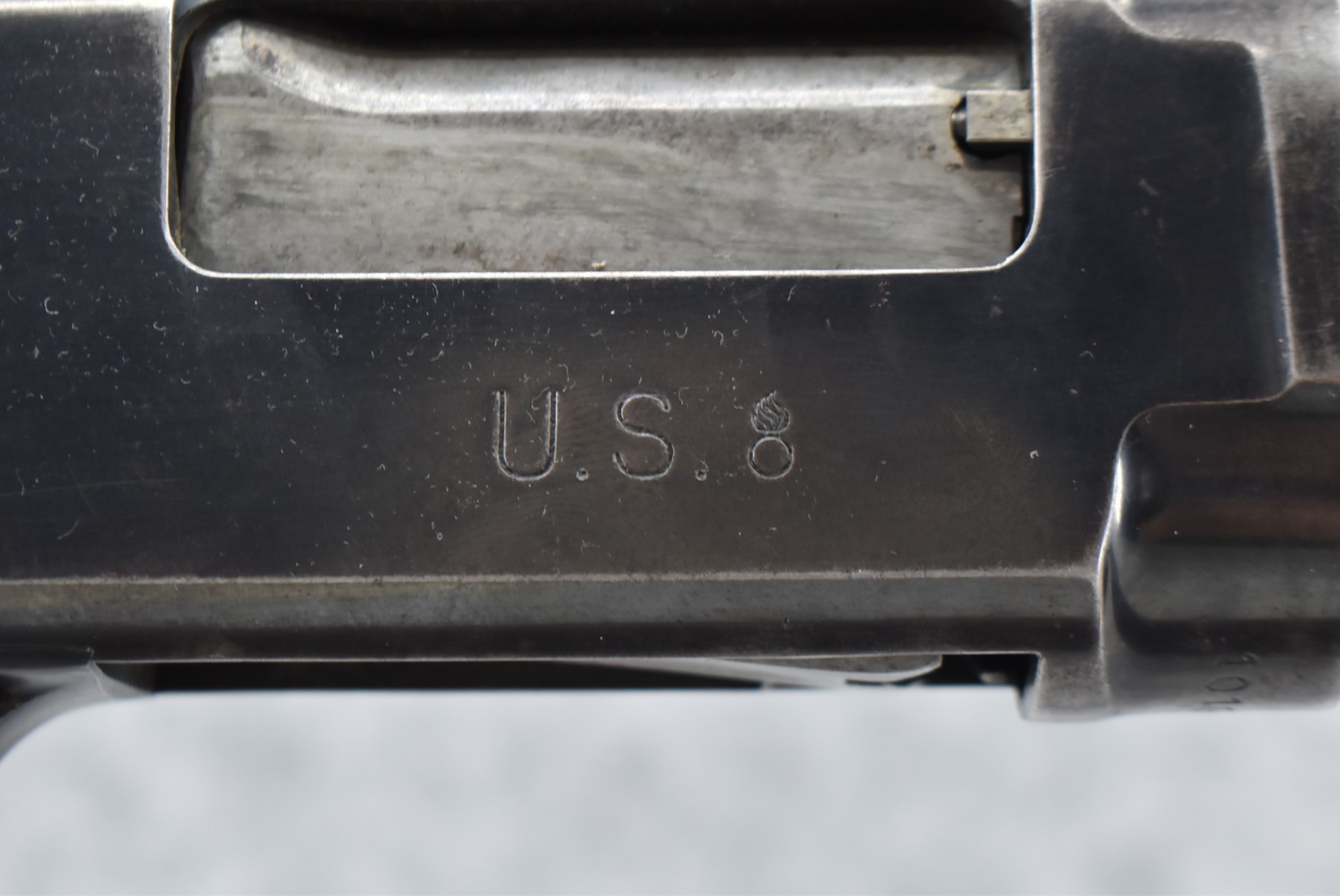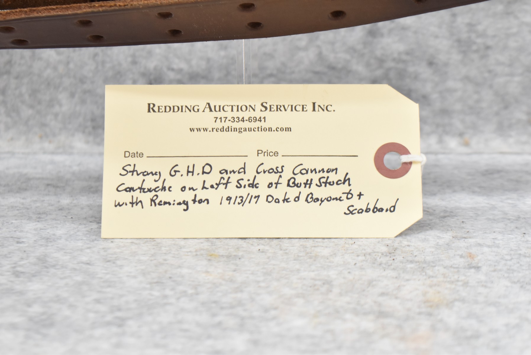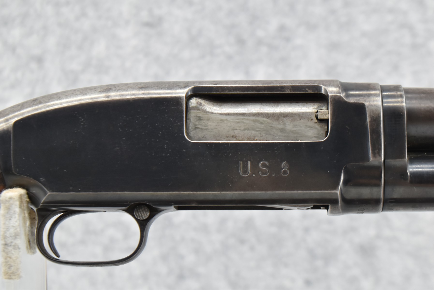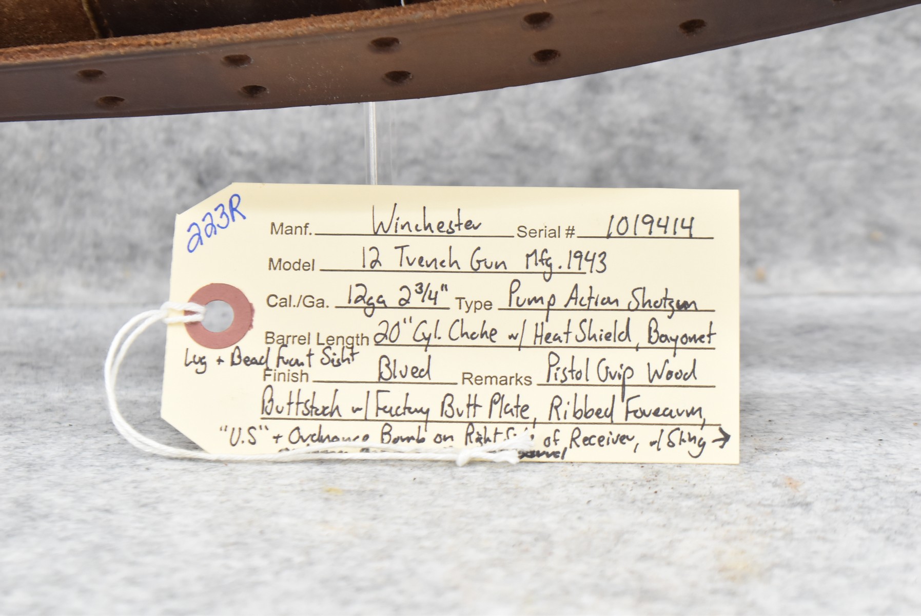 223R.     Winchester – Mod. 12 Trench Gun – 12ga. 2 ¾” Pump Action Shotgun – w/20” Cyl. Choked Barrel w/Bead Front Sight, Heat Shield & Bayonet Lug – Blued Finish – w/Pistol Grip Wood Butt Stock w/Factory Butt Plate & Ribbed Forearm – w/Strong “G.H.D” & Cross Cannon Cartouche on Left Side of Butt Stock – w/Sling – “U.S.” & Ordnance Bomb on Right Side or Receiver & Ordnance Bomb on Top of Barrel – w/Remington 1913/17 Dated Bayonet & Scabbard – Mfg. 1943