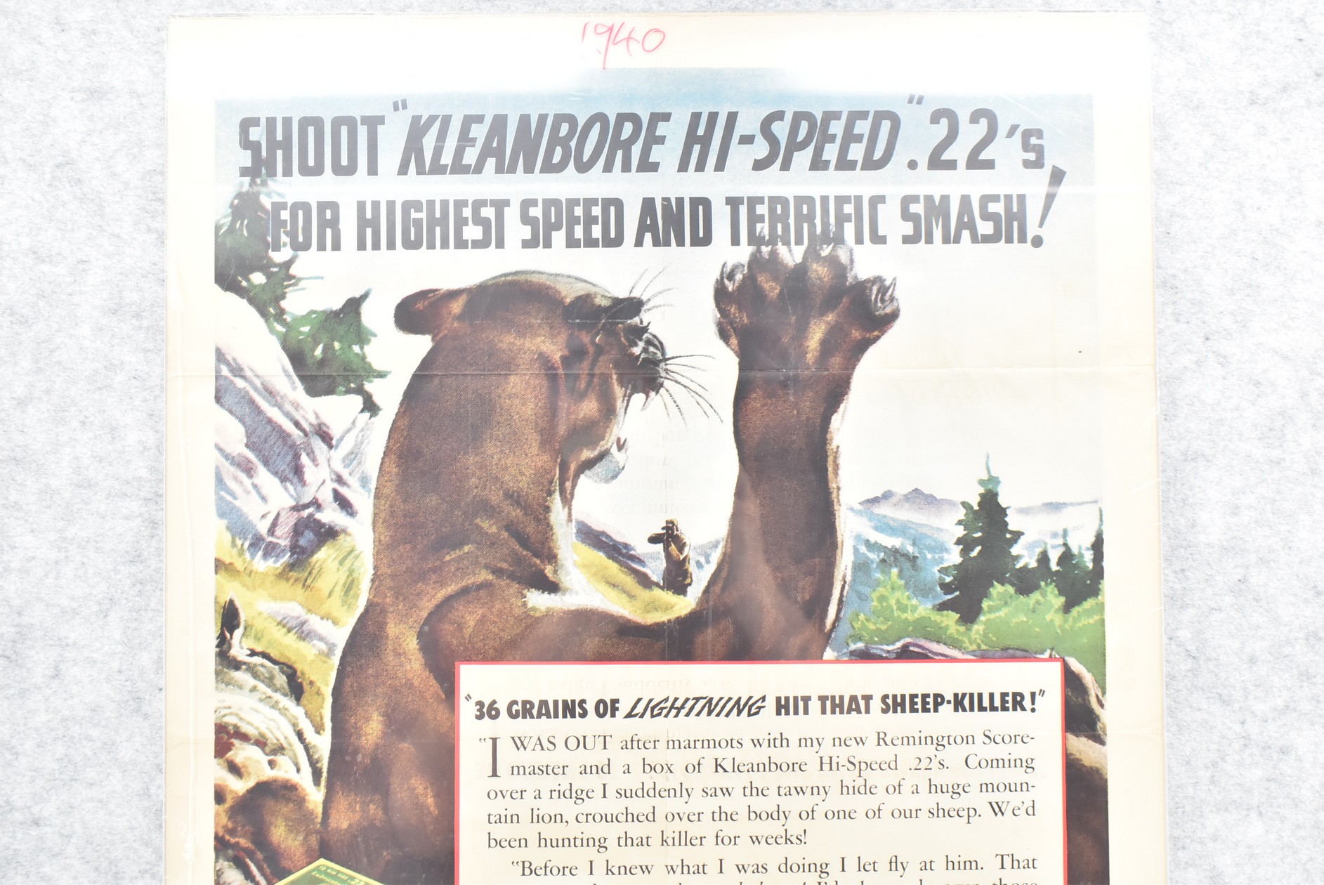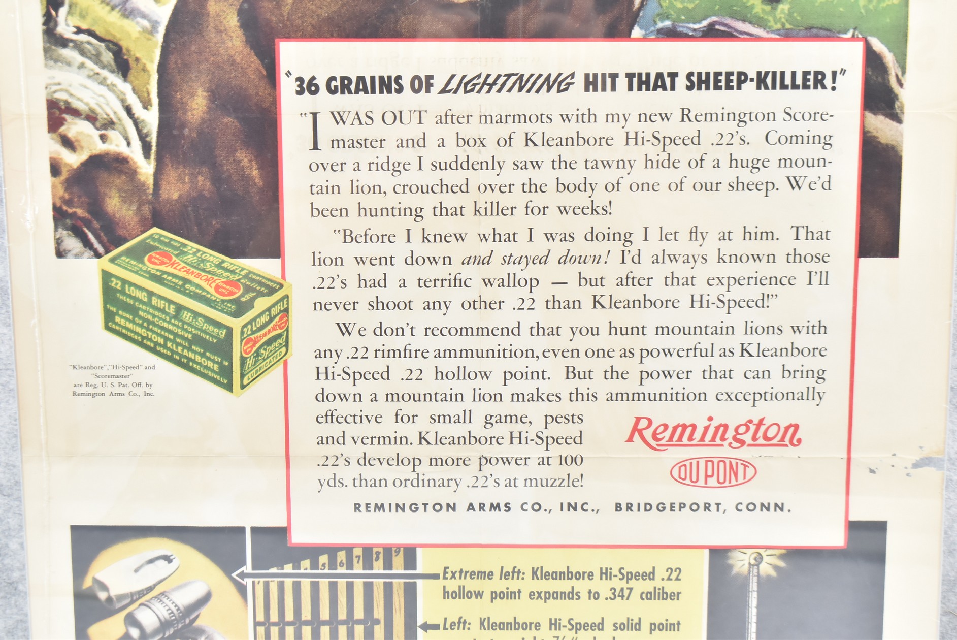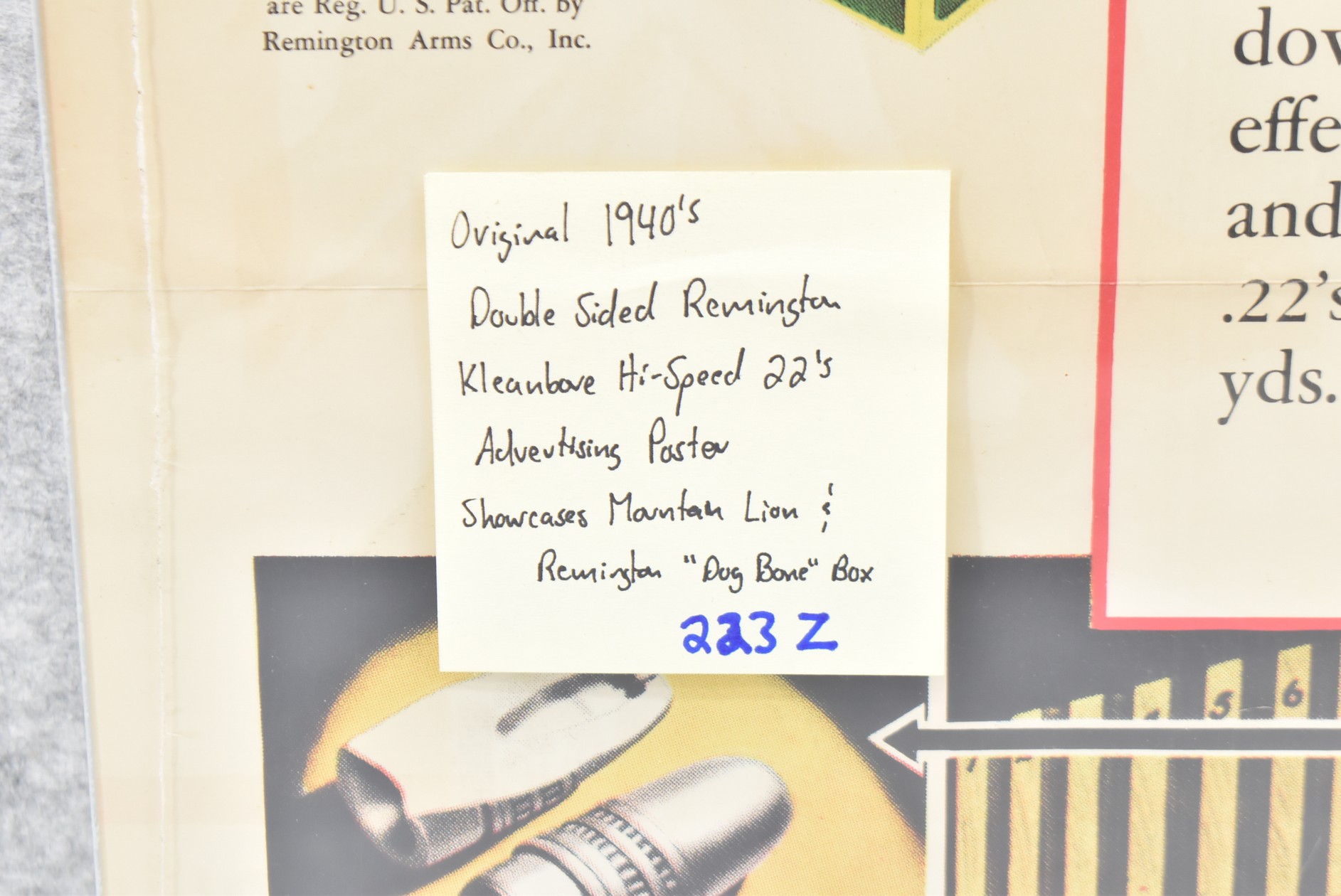 223Z. Original 1940’s Double Sided Remington Kleanbore Hi-Speed 22’s Advertising Poster – Showcases Mountain Lion & Remington “Dog Bone” Box