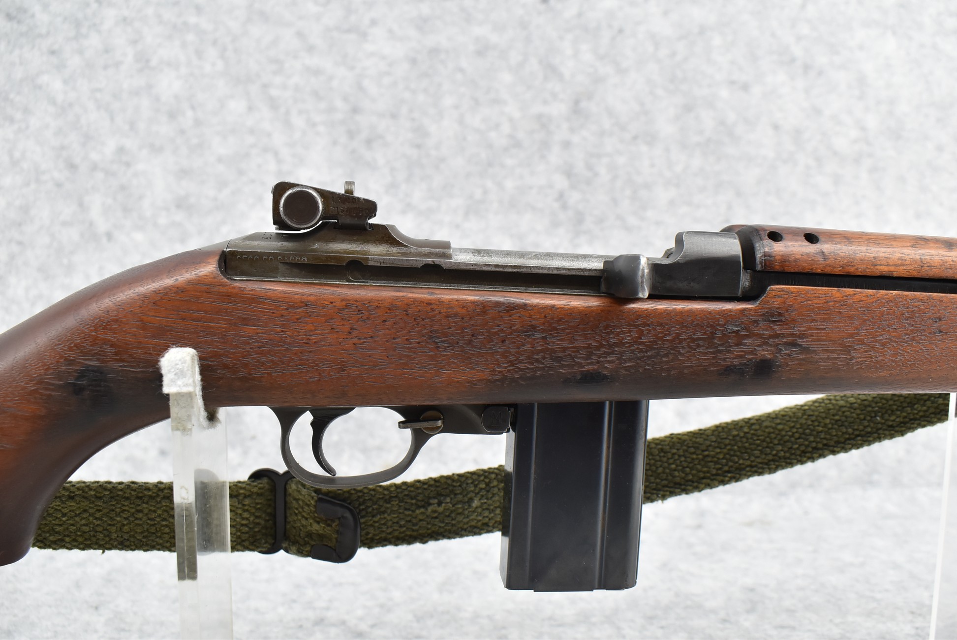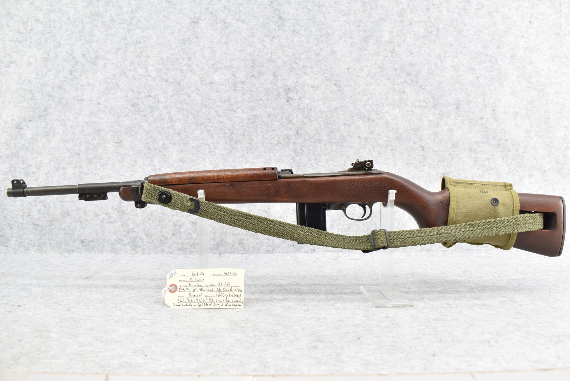 224R. Rock-Ola – Mod. M1 Carbine – 30 Carbine Cal. Semi-Auto Rifle – w/18” Rock-Ola Barrel w/18” Barrel w/Blade Front & Adj. Rear Peep Sights – Parkerized Finish – w/Pistol Grip Full Wood Stock w/Factory Metal Butt Plate – w/Sling & Oiler – w/Crossed Cannon Cartouche on Right Side of Stock – w/Three 15Rd Magazines w/U.S. Magazine Pouch