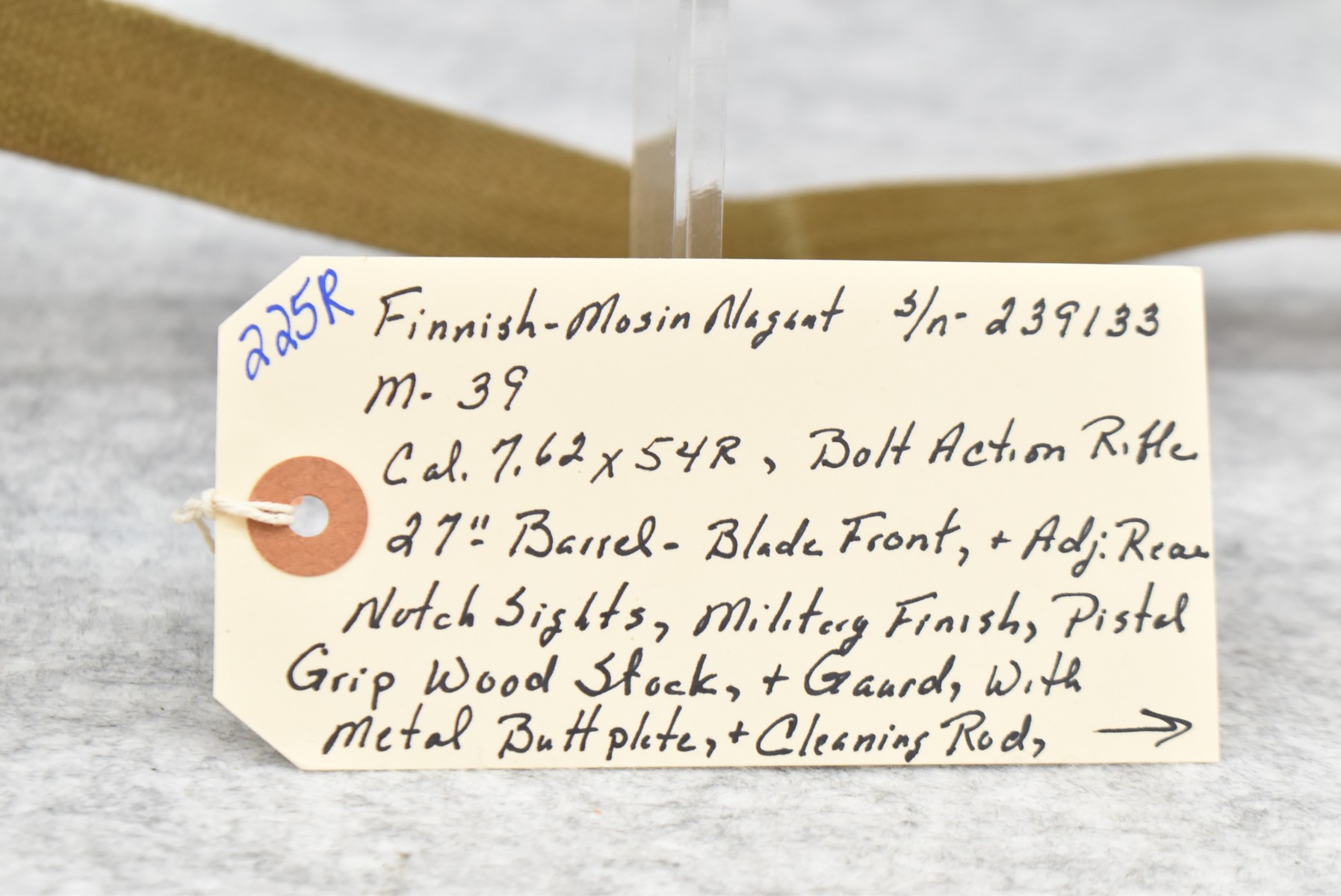 225R. Finnish Mosin-Nagant – Mod. 39 – 7.62x54R Cal. Bolt Action Rifle – w/27” Barrel w/Blade Front & Adj. Rear Notch Sights – Military Finish – w/Pistol Grip Wood Stocks w/Metal Butt Plate – w/Cleaning Rod – w/Military Sling