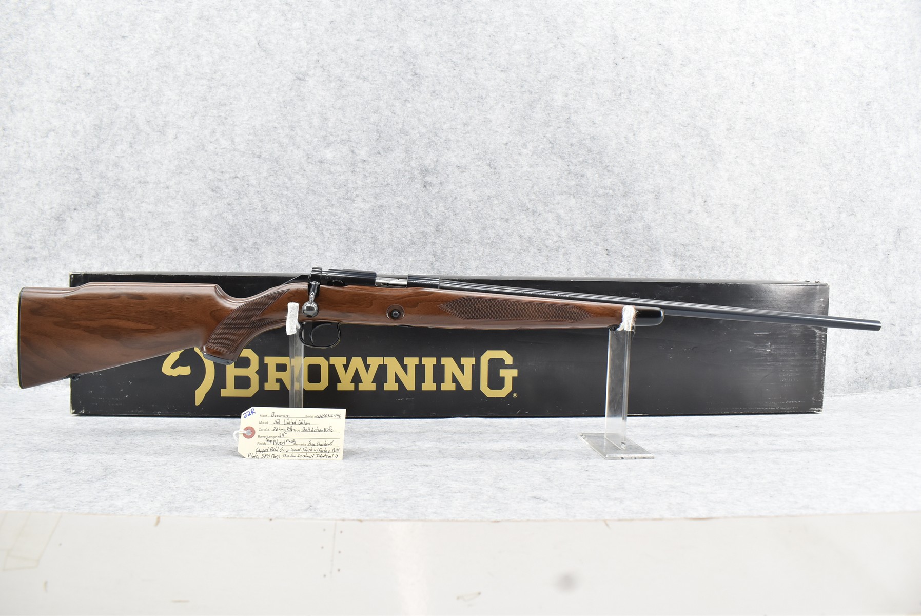 22R. Browning – Mod. 52 Limited Edition – 22 Long Rifle Cal. Bolt Action Rifle – w/24” Barrel – Deep Blued Finish – w/Fine Checkered Capped Pistol Grip Wood Stock w/Factory Butt Plate – w/5Rd Mag – This Gun is Almost Identical to the Original Winchester 52C Sporter – Unfired w/Factory 2pc. Box & Manuals – Only 5,000 Mfg. Between 1991-1992