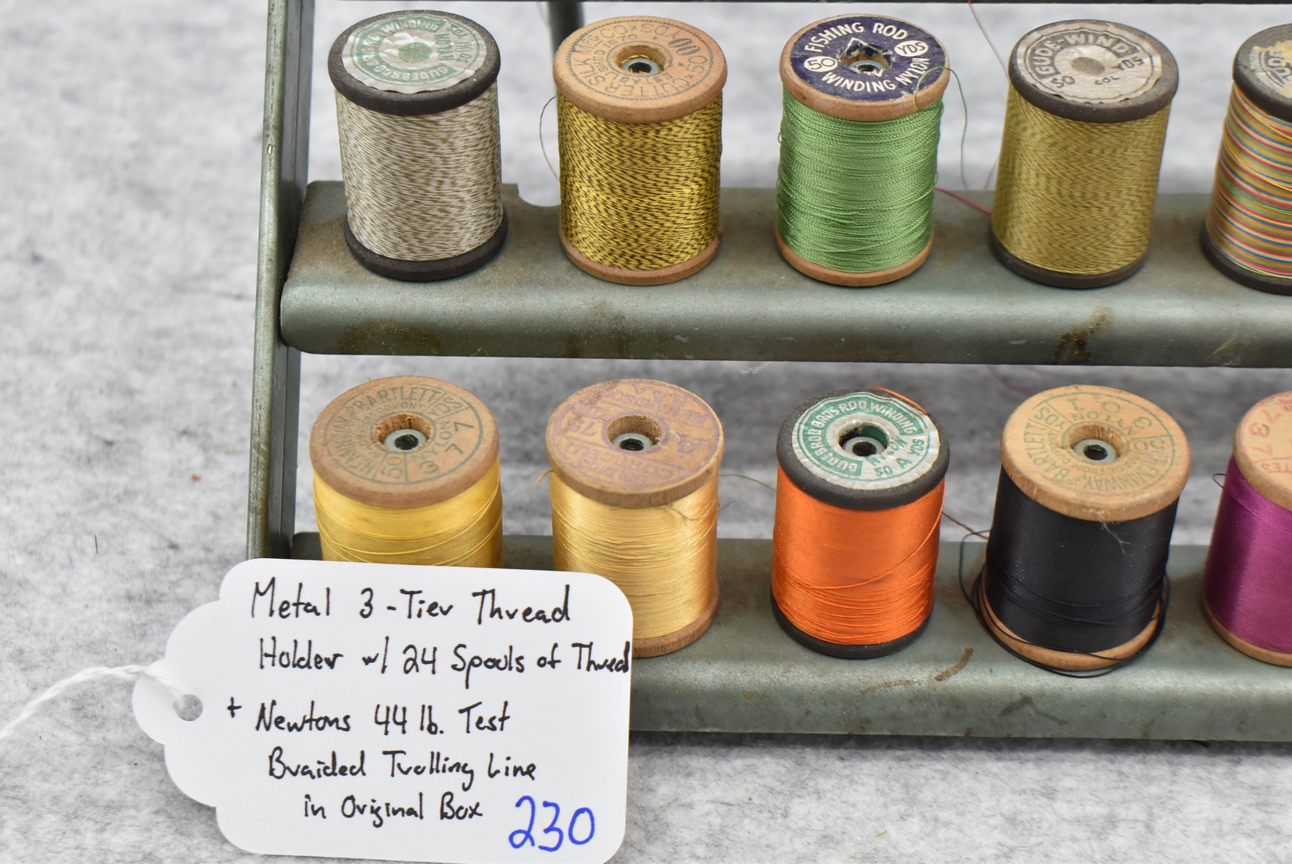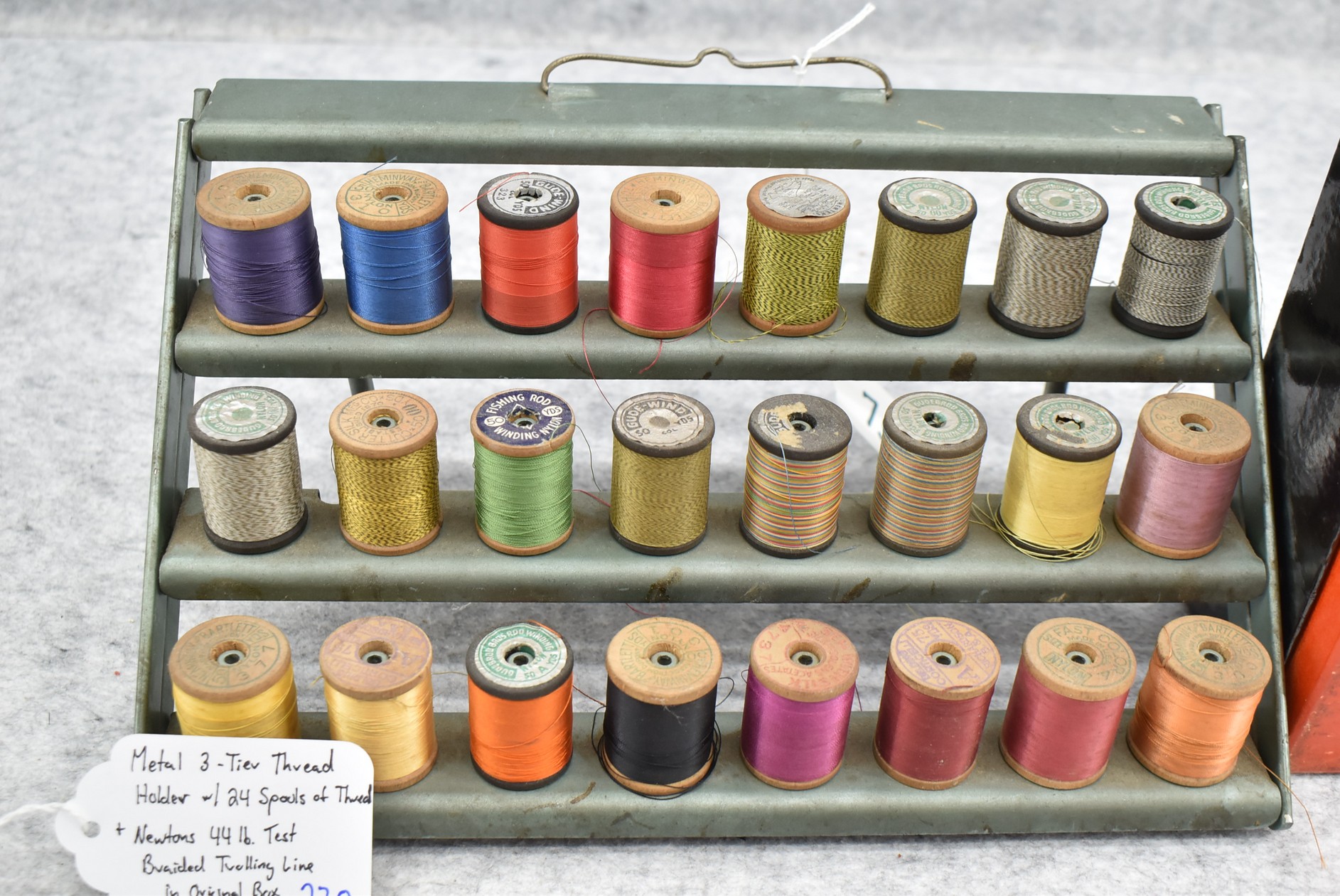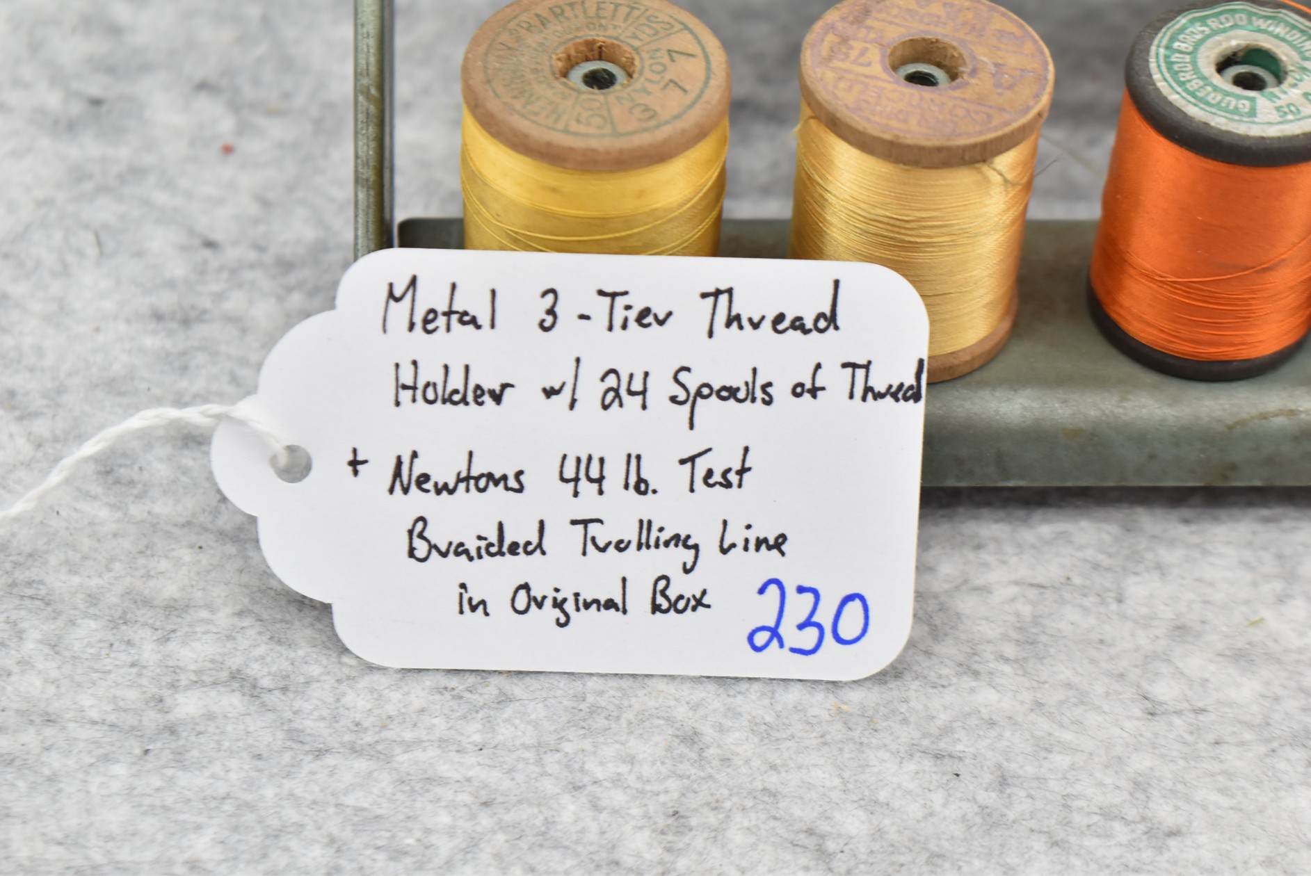 230. Metal 3-Tier Thread Holder w/24 Spools of Thread & Newton 44lb. Test Braided Trolling Line in Original Box