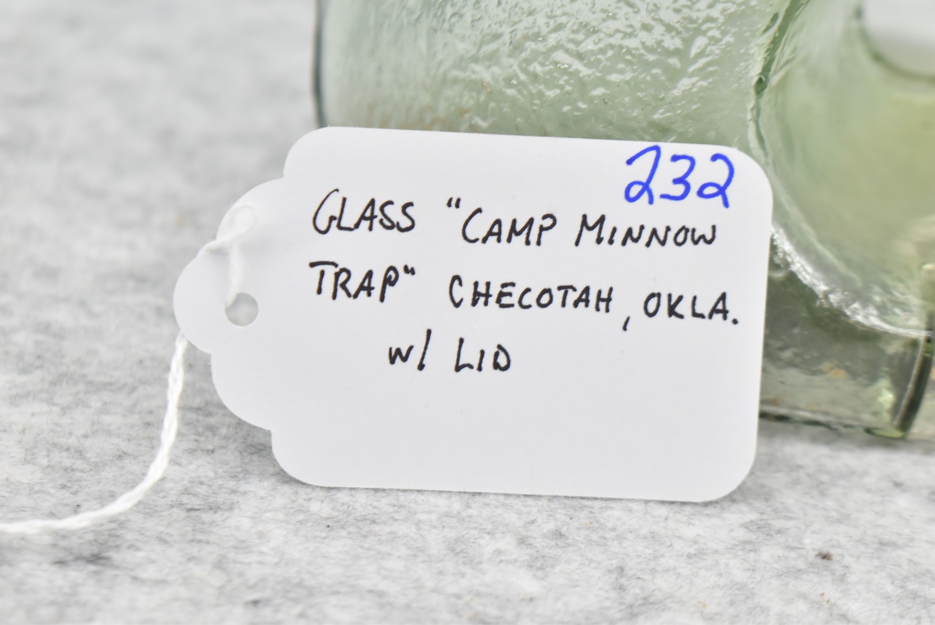 232. Glass “Camp Minnow Trap” Checotah, Okla. – w/Lid