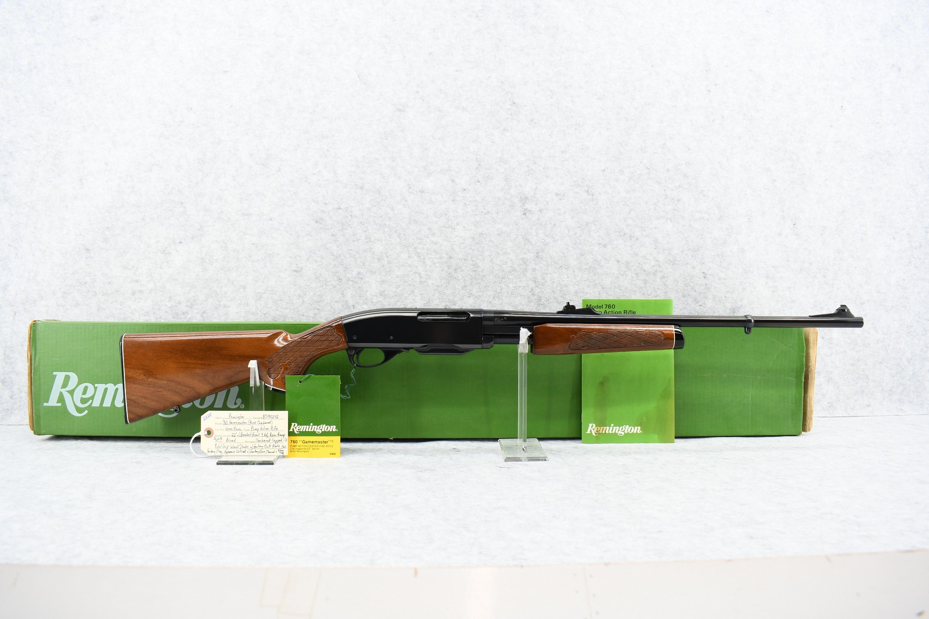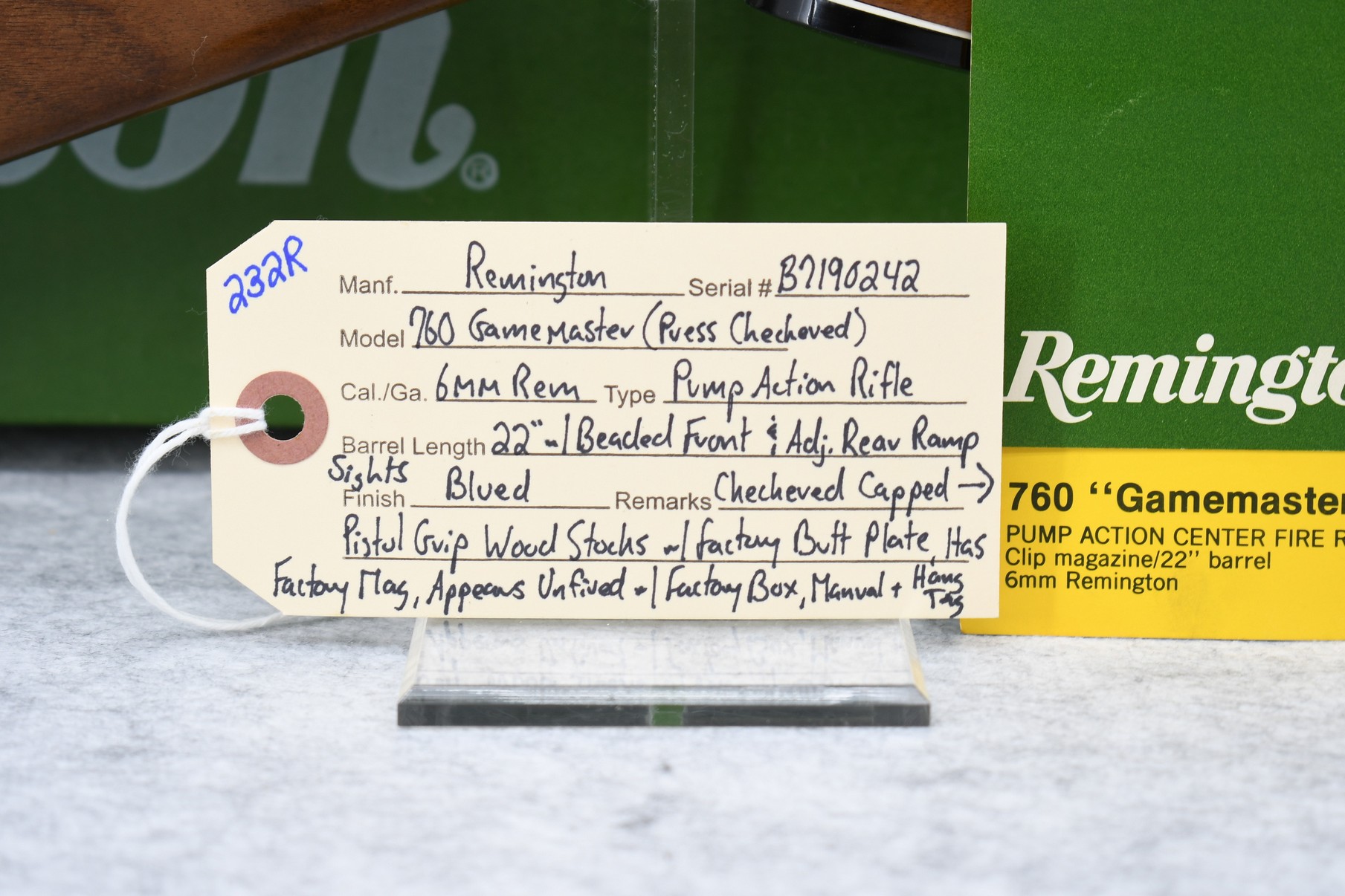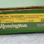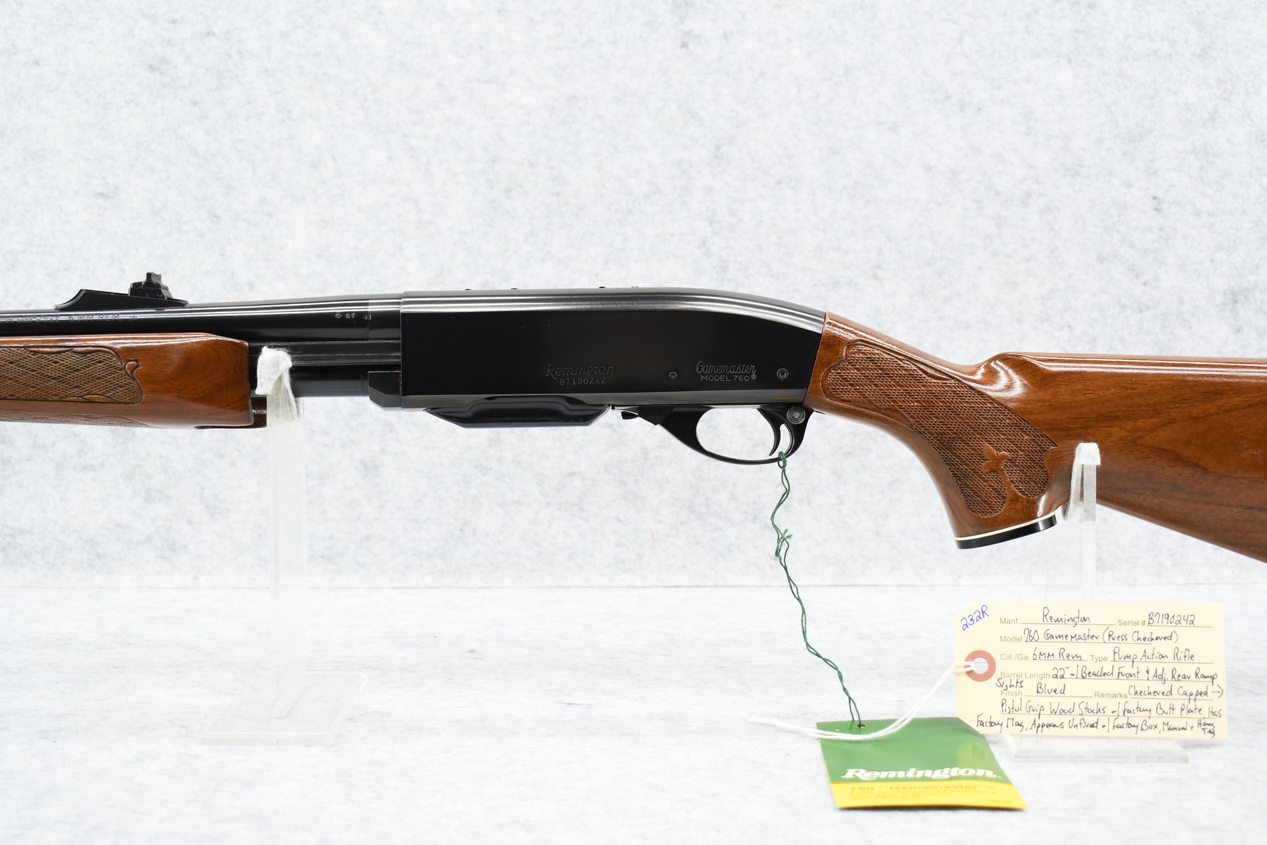 232R. Remington – Mod. 760 Gamemaster (Press Checkered) – 6mm Rem. Cal. Pump Action Rifle – w/22” Barrel w/Beaded Front & Adj. Rear Ramp Sights – Blued Finish – w/Checkered Capped Pistol Grip Wood Stocks w/Factory Butt Plate – w/Factory Mag – Unfired w/Factory Box, Manual & Hang Tag