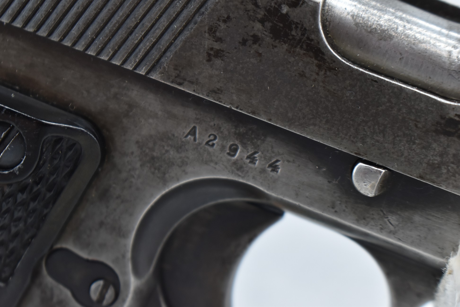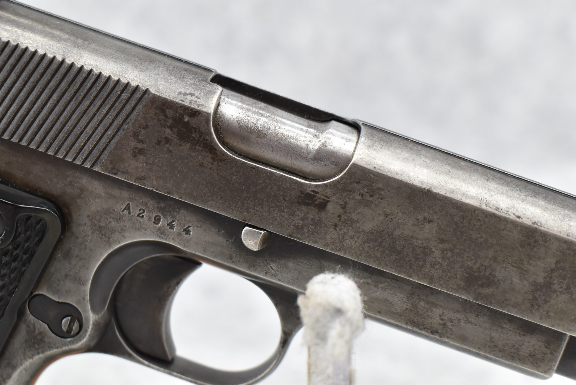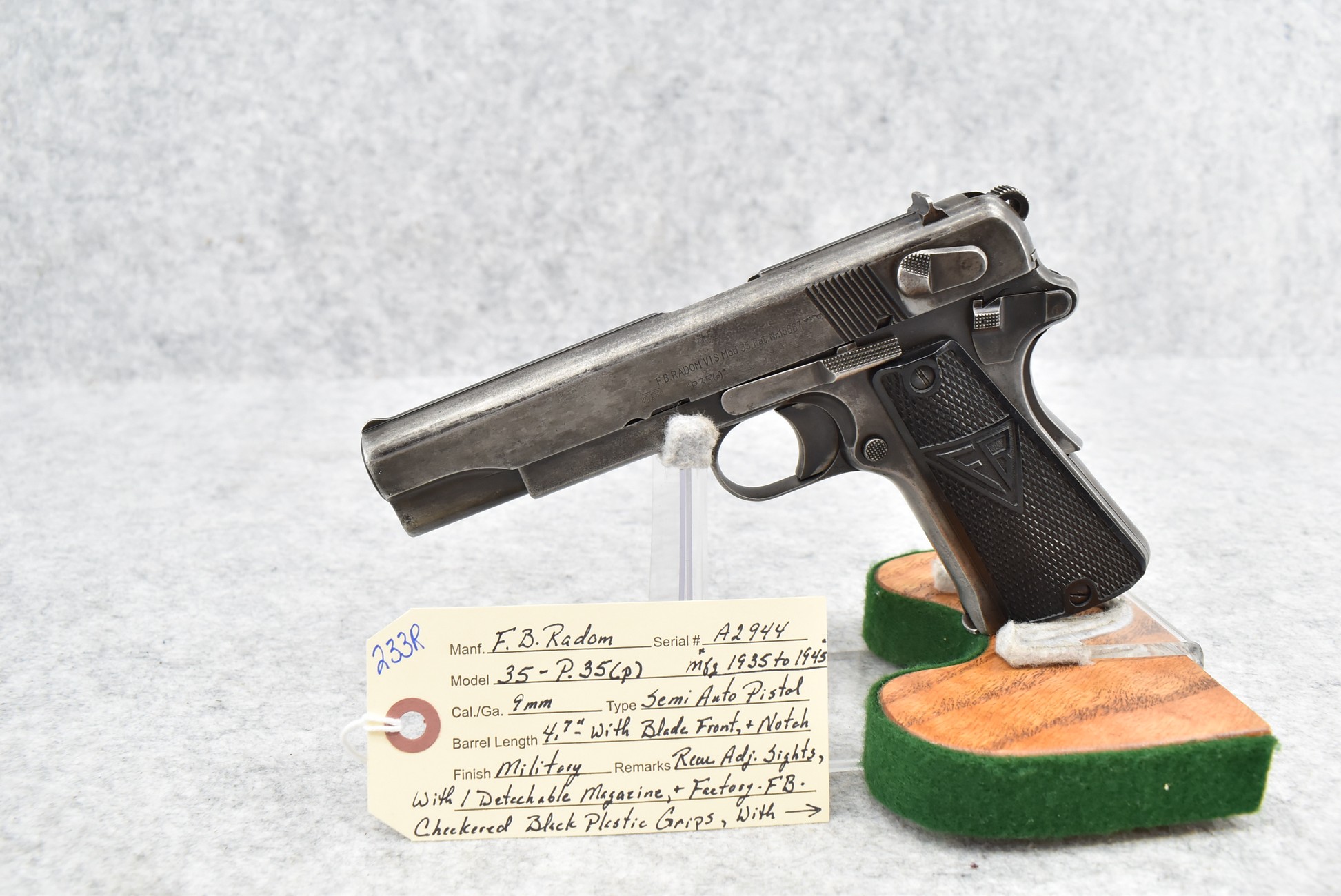 233R. F.B. Radom – Mod. P.35 – 9mm Cal. Semi-Auto Pistol – w/4.7” Barrel w/Blade Front & Notch Rear Adj. Sights – Military Finish – w/Factory F.B. Checkered Black Plastic Grips – w/Detachable Magazine – w/Several German Proof Stamps – Mfg. Between 1935-1945