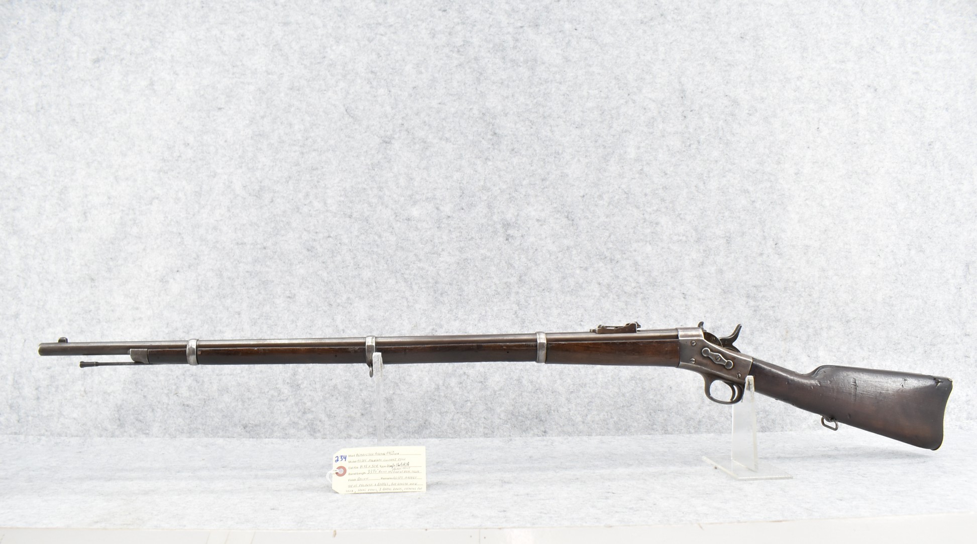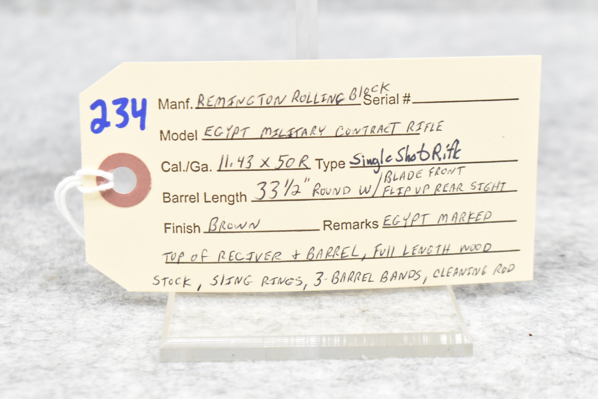234. Remington – Mod. Rolling Block – Egyptian Military Contract Rifle – 11.43x50R Cal. Single Shot Rifle – w/33 ½” Round Barrel w/Blade Front & Flip Up Rear Sights – Brown Finish – w/Full Length Wood Stock Held on by 3 Barrels Bands – w/Sling Rings – w/Cleaning Rod – Egypt Marked on Top of Receiver & Barrel