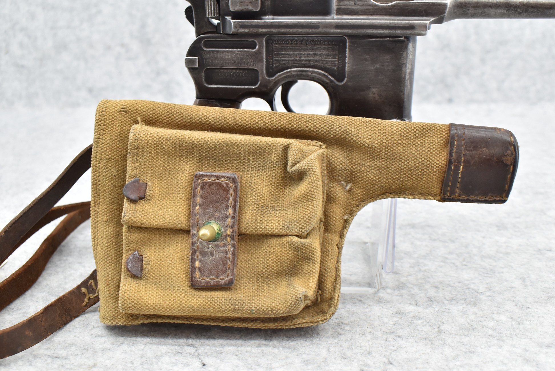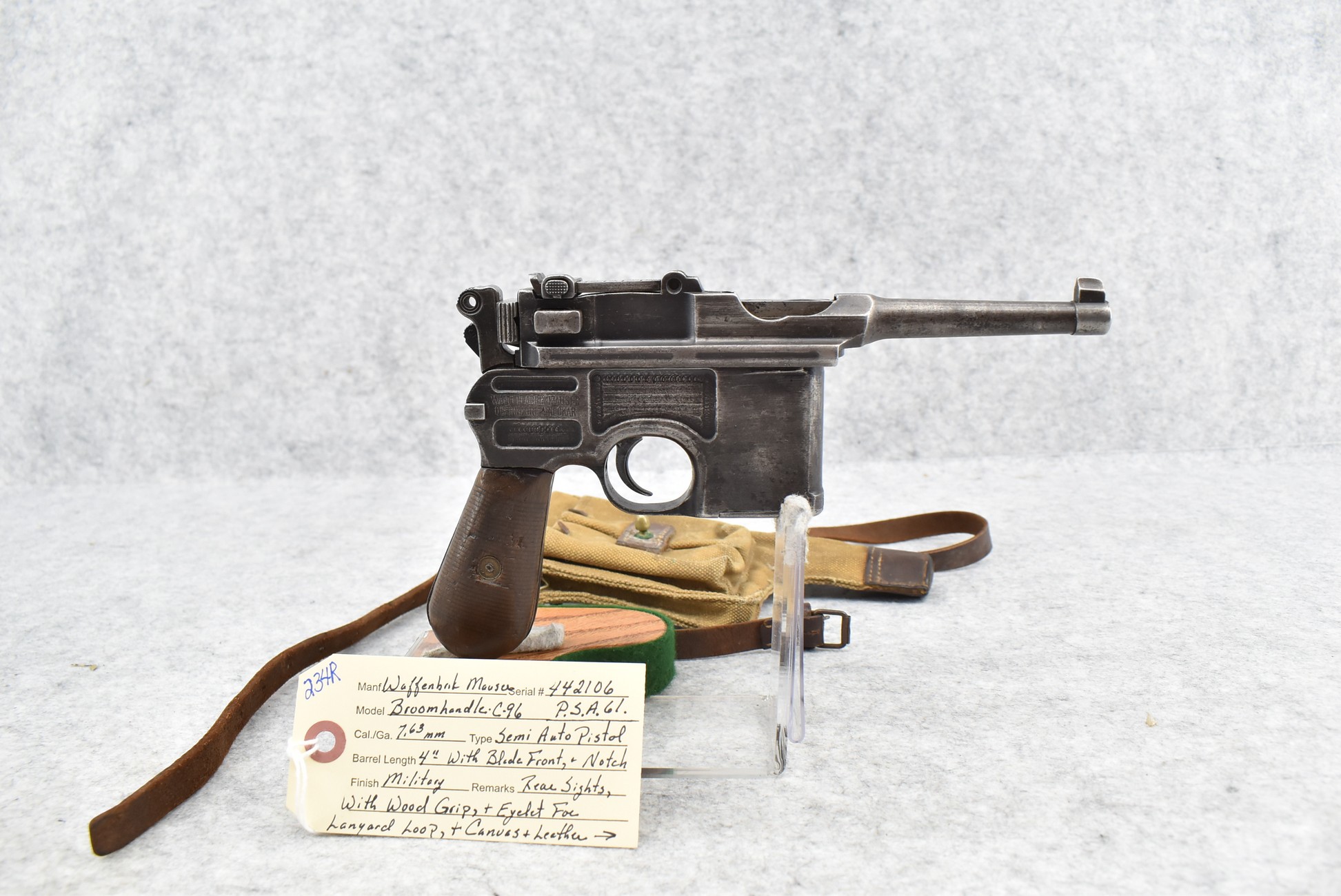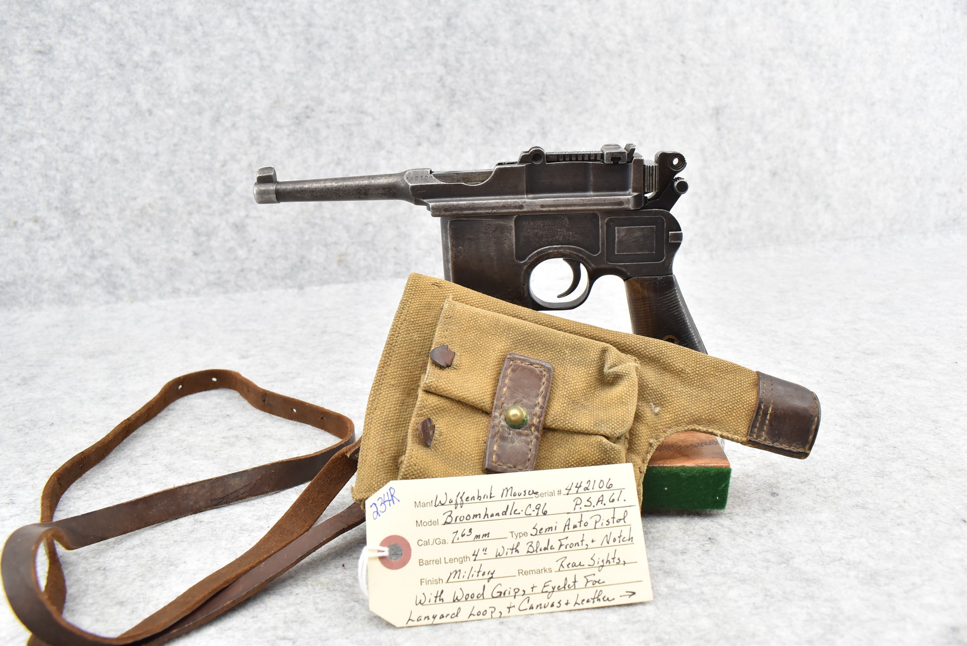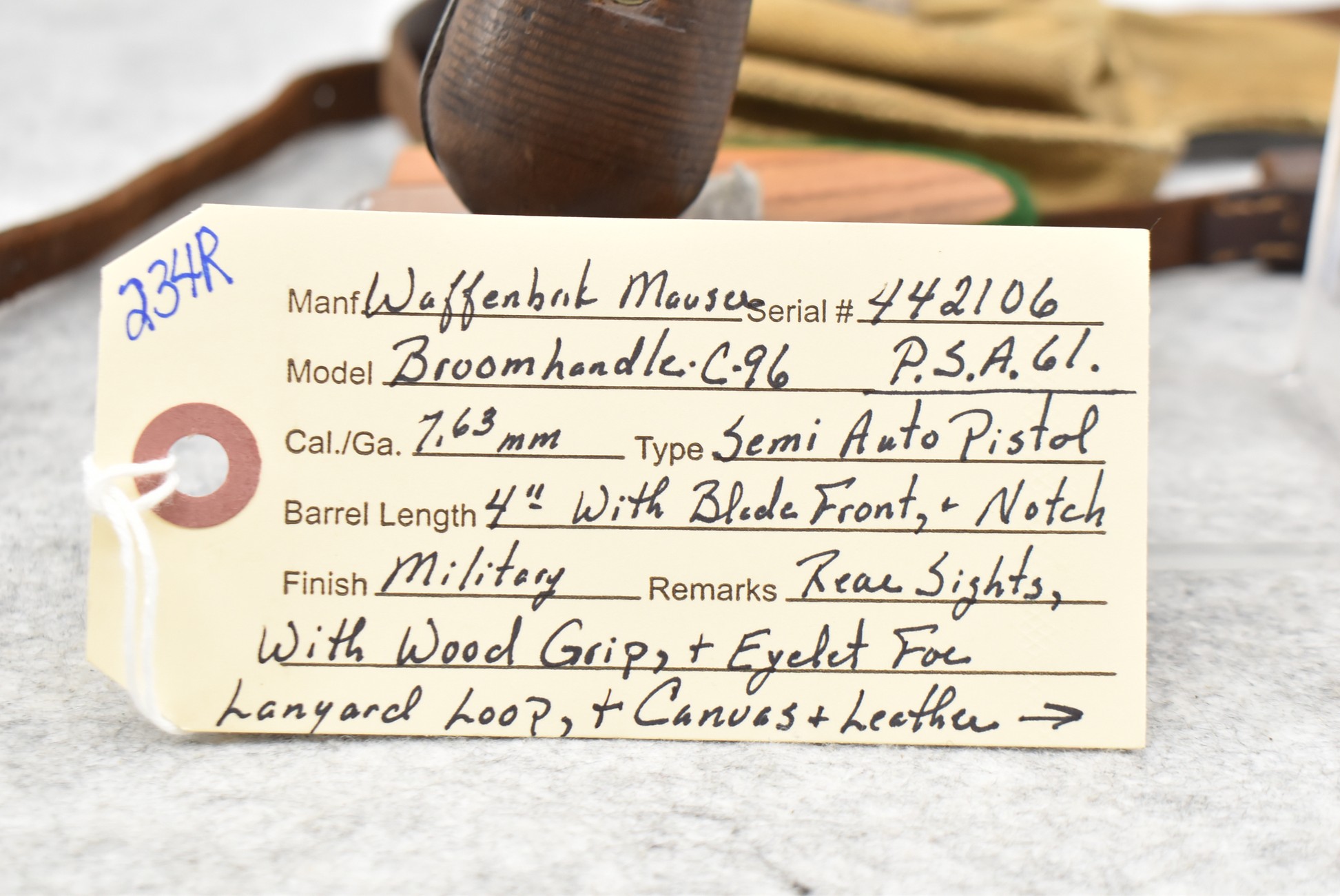 234R. Waffenbrik Mauser – Mod. Broomhandle C-96 – 7.63mm Cal. Semi-Auto Pistol – w/4” Barrel w/Blade Front & Notch Rear Sights – Military Finish – w/Wood Grip & Eyelet for Lanyard Loop – Unit Marked “P.S.A. 61” on Front of Grip Strap – w/Canvas & Leather Holster