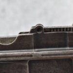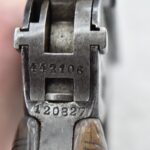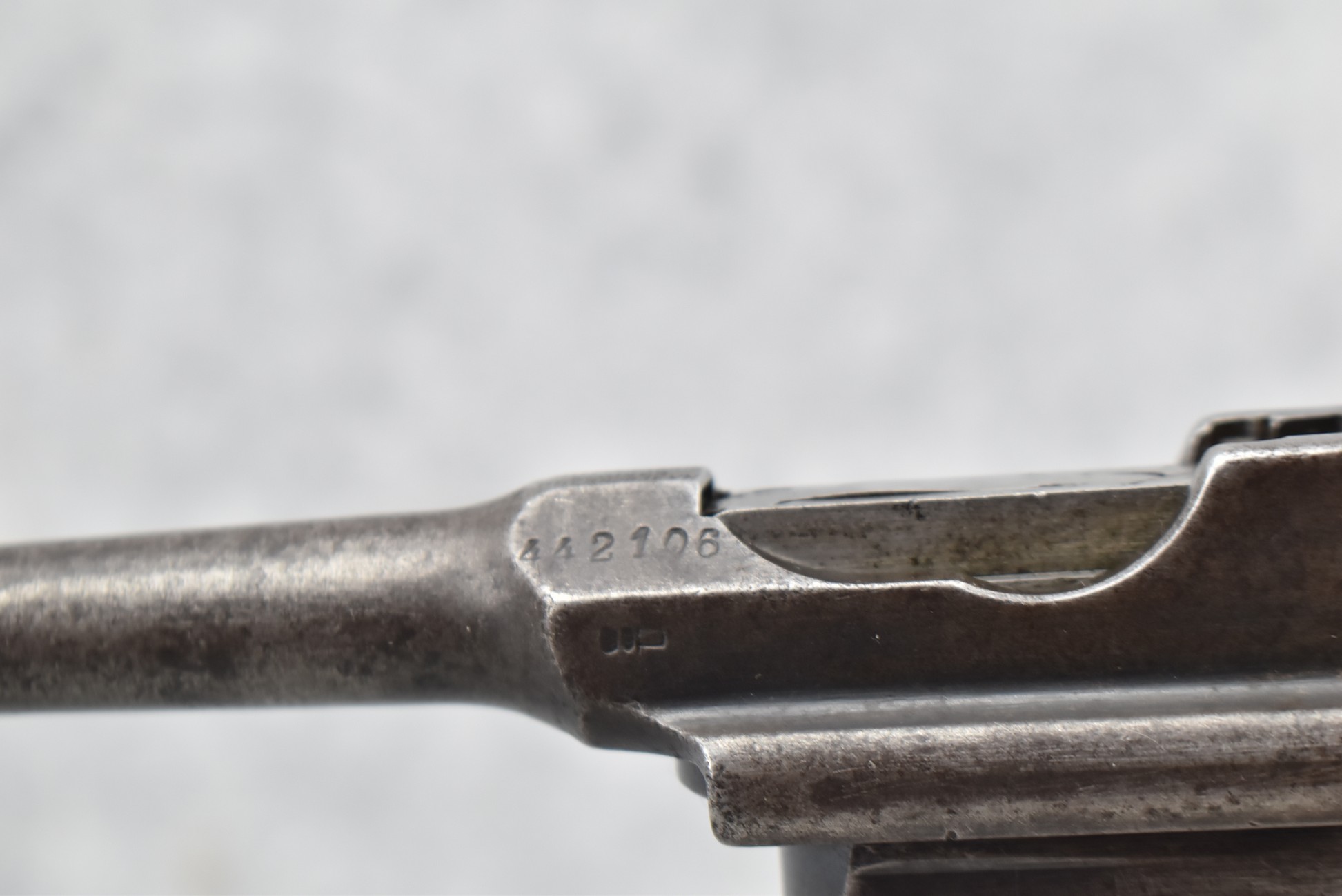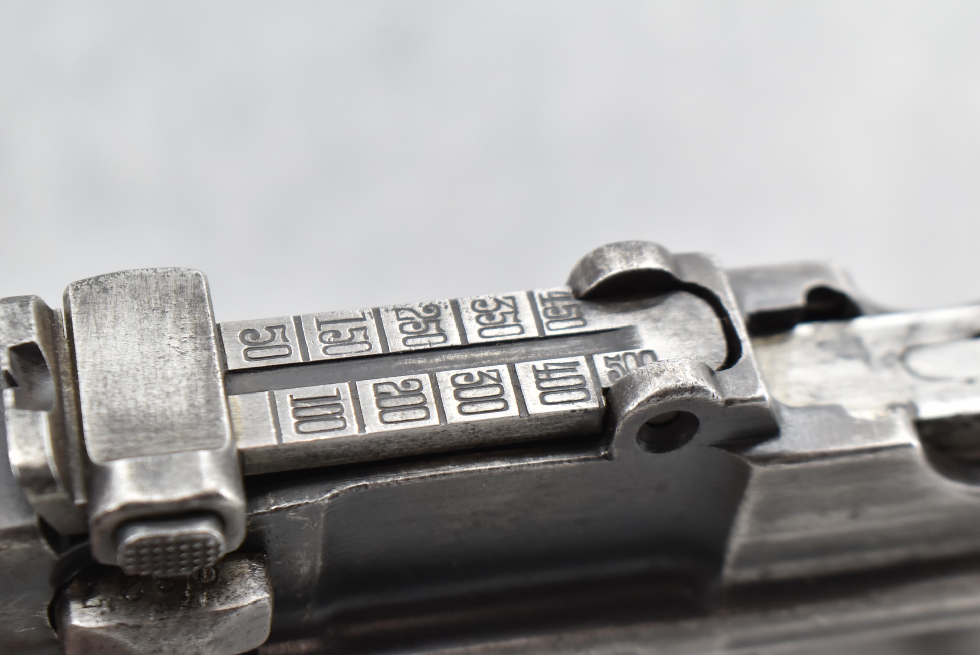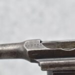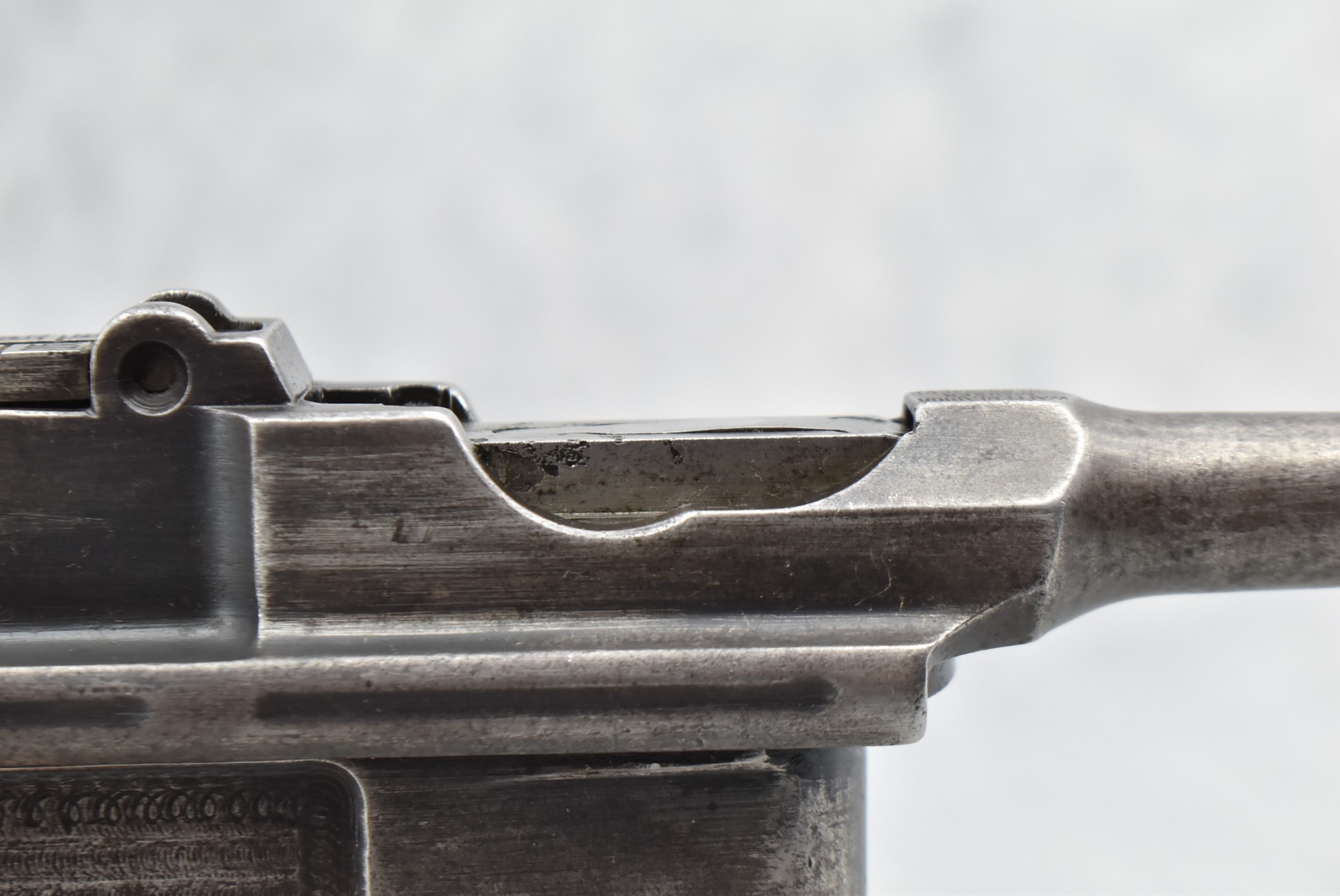 234R. Waffenbrik Mauser – Mod. Broomhandle C-96 – 7.63mm Cal. Semi-Auto Pistol – w/4” Barrel w/Blade Front & Notch Rear Sights – Military Finish – w/Wood Grip & Eyelet for Lanyard Loop – Unit Marked “P.S.A. 61” on Front of Grip Strap – w/Canvas & Leather Holster