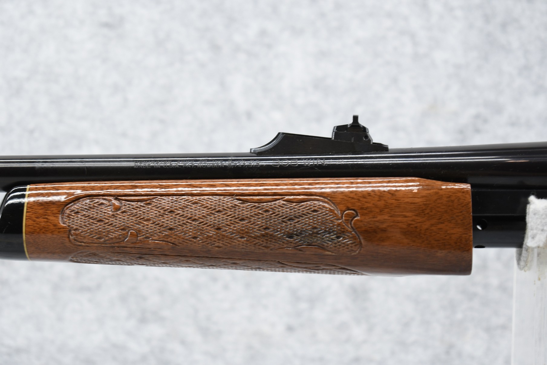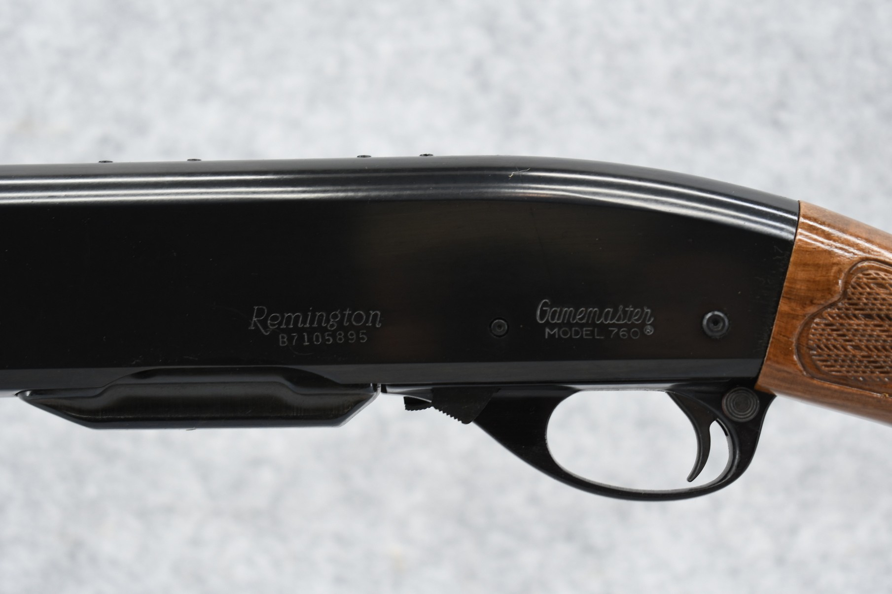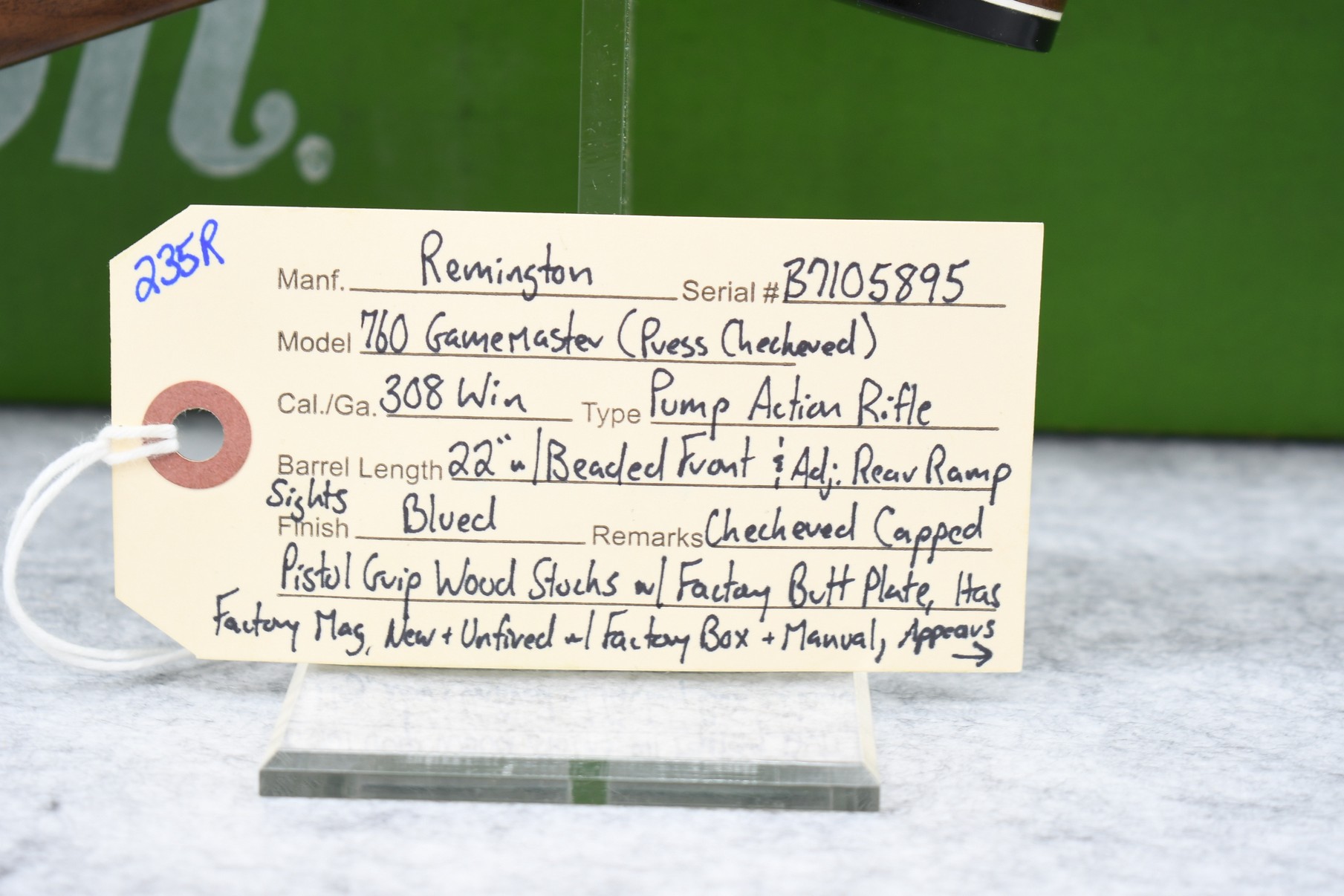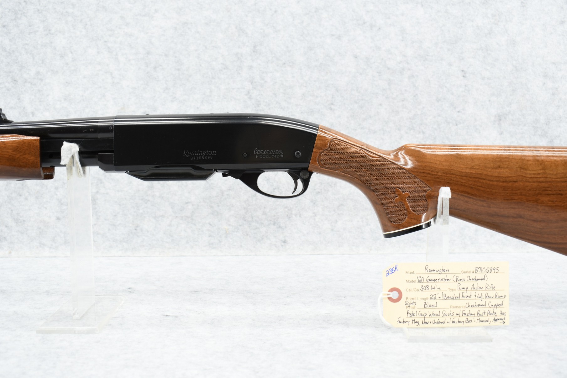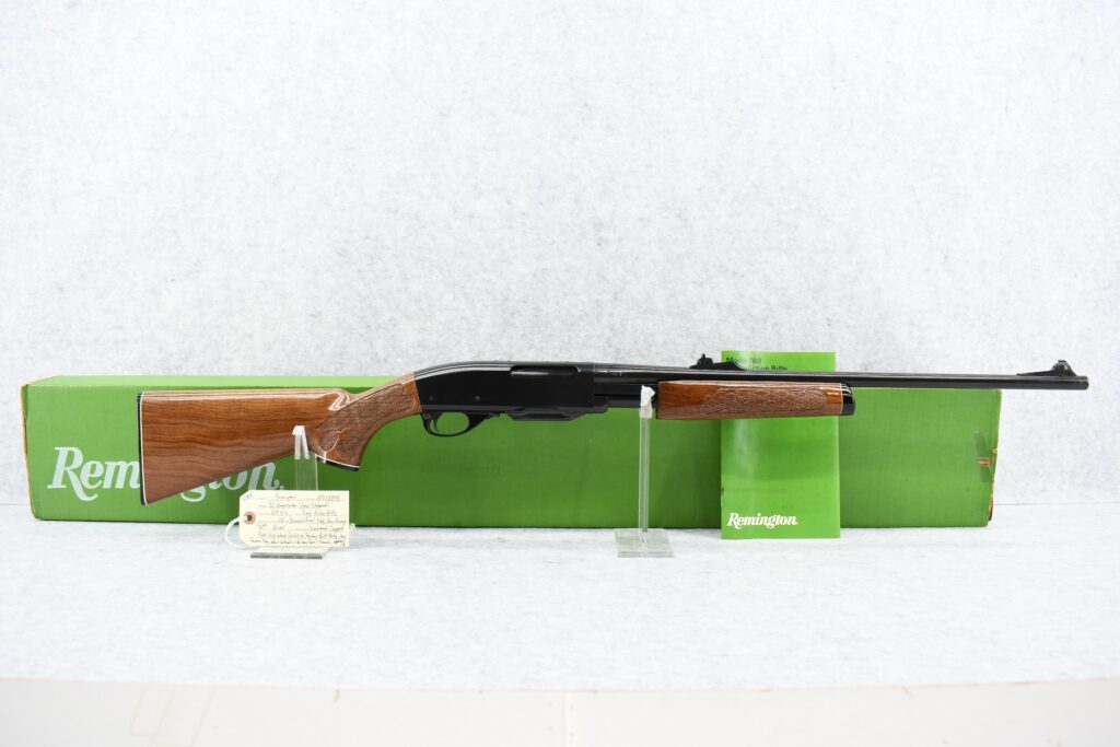 235R. Remington – Mod. 760 Gamemaster (Press Checkered) – 308 Win. Cal. Pump Action Rifle – w/22” Barrel w/Beaded Front & Adj. Rear Ramp Sights – Blued Finish – w/Checkered Capped Pistol Grip Wood Stocks w/Factory Butt Plate – w/Factory Mag – Unfired w/Factory Box & Manual, Appears Non-Matching Box, Label Has Deteriorated