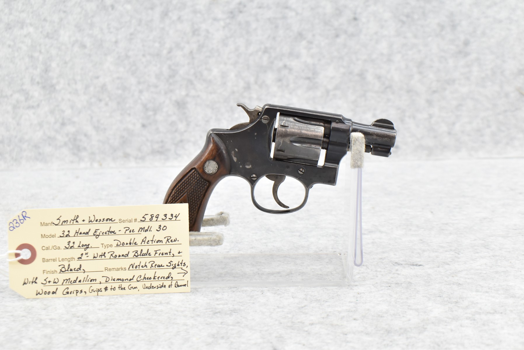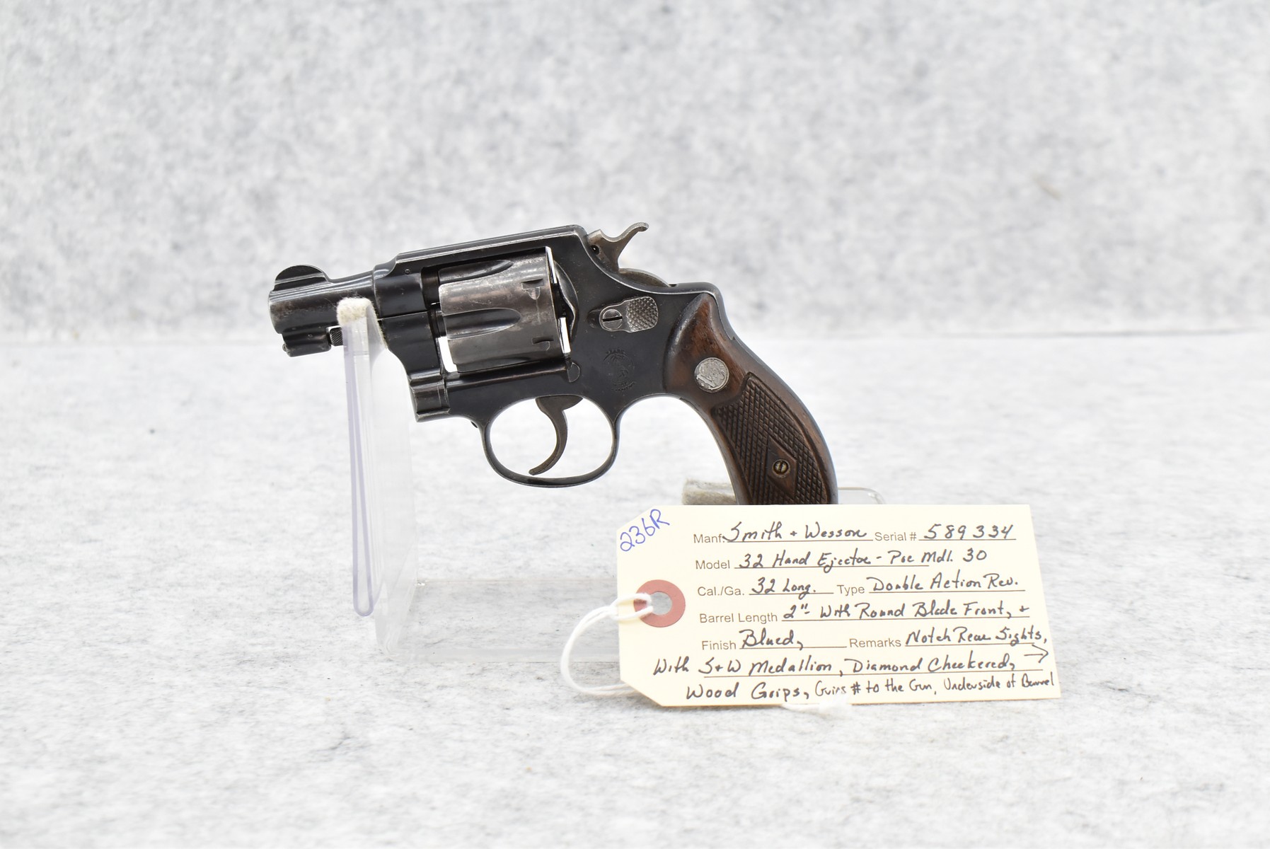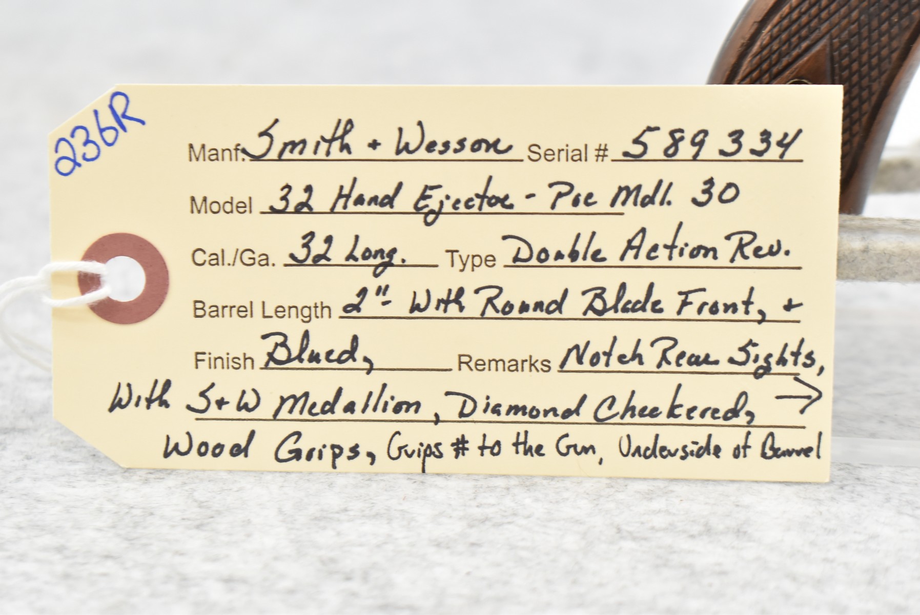 236R. Smith & Wesson – Mod. 32 Hand Ejector-Pre Model 30 – 32 Long Cal. Double Action Revolver – w/2” Barrel w/Round Blade Front & Notch Rear Sights – Blued Finish – w/S&W Medallion Diamond Checkered Wood Grips – Grips # to the Gun, Underside of Barrel, Back of Cylinder & Butt Numbers All Match!