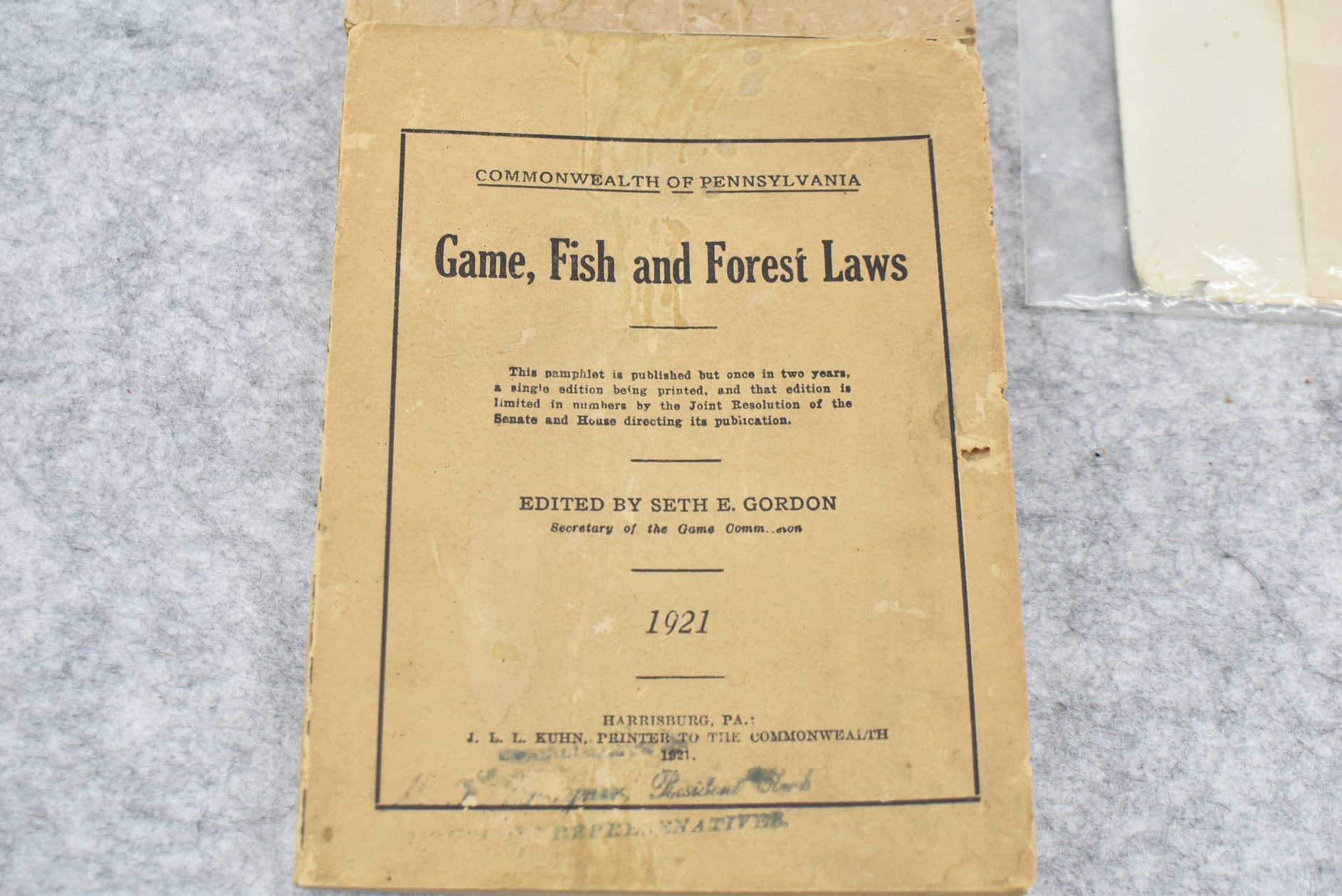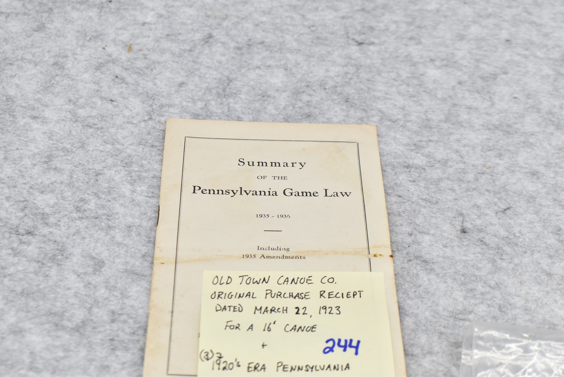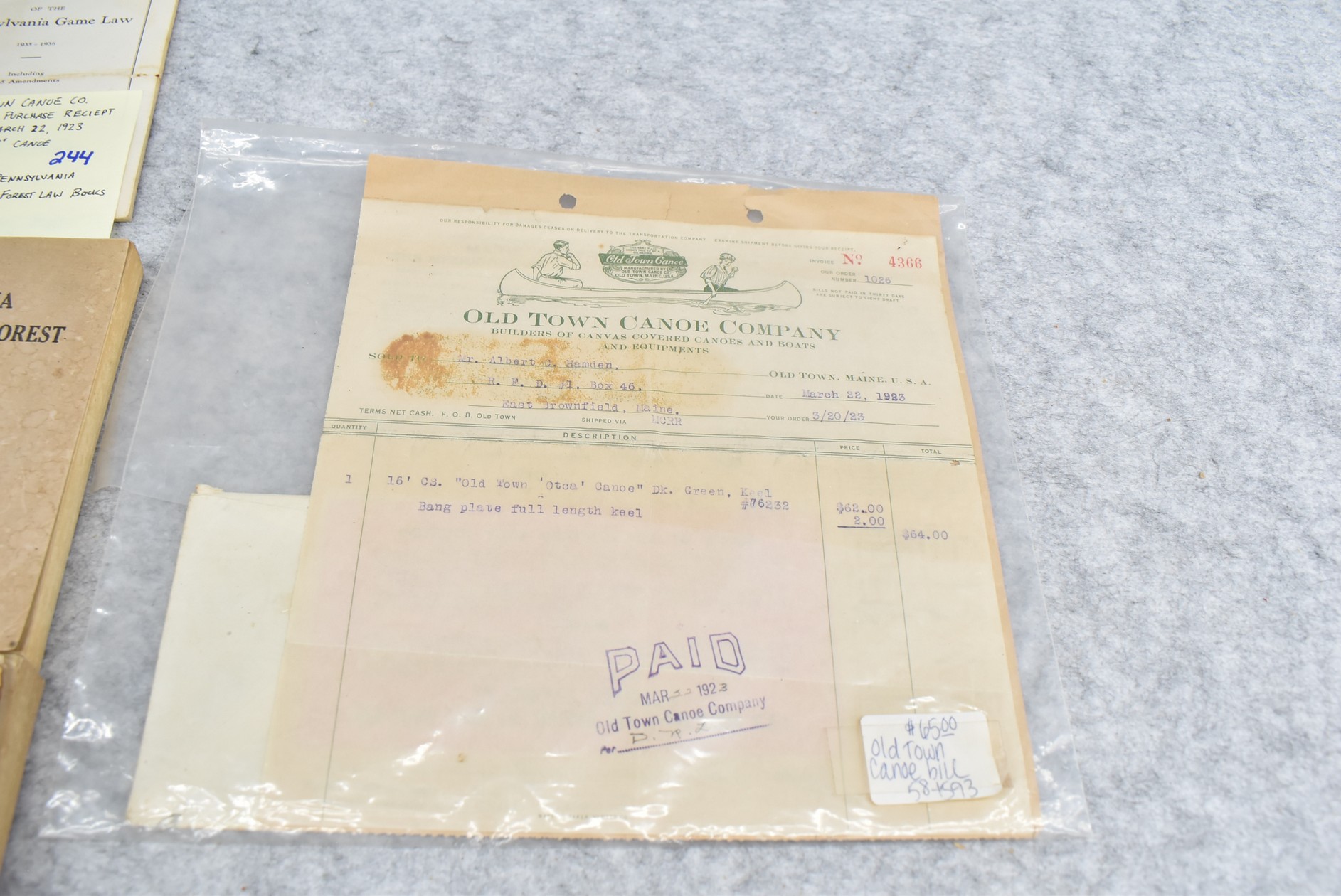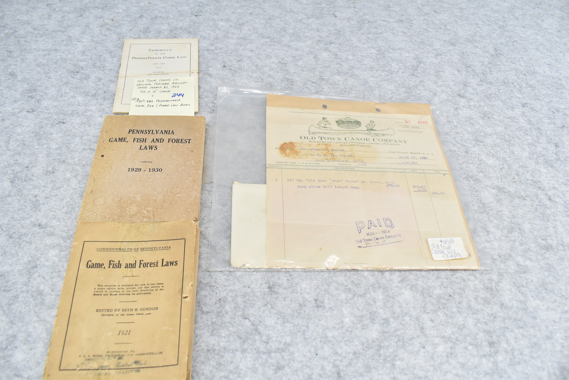 244. Lot Including: 1) Old Town Canoe Co. Original Purchase Receipt Dated March 22, 1923 for a 16’ Canoe. 2) Three 1920’s Era PA Game, Fish & Forest Law Books