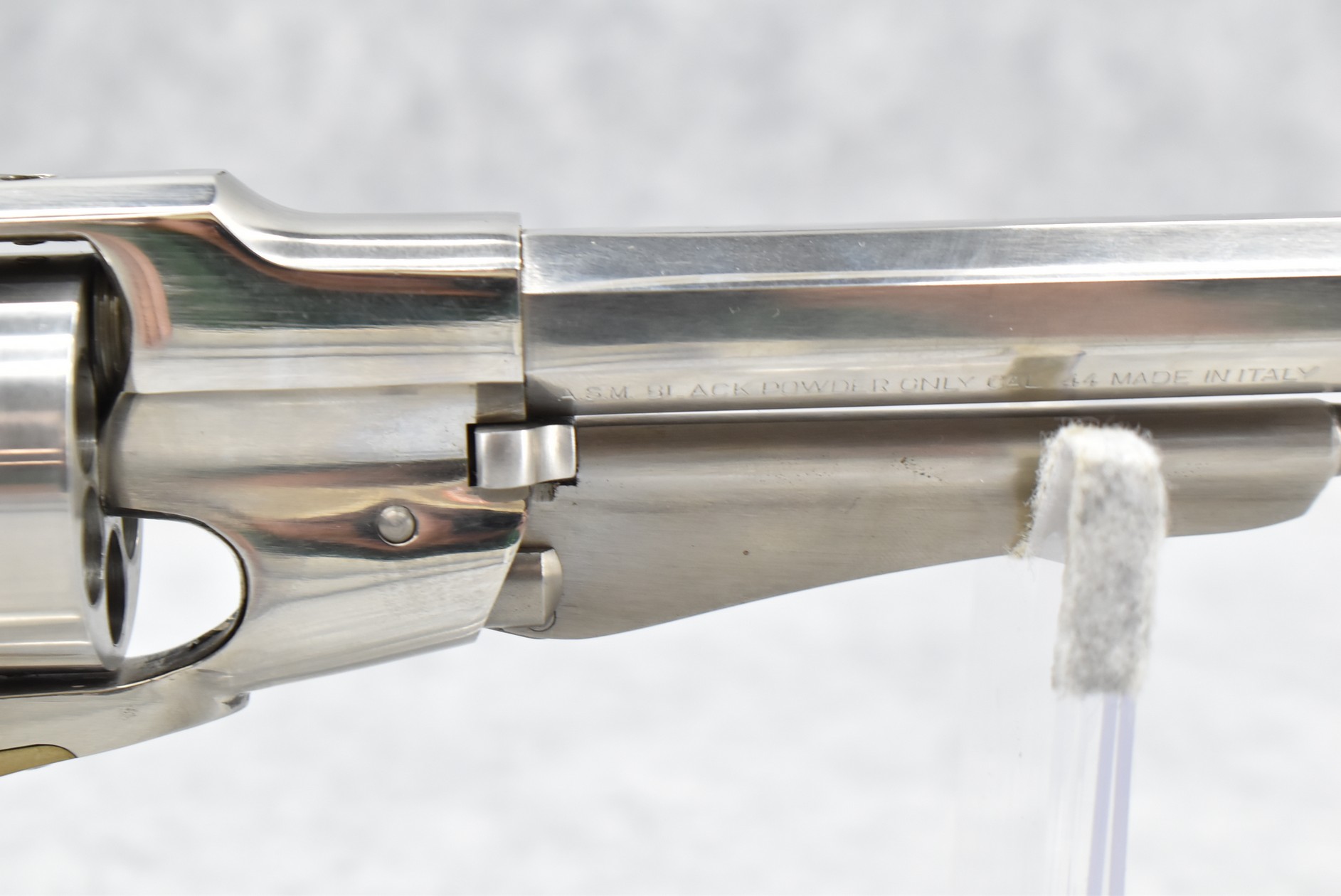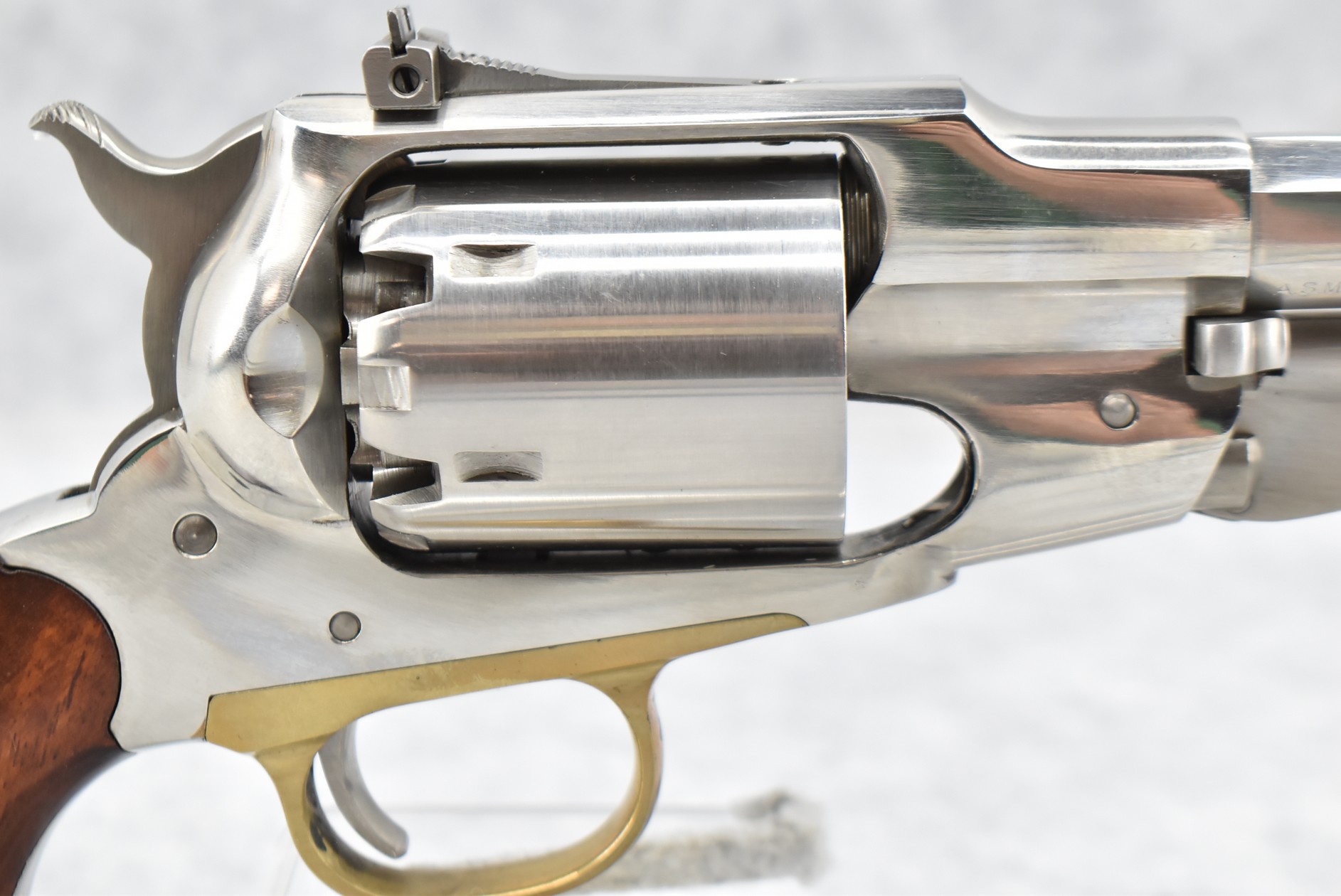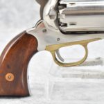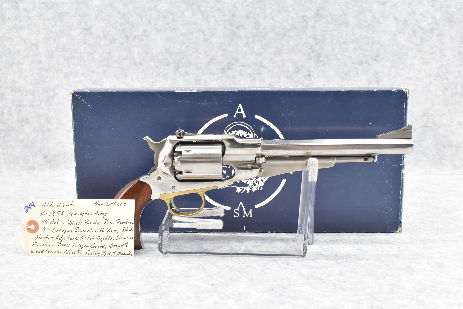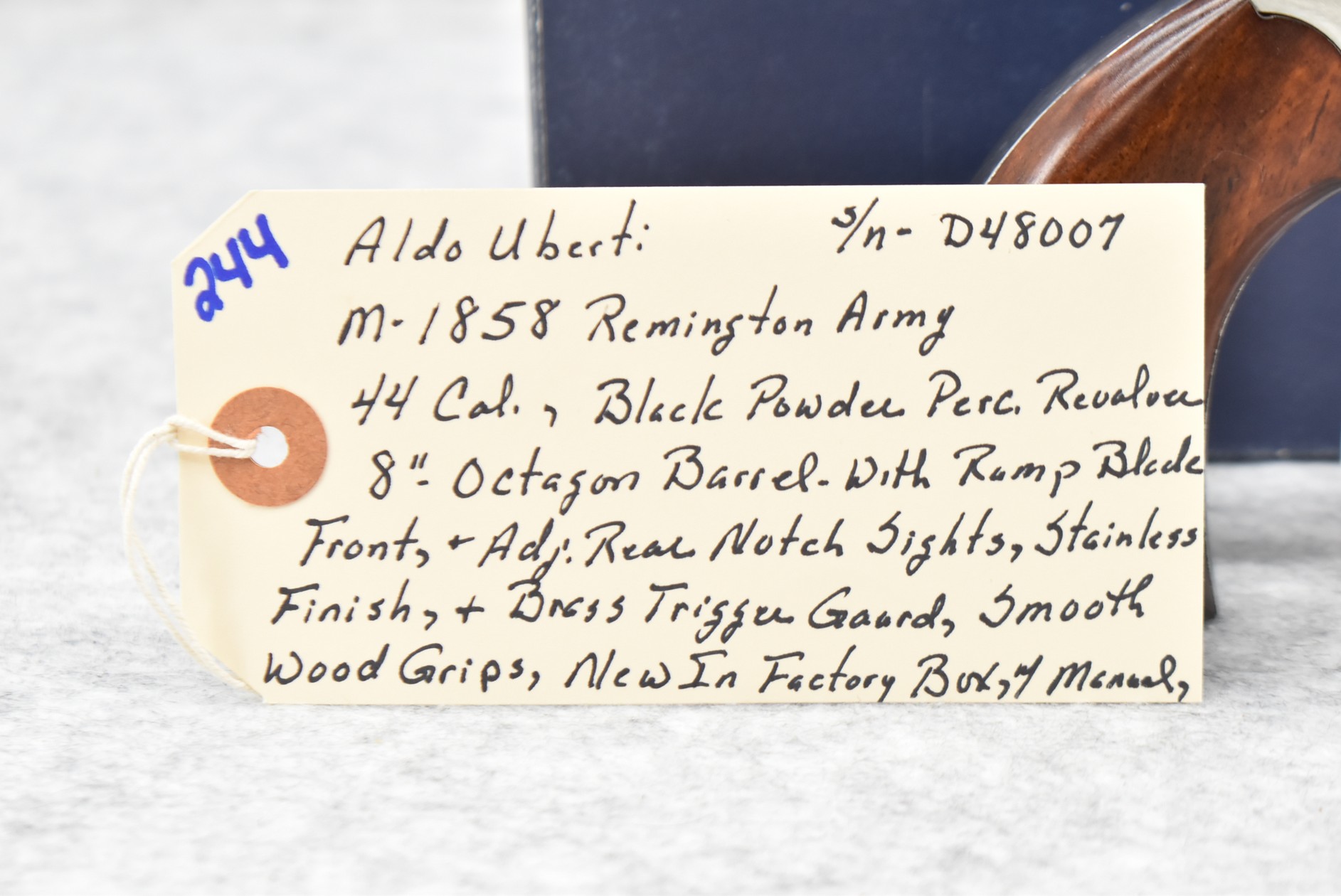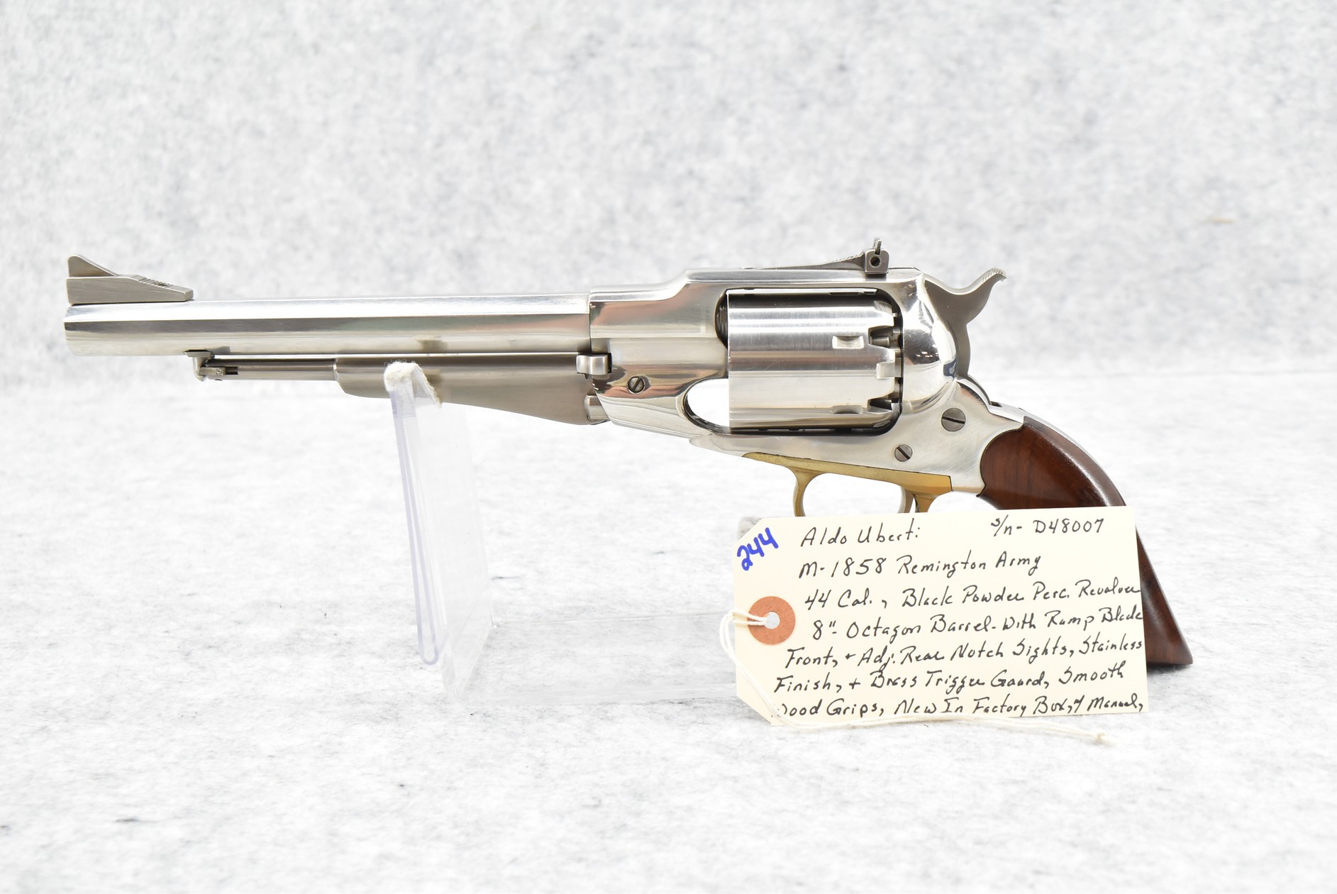 244. Uberti – Mod. 1858 Remington Army – 44 Cal. Black Powder Percussion Revolver – w/8” Octagon Barrel w/Ramp Blade Front & Adj. Rear Notch Sights – Stainless Finish – w/Brass Trigger Guard – w/Smooth Wood Grips – New w/Factory Box & Manual