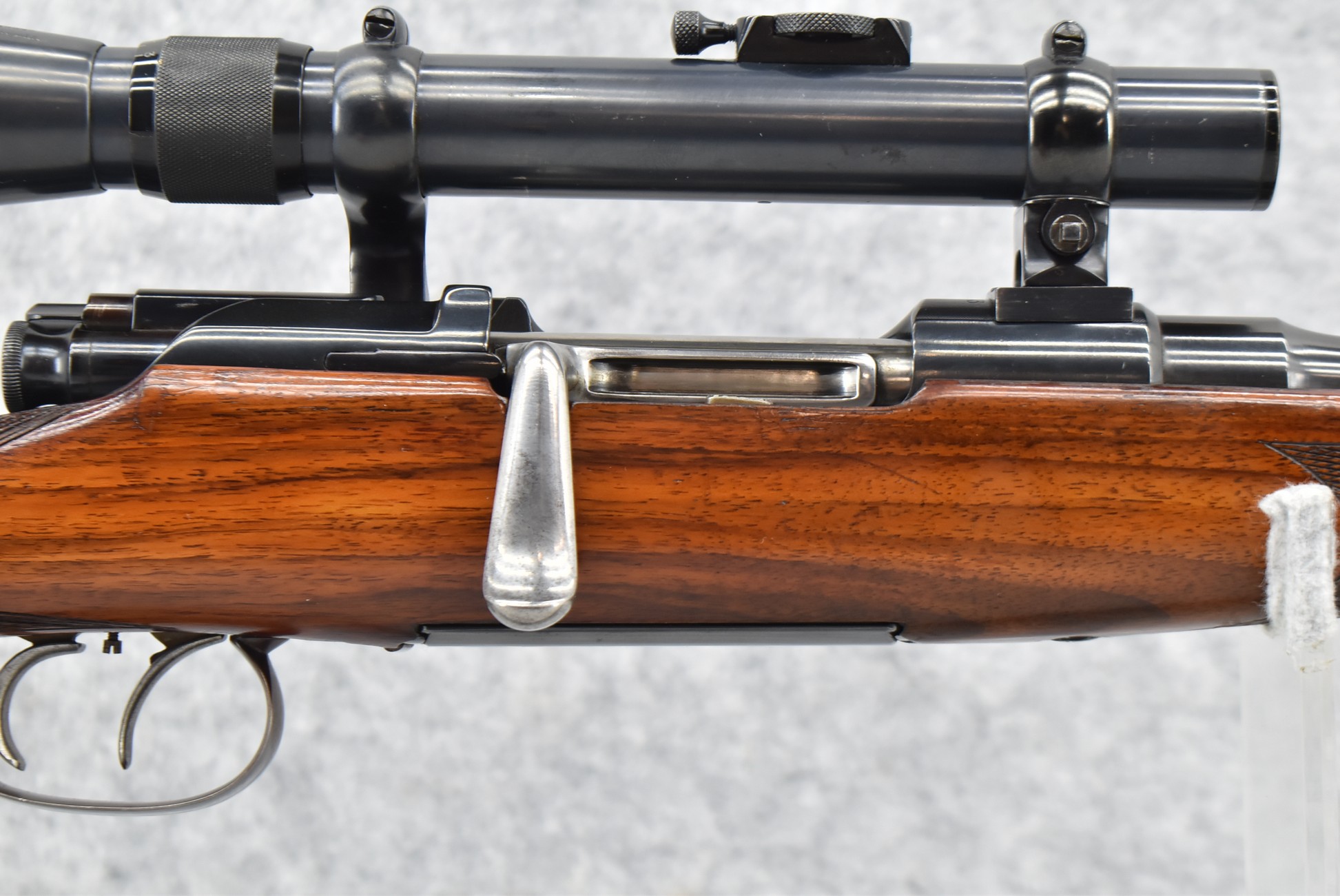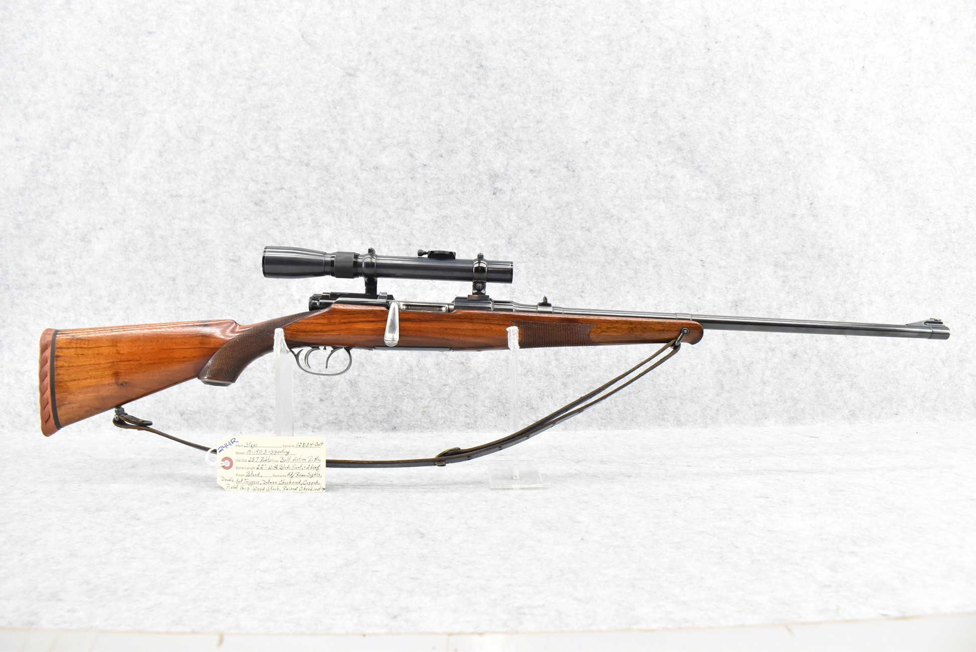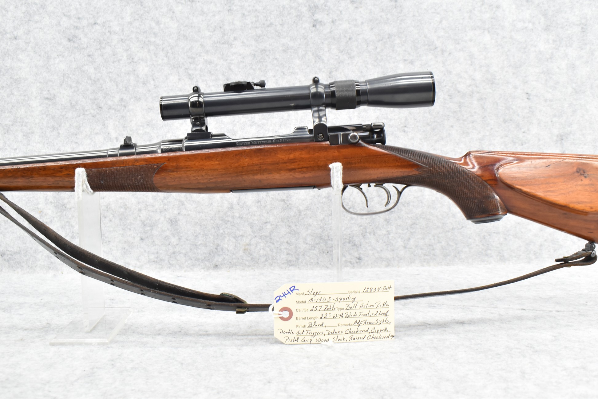 244R. Steyr – Mod. M-1903 Sporting – 257 Roberts Cal. Bolt Action Rifle – w/22” Barrel w/Blade Front and 2-Leaf Adjustable Rear Sights – Blued Finish – w/Deluxe Checkered Capped Pistol Grip Wood Stock w/Raised Cheek Rest and Factory Butt Pad – w/Double Set Triggers – w/Leather Sling – w/Volgtlander Skopar-Beta 2½x Rifle Scope w/Post Reticle, and Correct Scope Mounts
