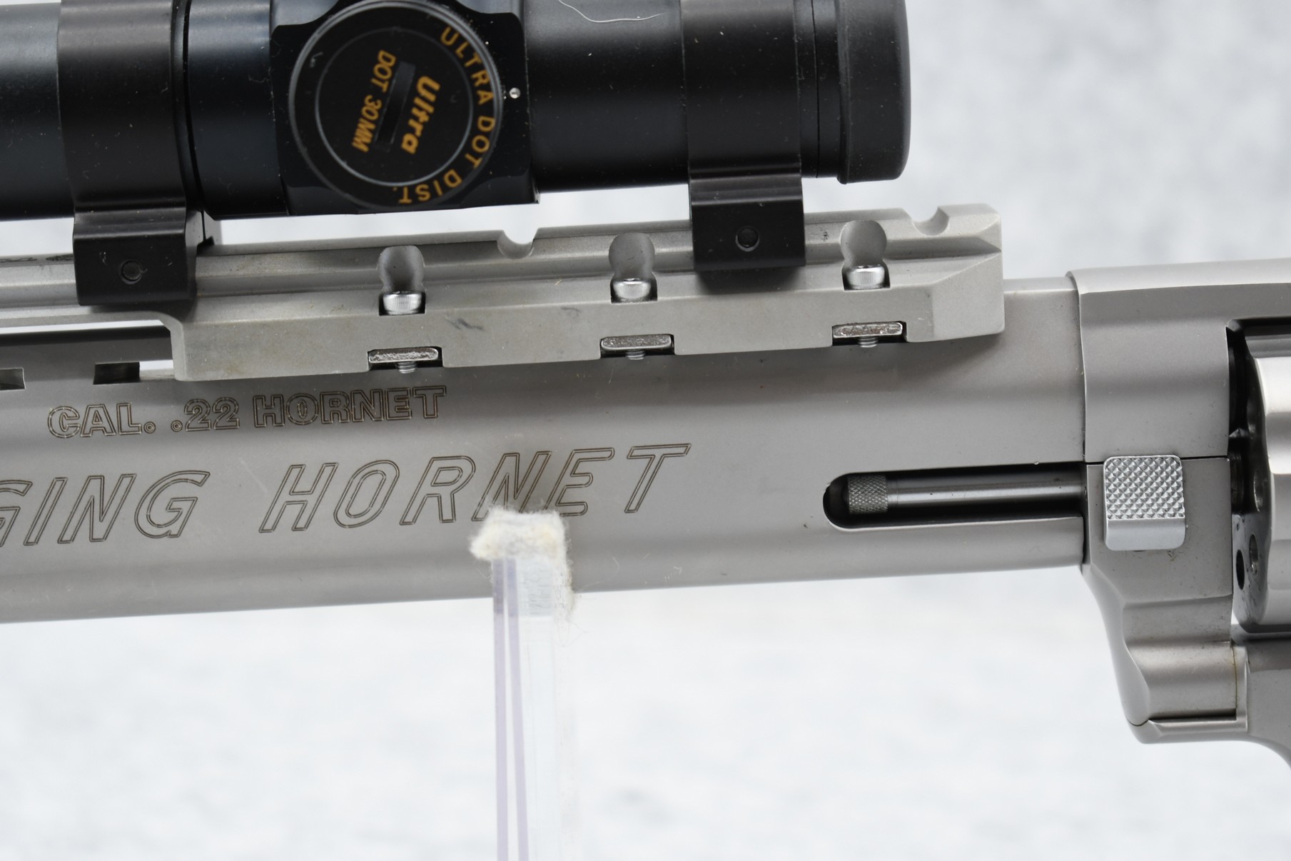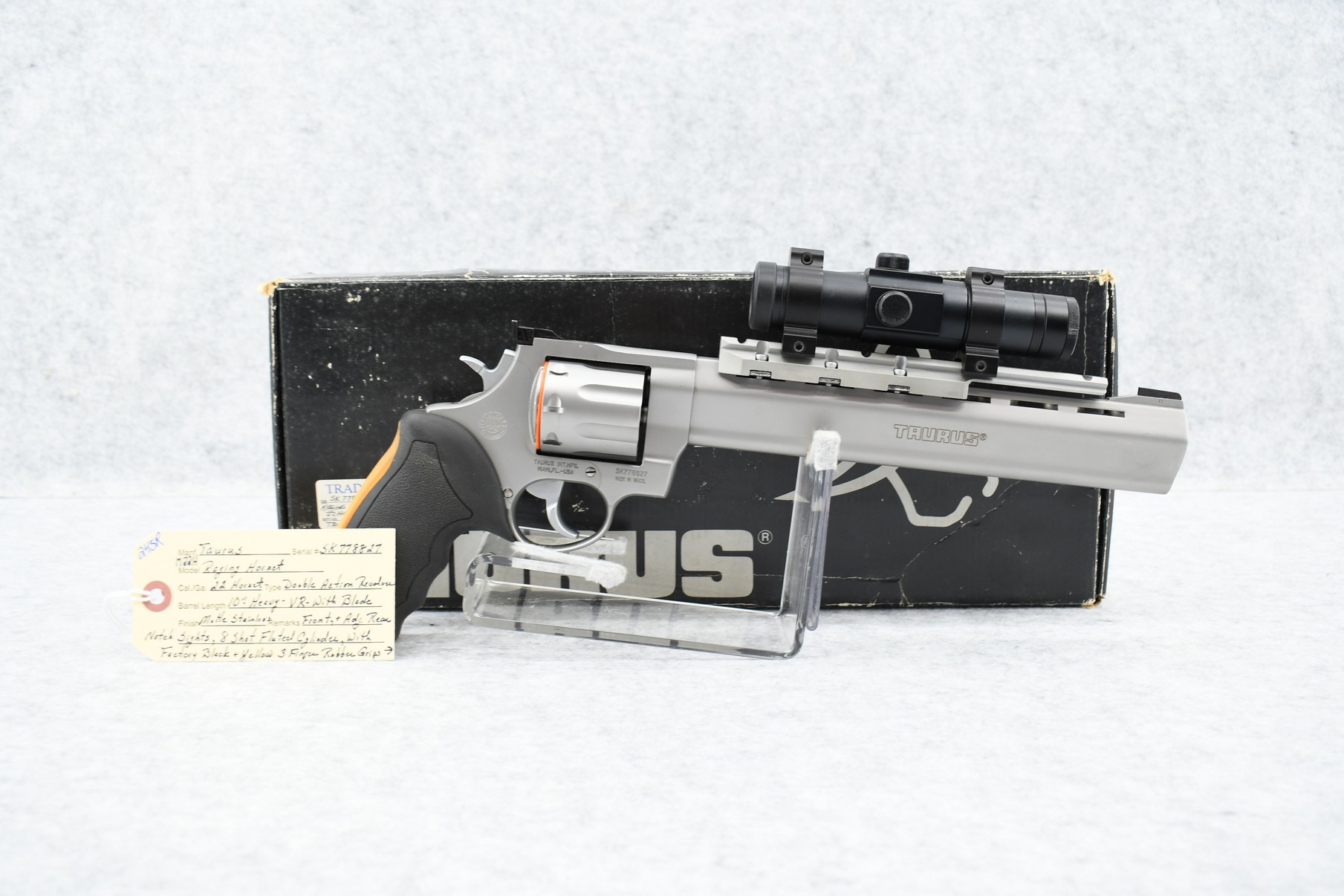 245R. Taurus – Mod. M22H Raging Hornet – 22 Hornet Cal. Double Action Revolver – w/10” Heavy Vent-Rib Barrel w/Blade Front & Adj. Rear Notch Sights – Stainless Finish – w/8-Shot Fluted Cylinder – w/Factory 3-Finger Black & Yellow Rubber Grips – w/Ultra Dot 30mm Red Dot Handgun Scope & Mounts – w/Factory Box & Accessories