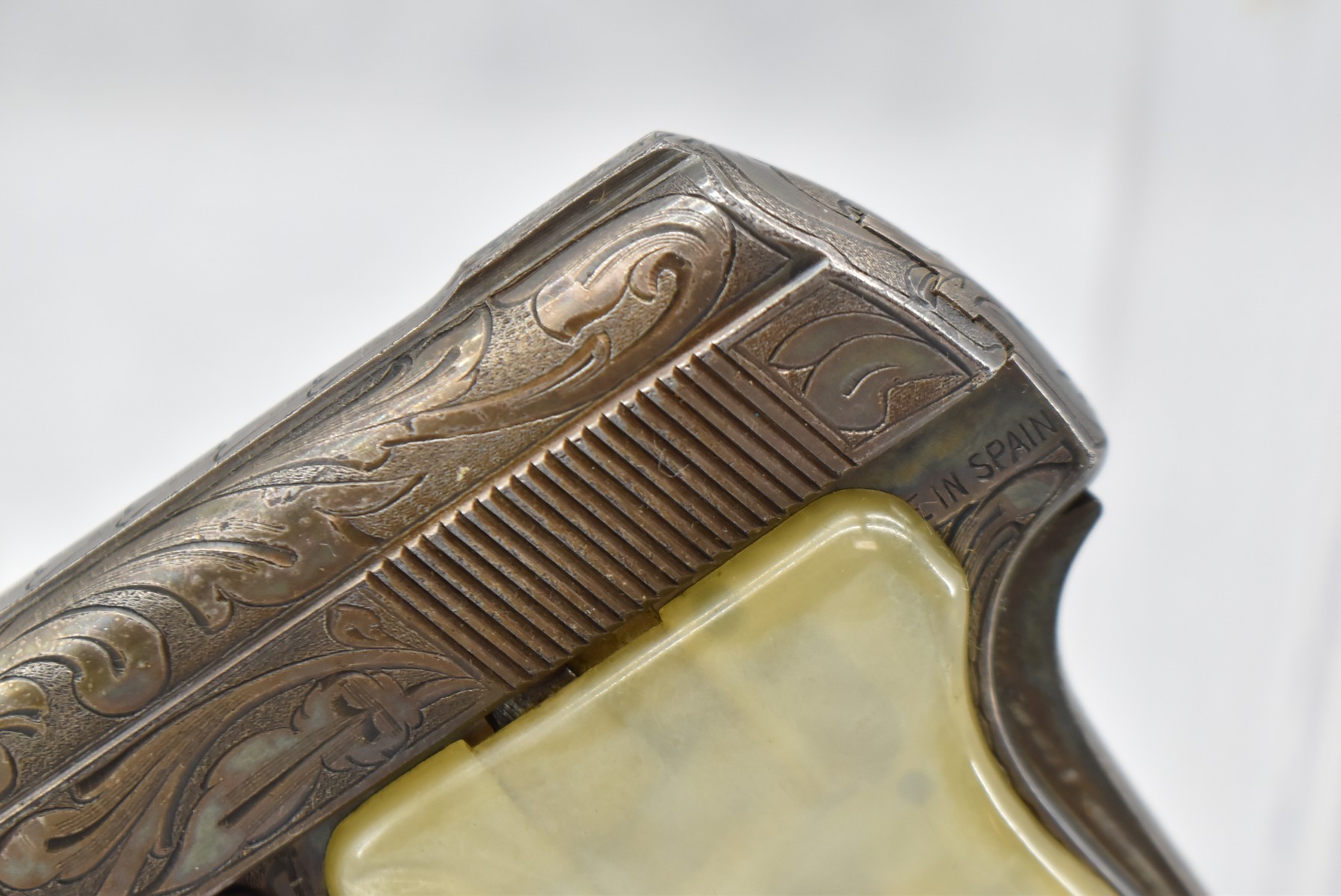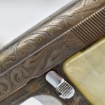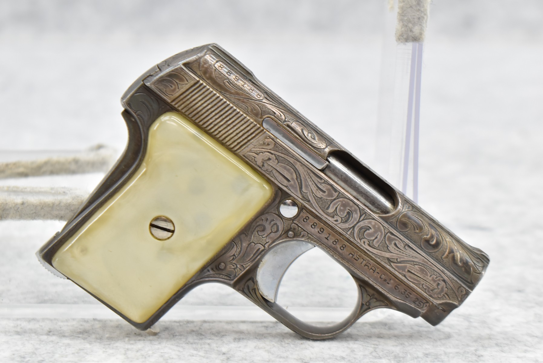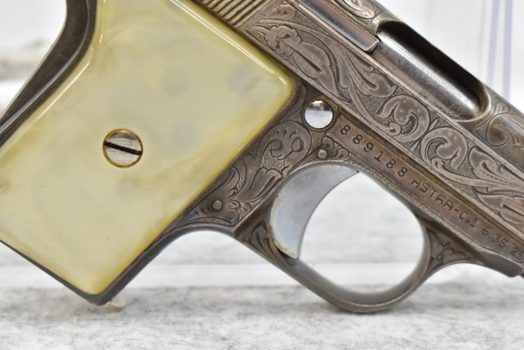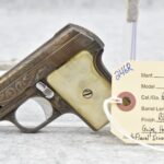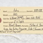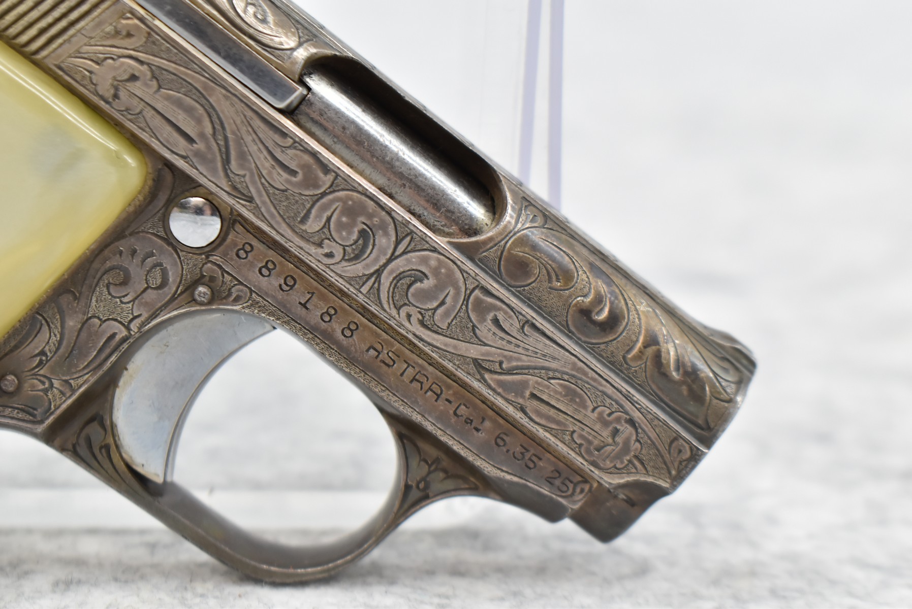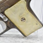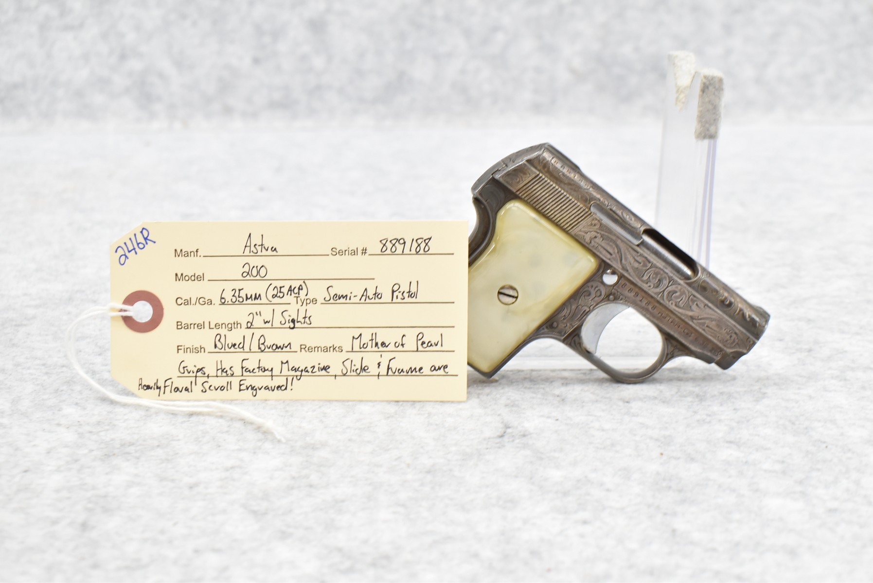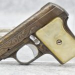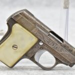 246R. Astra – Mod. 200 – 6.35mm (25 ACP) Cal. Semi-Auto Pistol – w/2” Barrel w/Sights – Blued/Brown Finish – w/Mother of Pearl Grips and Factory Magazine – Side and Frame are Heavily Floral Scroll Engraved!