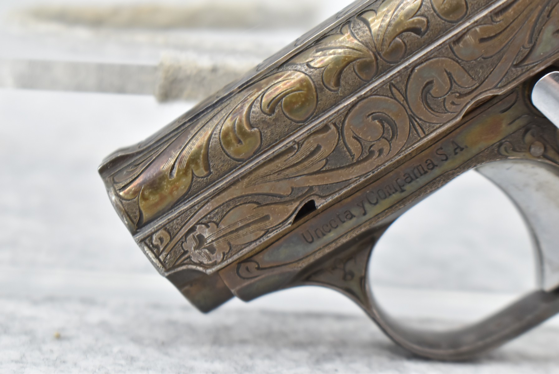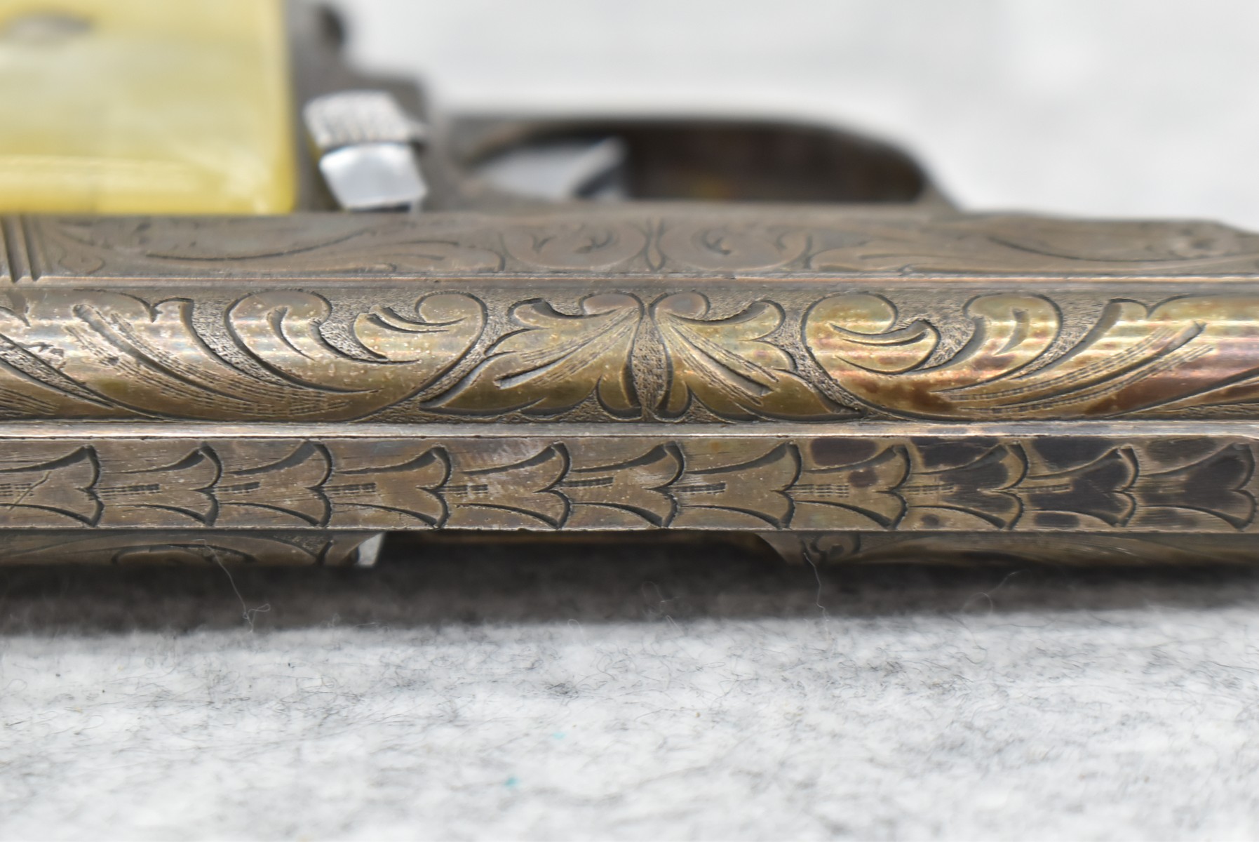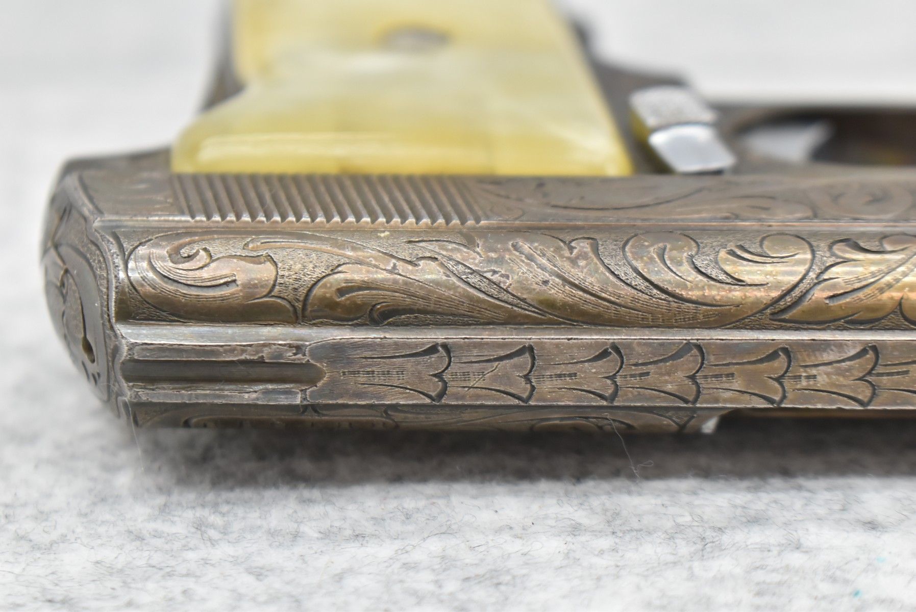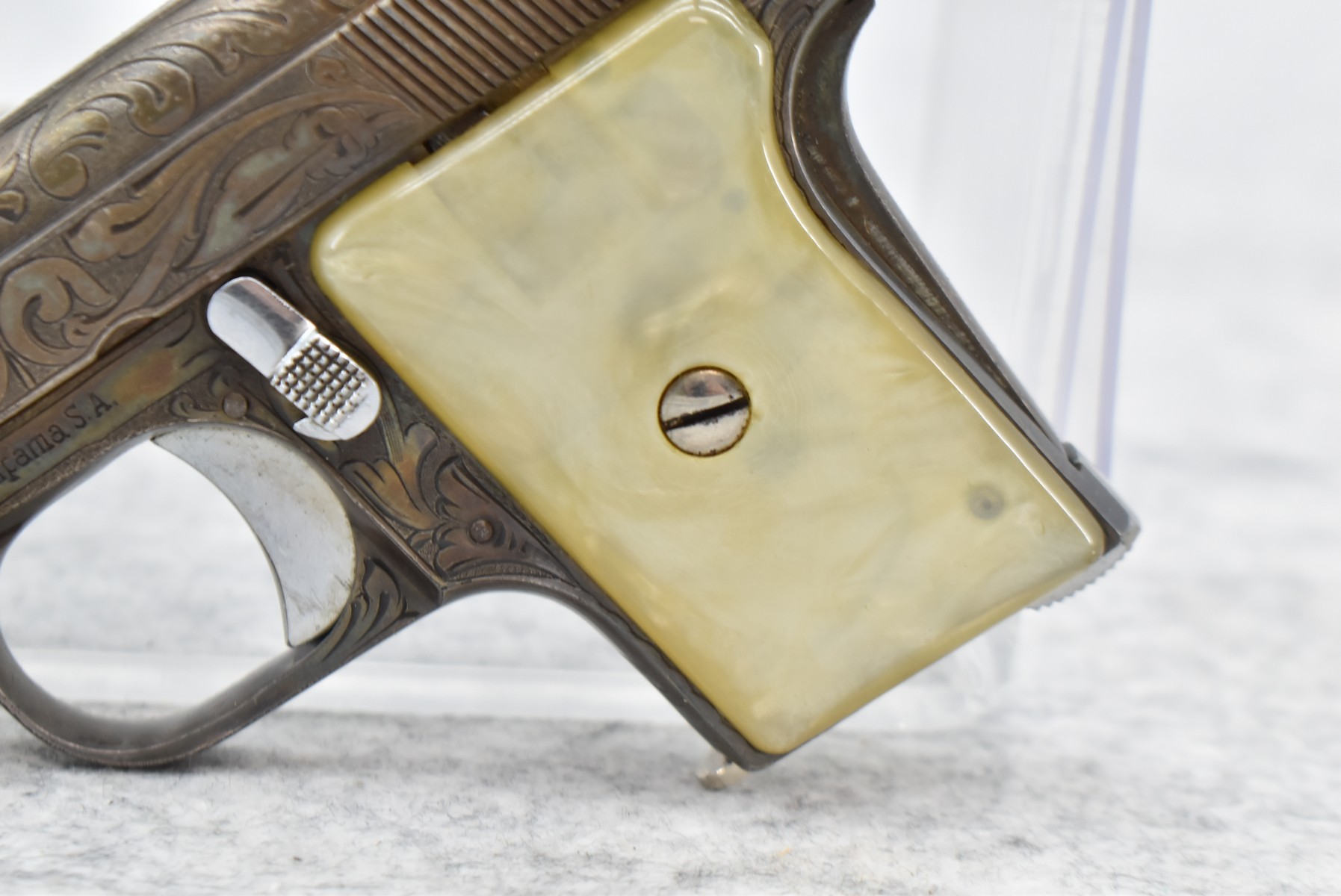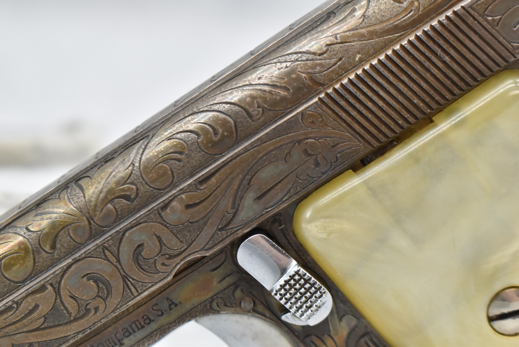 246R. Astra – Mod. 200 – 6.35mm (25 ACP) Cal. Semi-Auto Pistol – w/2” Barrel w/Sights – Blued/Brown Finish – w/Mother of Pearl Grips and Factory Magazine – Side and Frame are Heavily Floral Scroll Engraved!