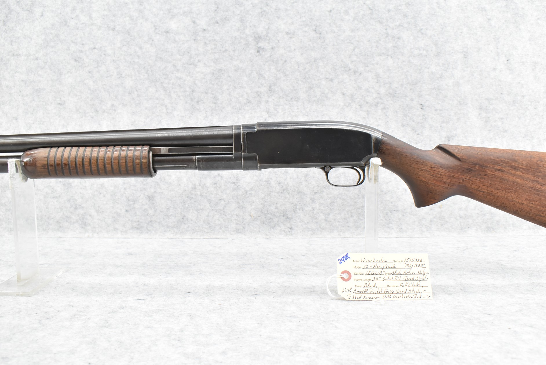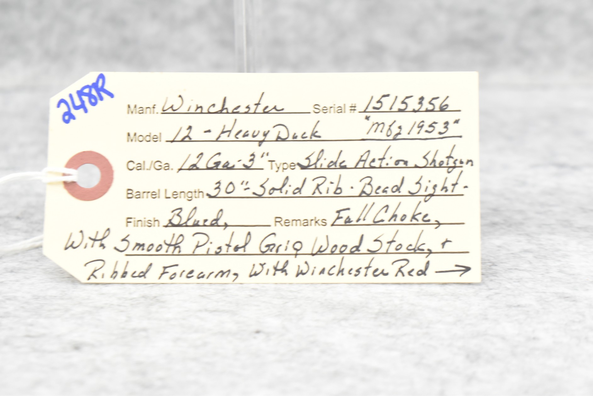 248R. Winchester – Mod. 12 Heavy Duck – 12ga. 3” Pump Action Shotgun – w/30” Full Choke, Solid Rib Barrel w/Bead Sight – Blued Finish – w/Smooth Pistol Grip Wood Stock & Ribbed Forearm w/Factory Butt Pad – Mfg. 1953