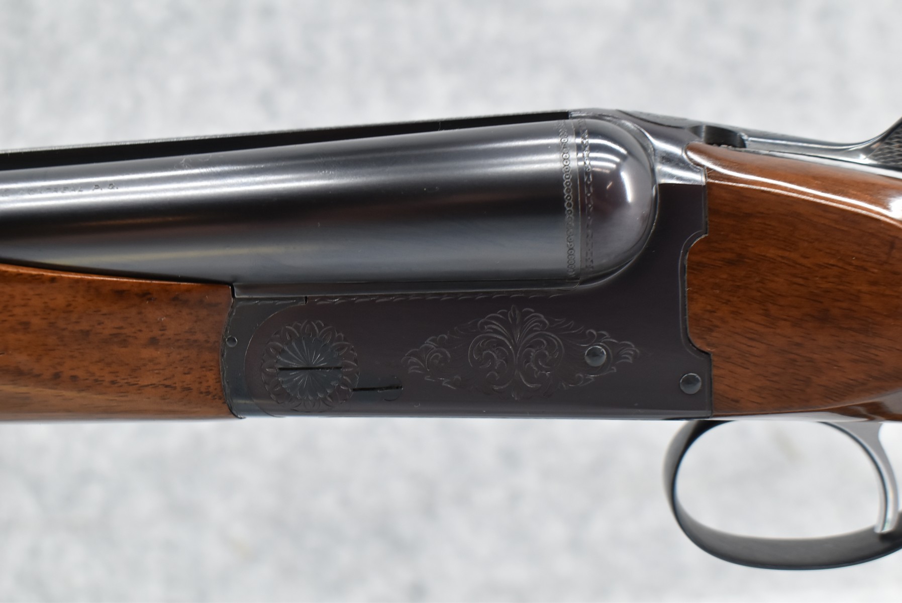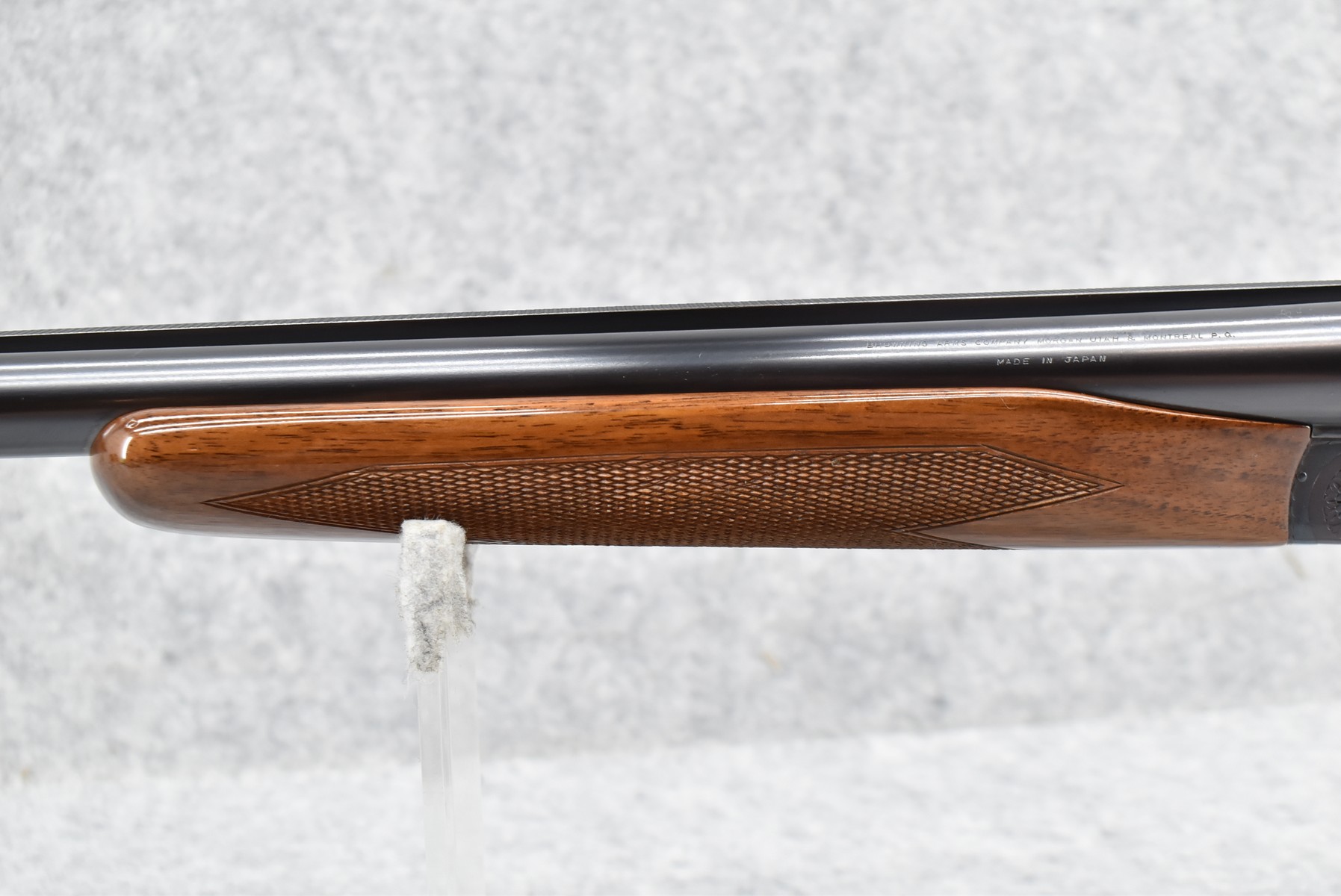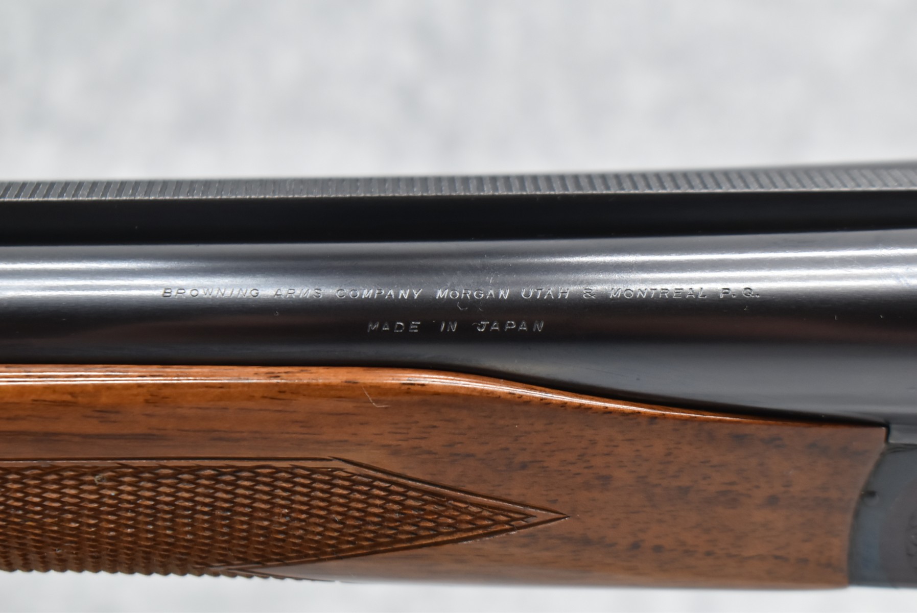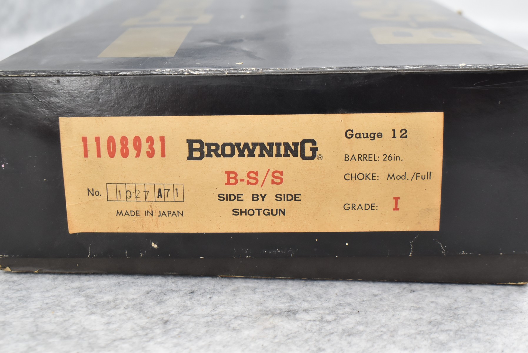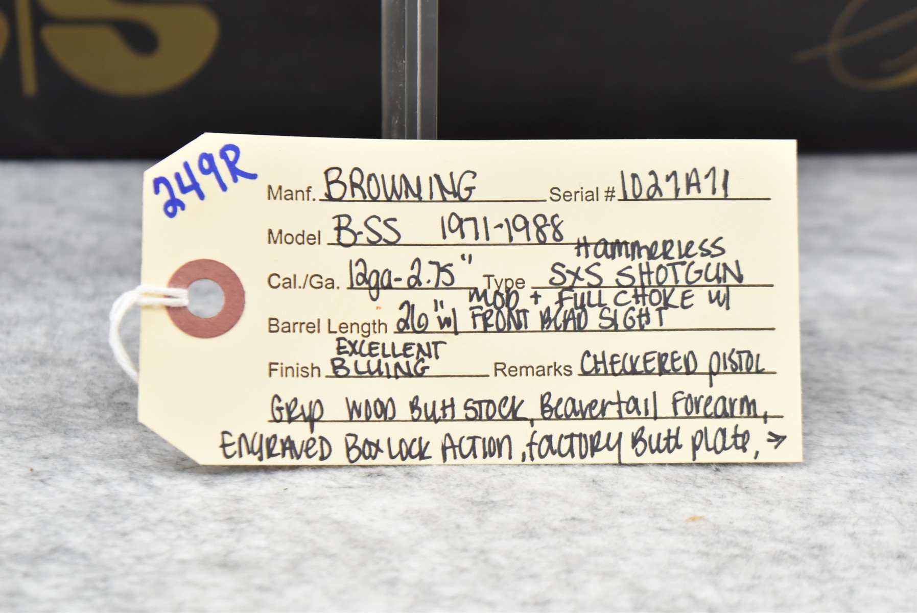 249R. Browning – Mod. B-SS – 12ga. 2 ¾” Hammerless Double Barrel Shotgun – w/26” Mod. & Full Choked Barrels w/Front Bead Sight – Excellent Blued Finish – w/Engraved Receiver – w/Checked Pistol Grip Wood Butt Stock w/Factory Butt Plate & Beavertail Forearm – w/Single Trigger – As New w/Box