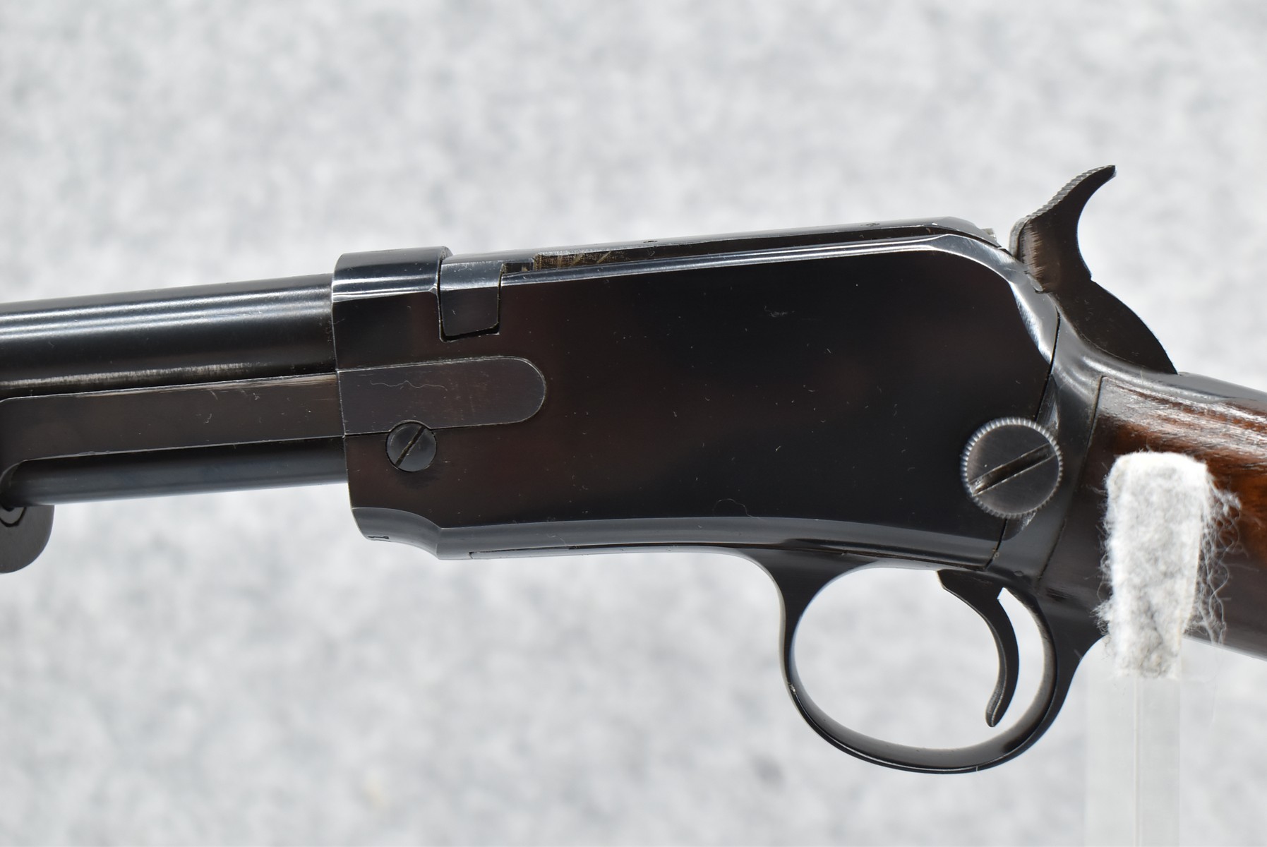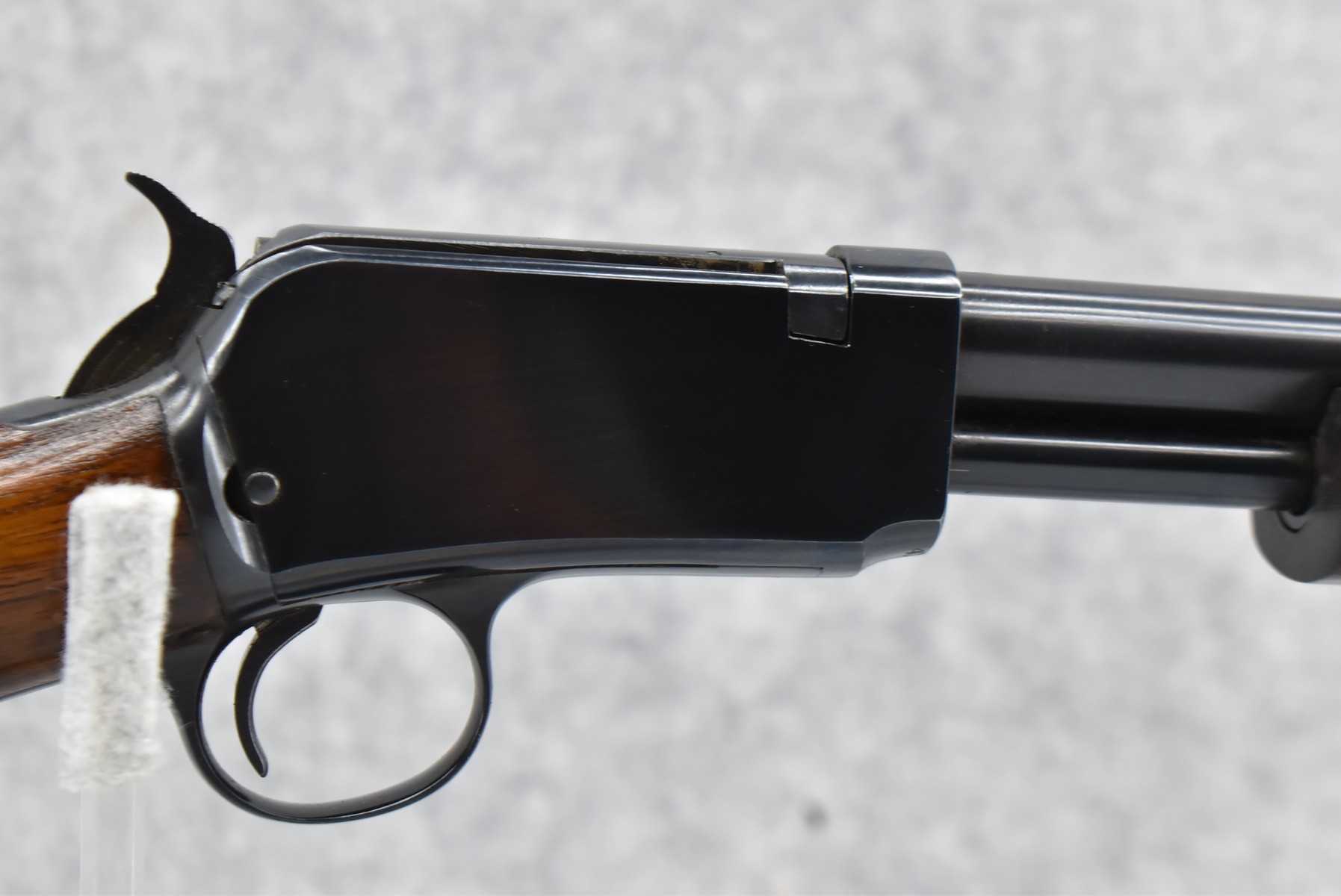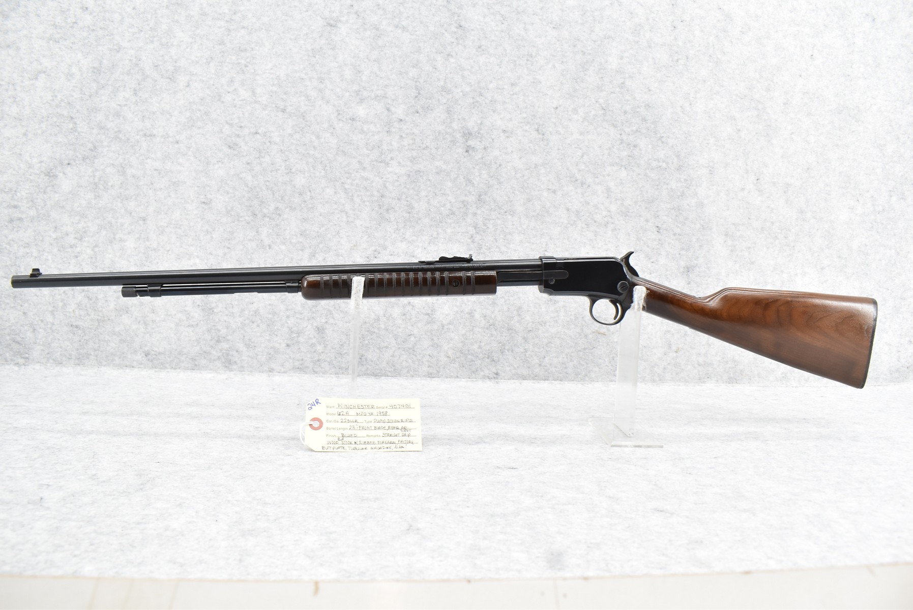 24R. Winchester – Mod. 62A – 22 Cal. Pump Action Rifle – w/23” Barrel w/Front Blade & Rear Adj. Sights – Blued Finish – w/Straight Grip Wood Butt Stock w/Factory Butt Plate & Ribbed Forearm – w/Tubular Magazine – Mfg. 1958 – As New!