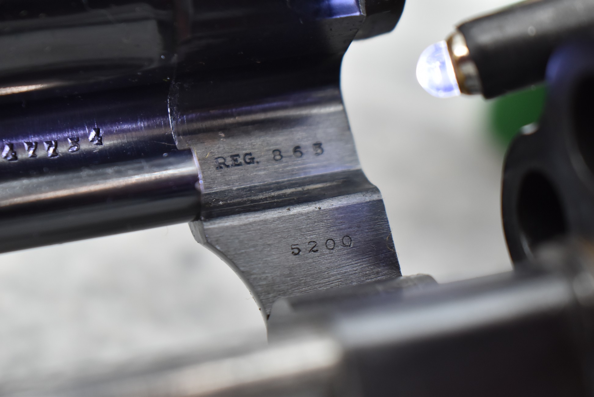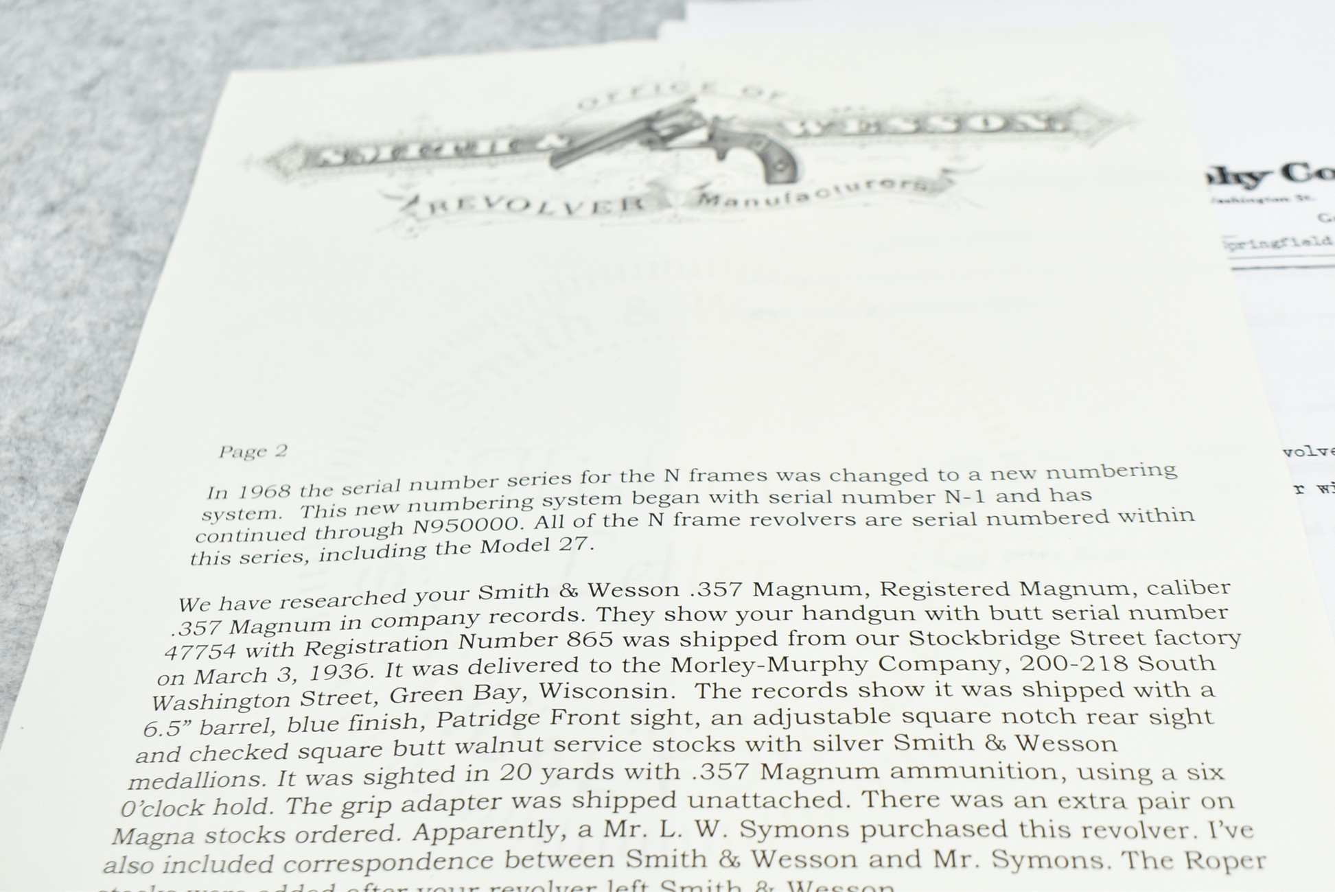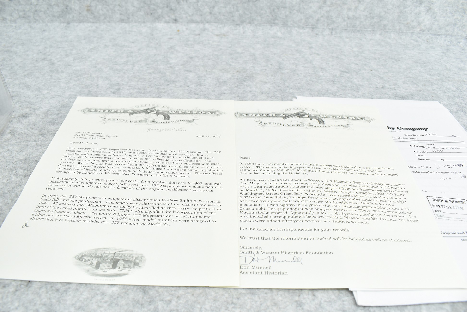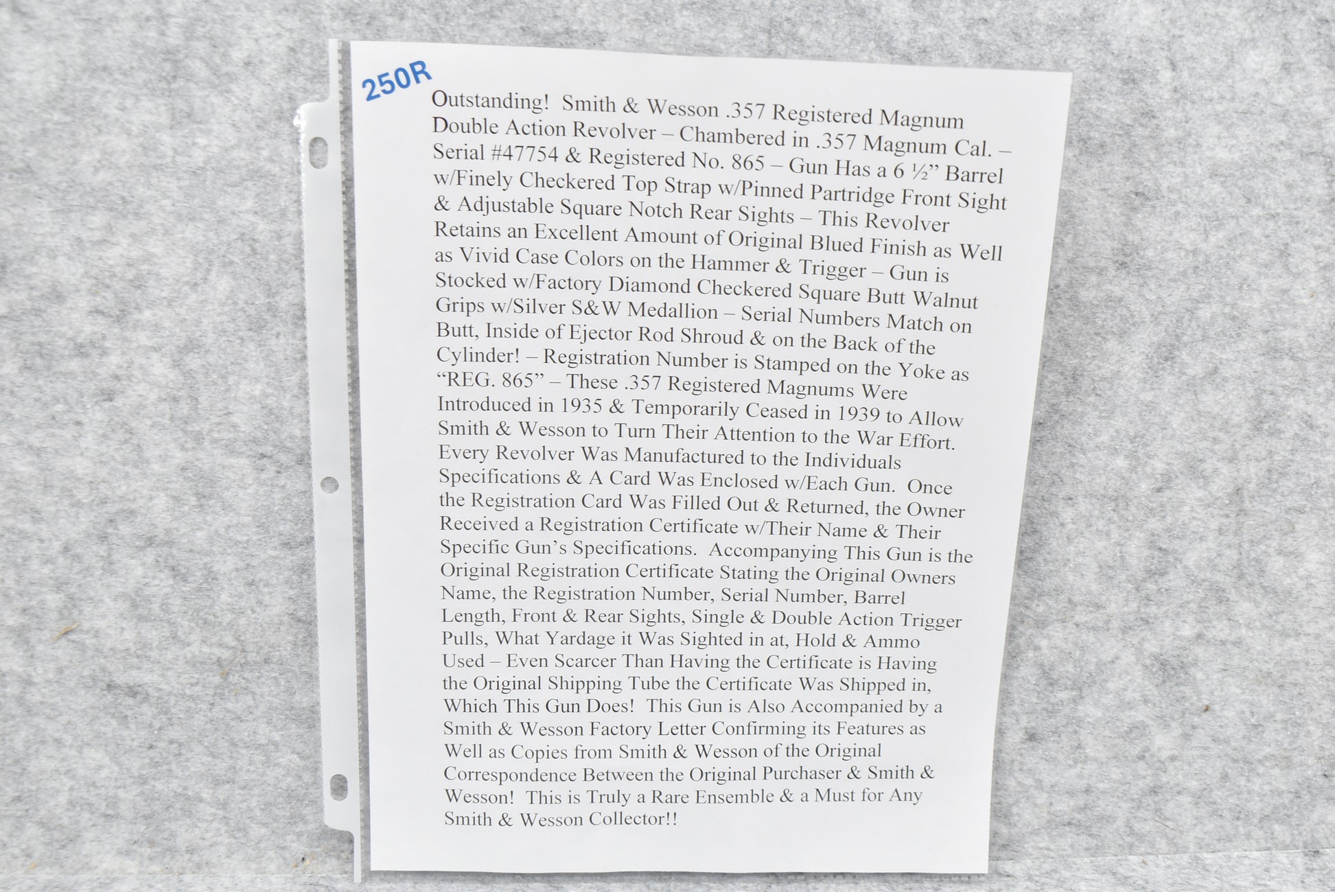 250R. Outstanding! Smith & Wesson .357 Registered Magnum Double Action Revolver – Chambered in .357 Magnum Cal. – Serial #47754 & Registered No. 865 – Gun Has a 6 ½” Barrel w/Finely Checkered Top Strap w/Pinned Partridge Front Sight & Adjustable Square Notch Rear Sights – This Revolver Retains an Excellent Amount of Original Blued Finish as Well as Vivid Case Colors on the Hammer & Trigger – Gun is Stocked w/Factory Diamond Checkered Square Butt Walnut Grips w/Silver S&W Medallion – Serial Numbers Match on Butt, Inside of Ejector Rod Shroud & on the Back of the Cylinder! – Registration Number is Stamped on the Yoke as “REG. 865” – These .357 Registered Magnums Were Introduced in 1935 & Temporarily Ceased in 1939 to Allow Smith & Wesson to Turn Their Attention to the War Effort. Every Revolver Was Manufactured to the Individuals Specifications & A Card Was Enclosed w/Each Gun. Once the Registration Card Was Filled Out & Returned, the Owner Received a Registration Certificate w/Their Name & Their Specific Gun’s Specifications. Accompanying This Gun is the Original Registration Certificate Stating the Original Owners Name, the Registration Number, Serial Number, Barrel Length, Front & Rear Sights, Single & Double Action Trigger Pulls, What Yardage it Was Sighted in at, Hold & Ammo Used – Even Scarcer Than Having the Certificate is Having the Original Shipping Tube the Certificate Was Shipped in, Which This Gun Does! This Gun is Also Accompanied by a Smith & Wesson Factory Letter Confirming its Features as Well as Copies from Smith & Wesson of the Original Correspondence Between the Original Purchaser & Smith & Wesson! This is Truly a Rare Ensemble & a Must for Any Smith & Wesson Collector!!