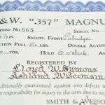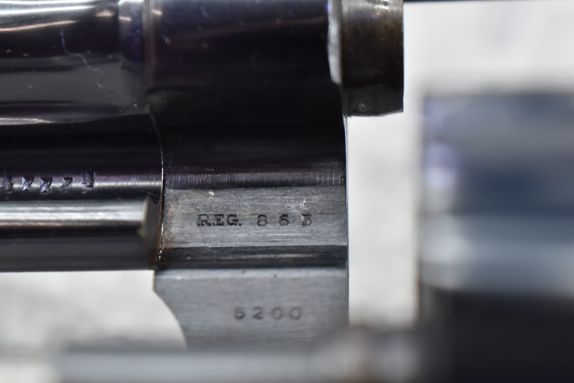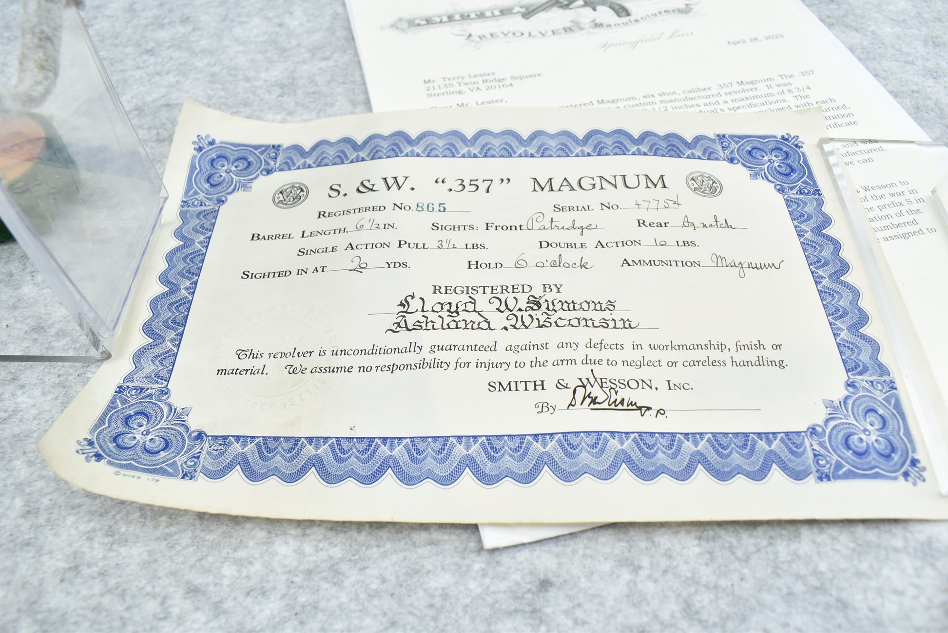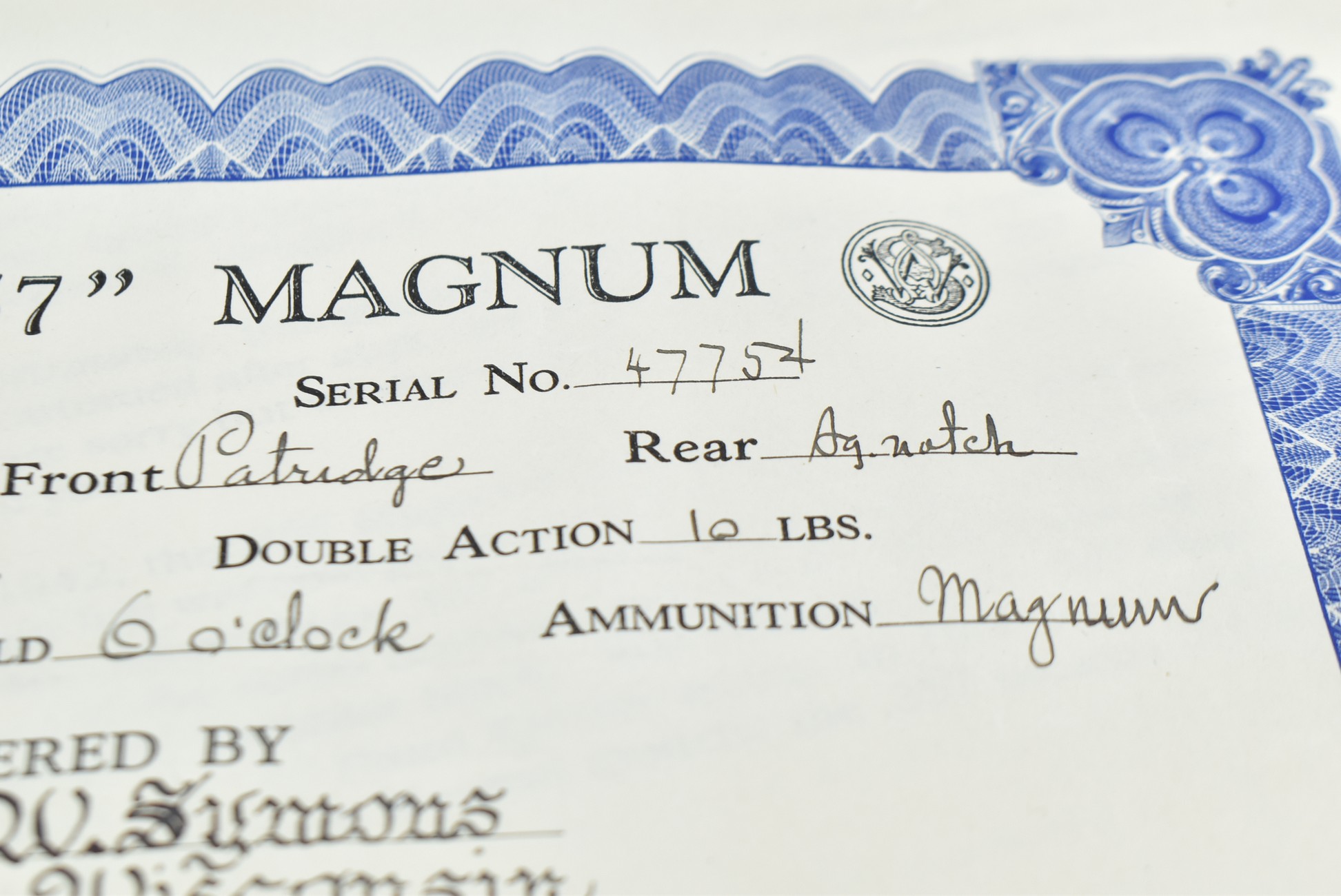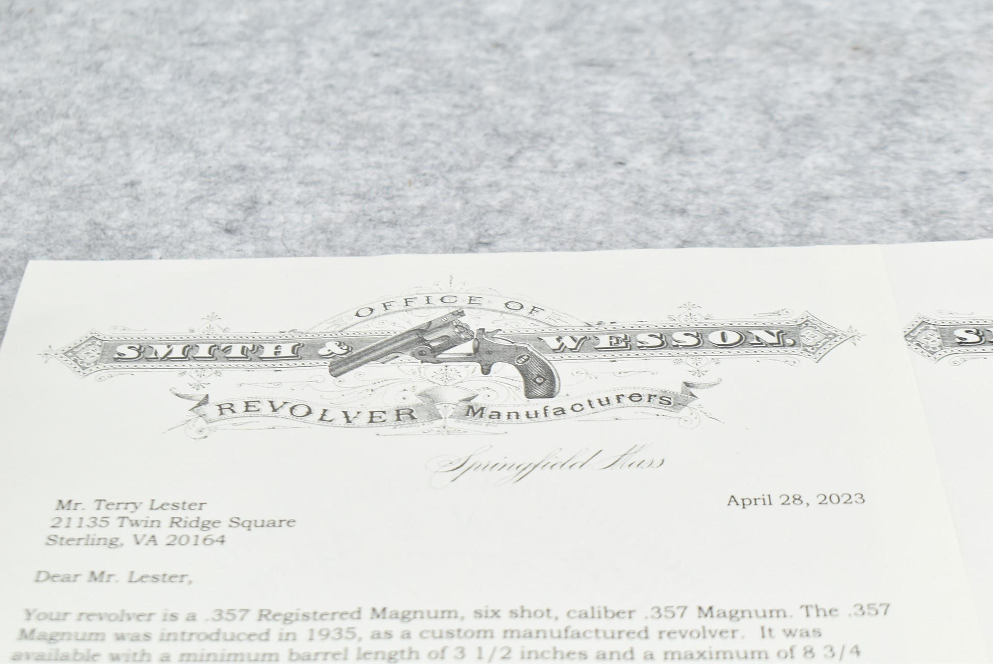 250R. Outstanding! Smith & Wesson .357 Registered Magnum Double Action Revolver – Chambered in .357 Magnum Cal. – Serial #47754 & Registered No. 865 – Gun Has a 6 ½” Barrel w/Finely Checkered Top Strap w/Pinned Partridge Front Sight & Adjustable Square Notch Rear Sights – This Revolver Retains an Excellent Amount of Original Blued Finish as Well as Vivid Case Colors on the Hammer & Trigger – Gun is Stocked w/Factory Diamond Checkered Square Butt Walnut Grips w/Silver S&W Medallion – Serial Numbers Match on Butt, Inside of Ejector Rod Shroud & on the Back of the Cylinder! – Registration Number is Stamped on the Yoke as “REG. 865” – These .357 Registered Magnums Were Introduced in 1935 & Temporarily Ceased in 1939 to Allow Smith & Wesson to Turn Their Attention to the War Effort. Every Revolver Was Manufactured to the Individuals Specifications & A Card Was Enclosed w/Each Gun. Once the Registration Card Was Filled Out & Returned, the Owner Received a Registration Certificate w/Their Name & Their Specific Gun’s Specifications. Accompanying This Gun is the Original Registration Certificate Stating the Original Owners Name, the Registration Number, Serial Number, Barrel Length, Front & Rear Sights, Single & Double Action Trigger Pulls, What Yardage it Was Sighted in at, Hold & Ammo Used – Even Scarcer Than Having the Certificate is Having the Original Shipping Tube the Certificate Was Shipped in, Which This Gun Does! This Gun is Also Accompanied by a Smith & Wesson Factory Letter Confirming its Features as Well as Copies from Smith & Wesson of the Original Correspondence Between the Original Purchaser & Smith & Wesson! This is Truly a Rare Ensemble & a Must for Any Smith & Wesson Collector!!