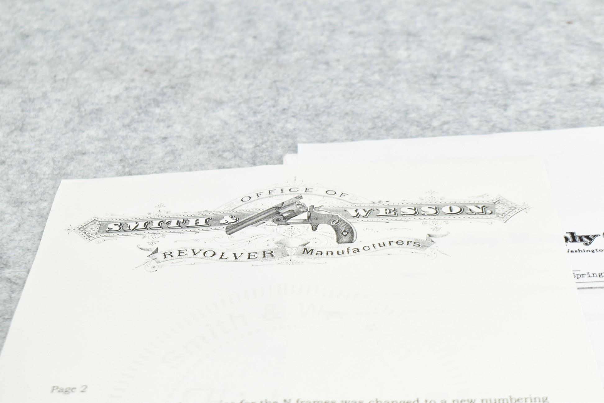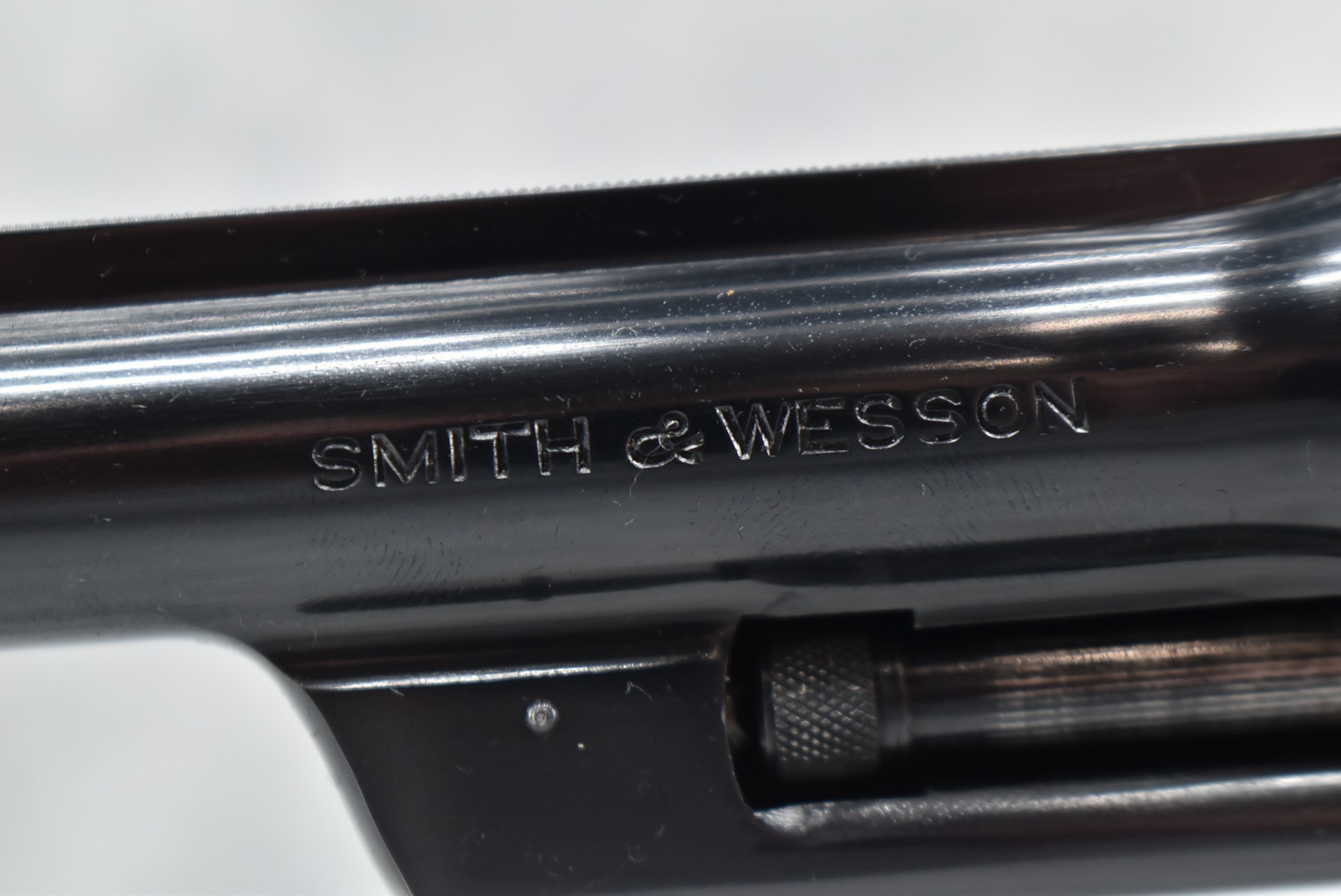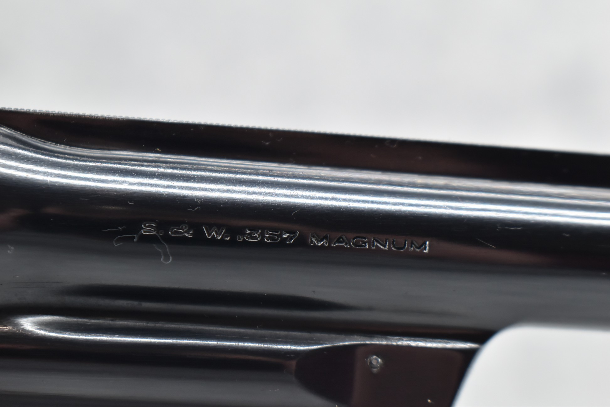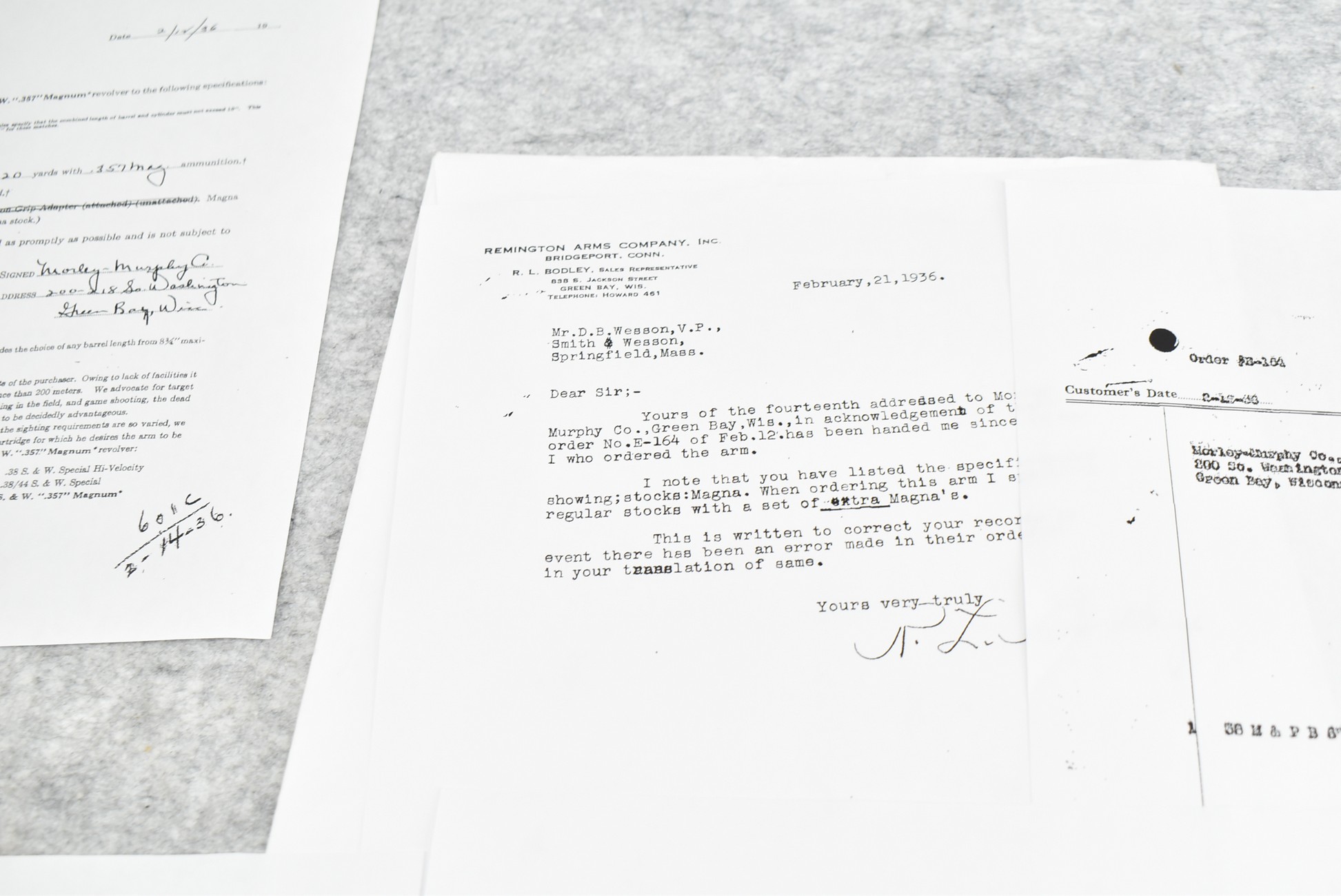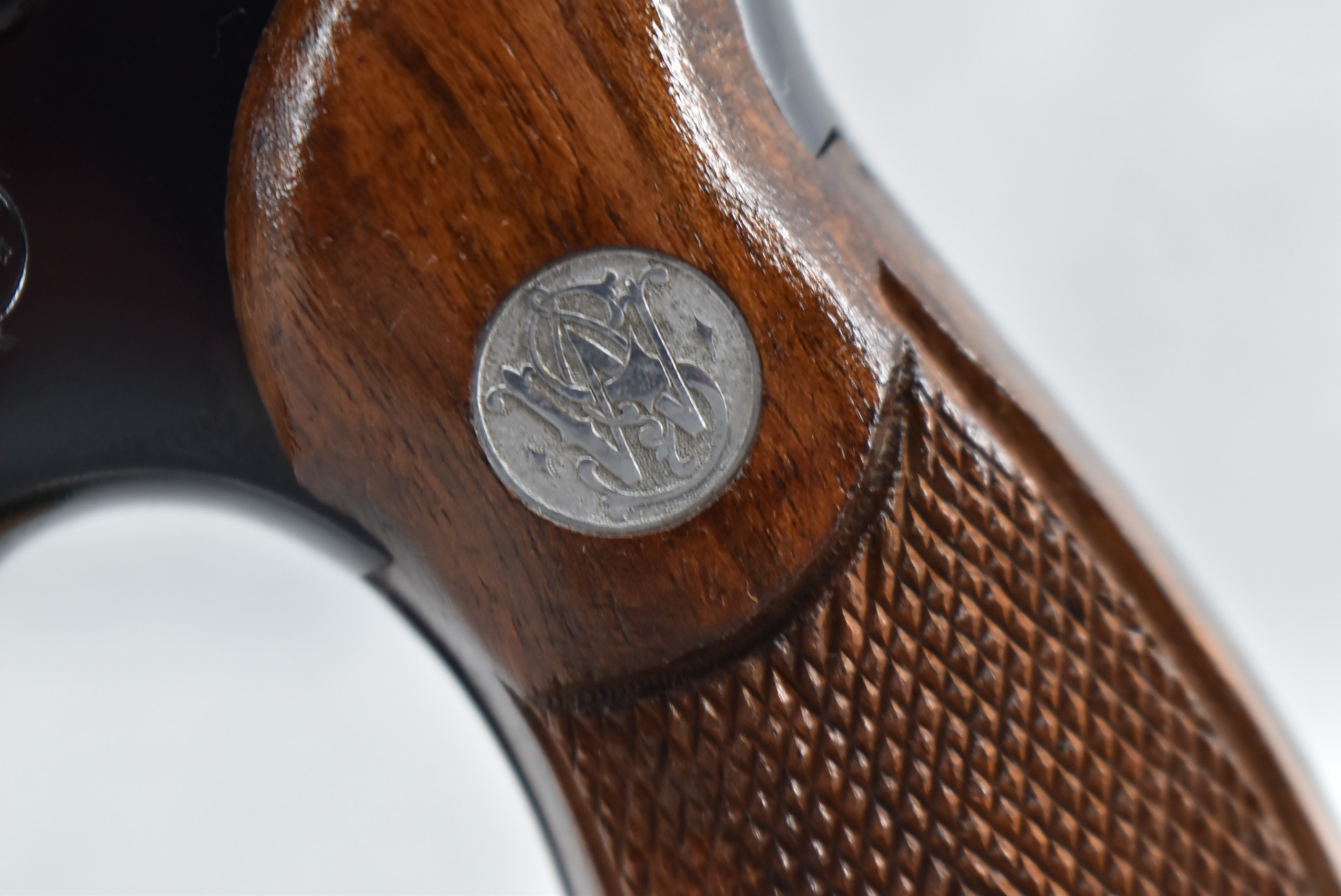 250R. Outstanding! Smith & Wesson .357 Registered Magnum Double Action Revolver – Chambered in .357 Magnum Cal. – Serial #47754 & Registered No. 865 – Gun Has a 6 ½” Barrel w/Finely Checkered Top Strap w/Pinned Partridge Front Sight & Adjustable Square Notch Rear Sights – This Revolver Retains an Excellent Amount of Original Blued Finish as Well as Vivid Case Colors on the Hammer & Trigger – Gun is Stocked w/Factory Diamond Checkered Square Butt Walnut Grips w/Silver S&W Medallion – Serial Numbers Match on Butt, Inside of Ejector Rod Shroud & on the Back of the Cylinder! – Registration Number is Stamped on the Yoke as “REG. 865” – These .357 Registered Magnums Were Introduced in 1935 & Temporarily Ceased in 1939 to Allow Smith & Wesson to Turn Their Attention to the War Effort. Every Revolver Was Manufactured to the Individuals Specifications & A Card Was Enclosed w/Each Gun. Once the Registration Card Was Filled Out & Returned, the Owner Received a Registration Certificate w/Their Name & Their Specific Gun’s Specifications. Accompanying This Gun is the Original Registration Certificate Stating the Original Owners Name, the Registration Number, Serial Number, Barrel Length, Front & Rear Sights, Single & Double Action Trigger Pulls, What Yardage it Was Sighted in at, Hold & Ammo Used – Even Scarcer Than Having the Certificate is Having the Original Shipping Tube the Certificate Was Shipped in, Which This Gun Does! This Gun is Also Accompanied by a Smith & Wesson Factory Letter Confirming its Features as Well as Copies from Smith & Wesson of the Original Correspondence Between the Original Purchaser & Smith & Wesson! This is Truly a Rare Ensemble & a Must for Any Smith & Wesson Collector!!