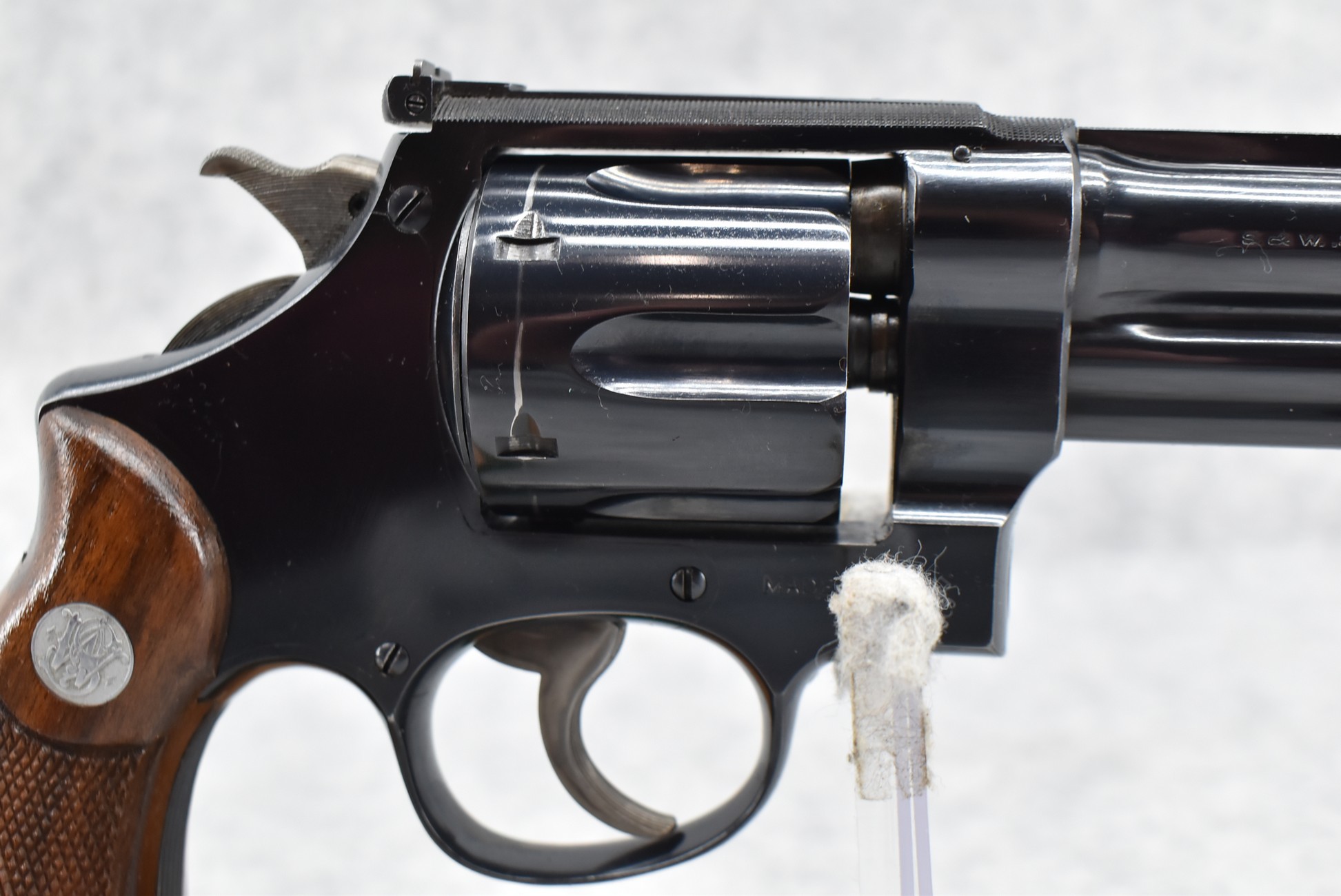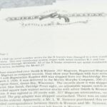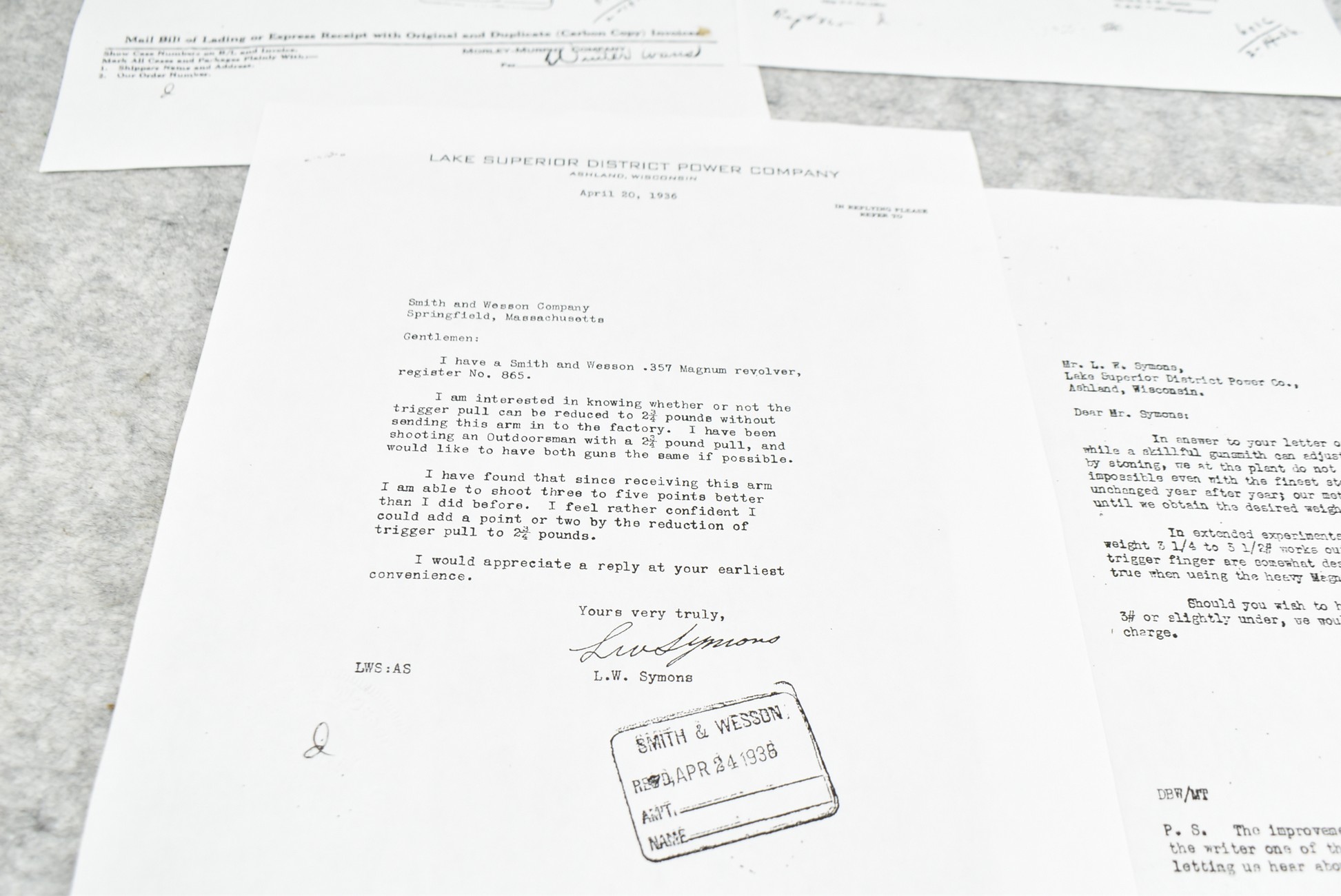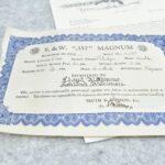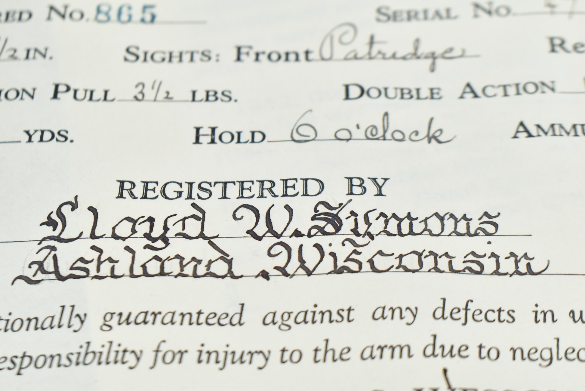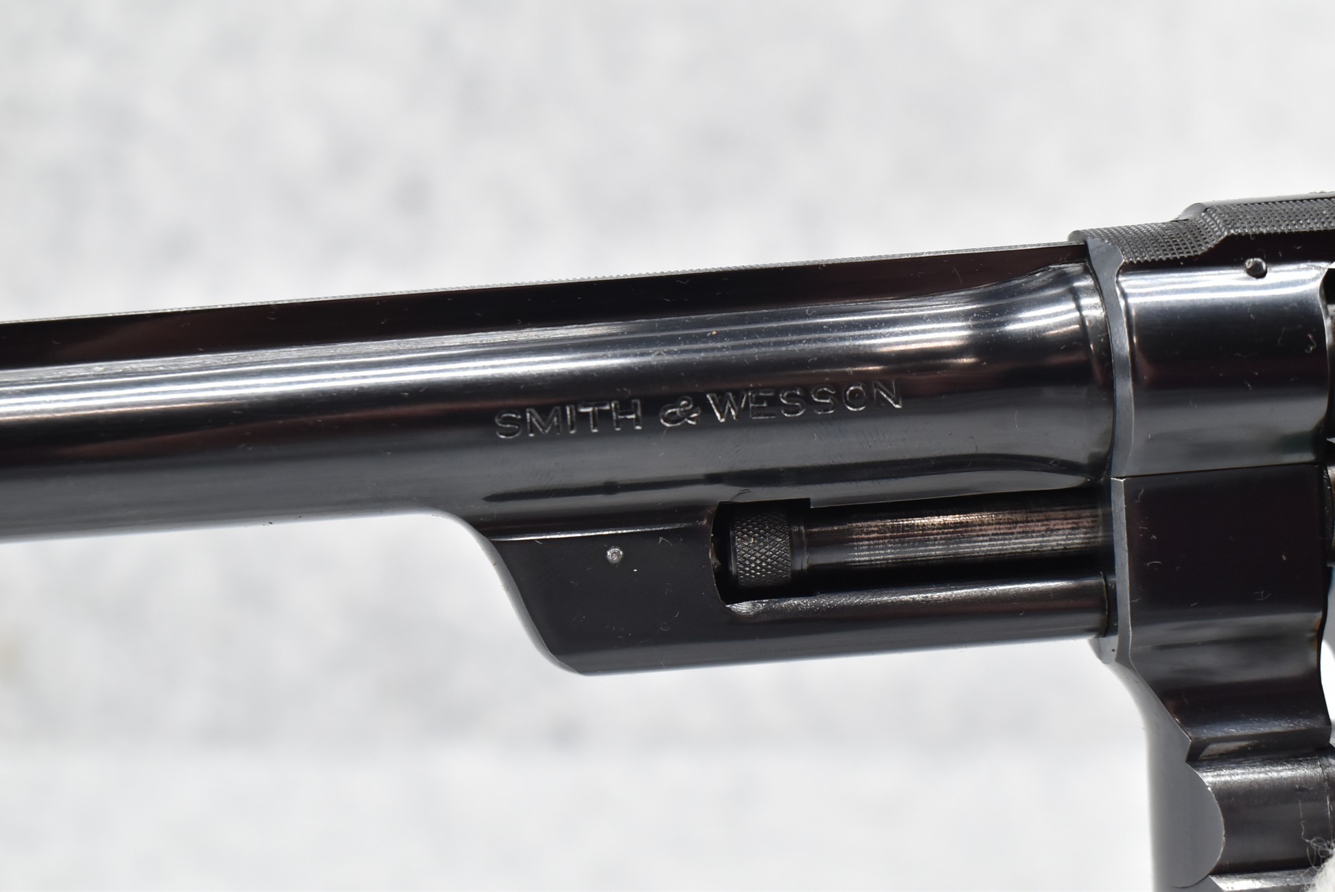 250R. Outstanding! Smith & Wesson .357 Registered Magnum Double Action Revolver – Chambered in .357 Magnum Cal. – Serial #47754 & Registered No. 865 – Gun Has a 6 ½” Barrel w/Finely Checkered Top Strap w/Pinned Partridge Front Sight & Adjustable Square Notch Rear Sights – This Revolver Retains an Excellent Amount of Original Blued Finish as Well as Vivid Case Colors on the Hammer & Trigger – Gun is Stocked w/Factory Diamond Checkered Square Butt Walnut Grips w/Silver S&W Medallion – Serial Numbers Match on Butt, Inside of Ejector Rod Shroud & on the Back of the Cylinder! – Registration Number is Stamped on the Yoke as “REG. 865” – These .357 Registered Magnums Were Introduced in 1935 & Temporarily Ceased in 1939 to Allow Smith & Wesson to Turn Their Attention to the War Effort. Every Revolver Was Manufactured to the Individuals Specifications & A Card Was Enclosed w/Each Gun. Once the Registration Card Was Filled Out & Returned, the Owner Received a Registration Certificate w/Their Name & Their Specific Gun’s Specifications. Accompanying This Gun is the Original Registration Certificate Stating the Original Owners Name, the Registration Number, Serial Number, Barrel Length, Front & Rear Sights, Single & Double Action Trigger Pulls, What Yardage it Was Sighted in at, Hold & Ammo Used – Even Scarcer Than Having the Certificate is Having the Original Shipping Tube the Certificate Was Shipped in, Which This Gun Does! This Gun is Also Accompanied by a Smith & Wesson Factory Letter Confirming its Features as Well as Copies from Smith & Wesson of the Original Correspondence Between the Original Purchaser & Smith & Wesson! This is Truly a Rare Ensemble & a Must for Any Smith & Wesson Collector!!