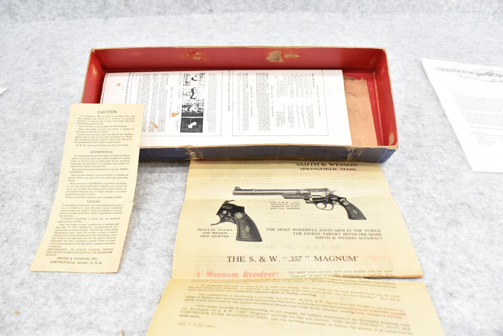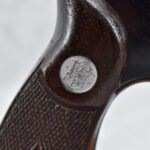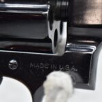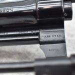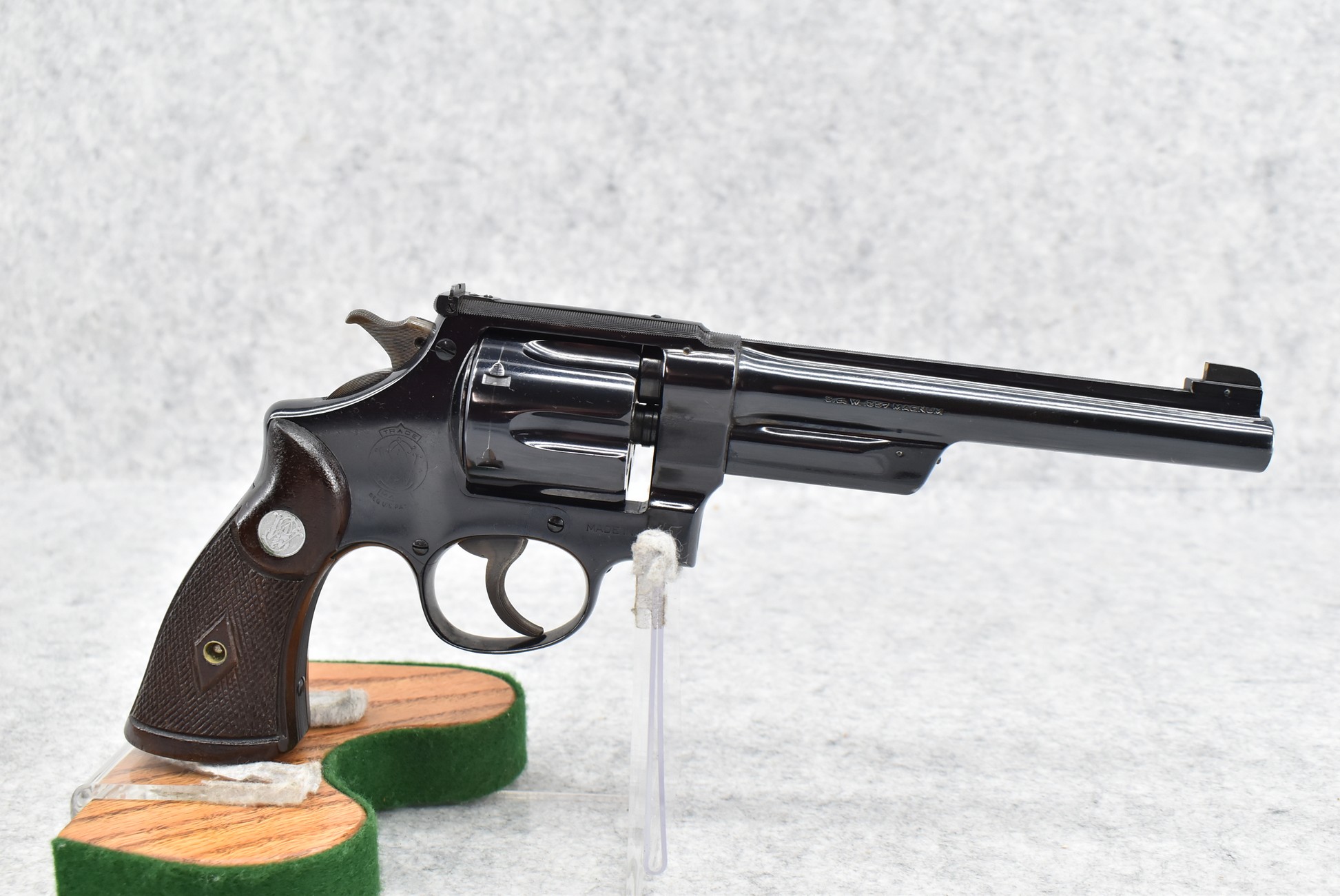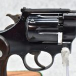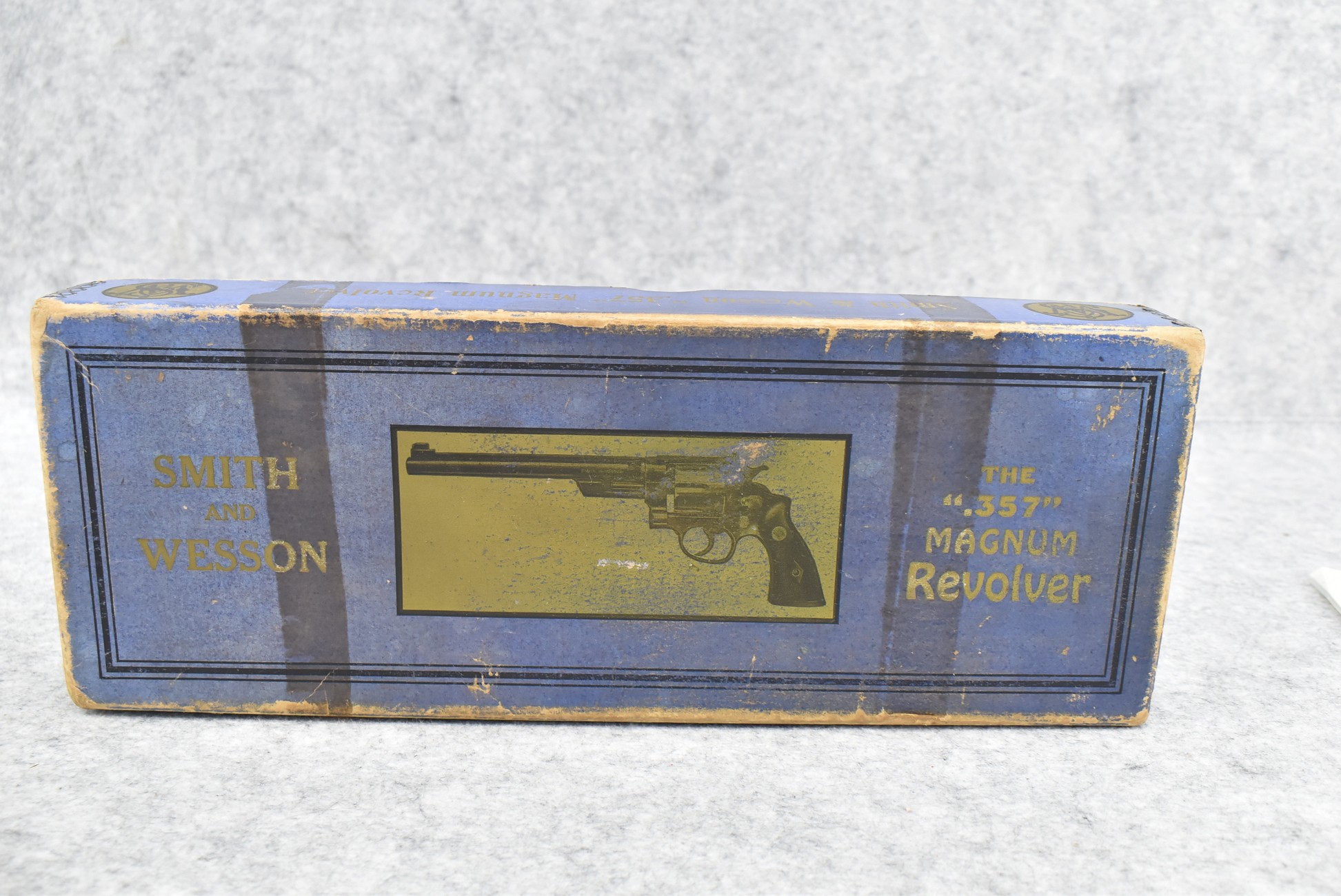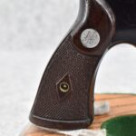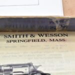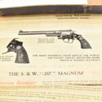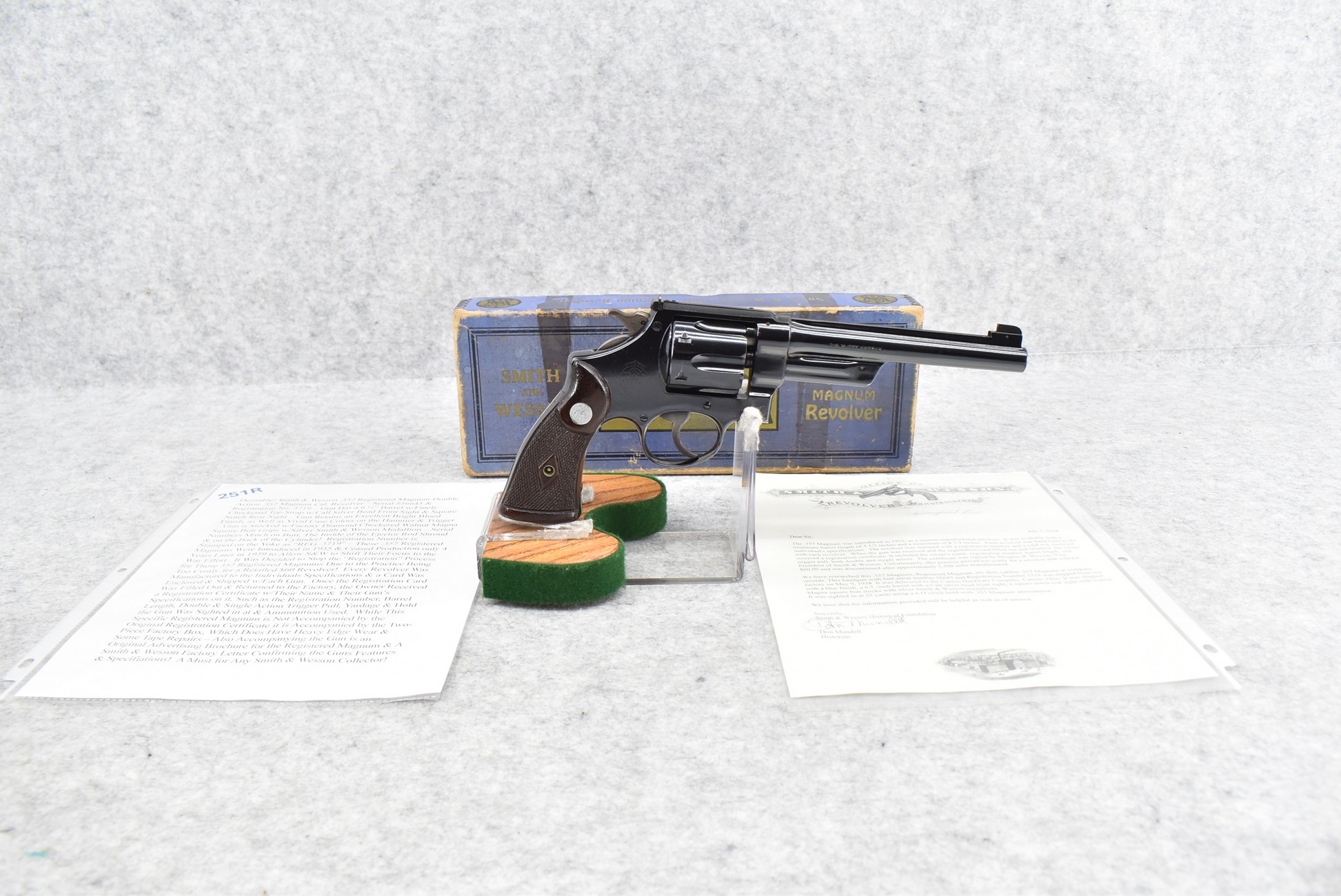 251R. Desirable! Smith & Wesson .357 Registered Magnum Double Action .357 Magnum Cal. Revolver – Serial #56645 & Registration No. 3719 – Gun Has a 6 ½” Barrel w/Finely Checkered Top Strap w/Call Silver Bead Front Sight & Square Notch Rear Sight – Gun Retains an Excellent Bright Blued Finish, as Well as Vivid Case Colors on the Hammer & Trigger – Gun is Stocked w/Factory Diamond Checkered Walnut Magna Square Butt Grips w/Silver Smith & Wesson Medallion – Serial Numbers Match on Butt, The Inside of the Ejector Rod Shroud & on the Back of the Cylinder! Registration Number is Stamped on the Yoke as “REG. 3719” – These .357 Registered Magnums Were Introduced in 1935 & Ceased Production only 4 Years Later in 1939 to Allow S&W to Shift Their Focus to the War Effort. It Was Decided to Stop the “Registration” Process for These 357 Registered Magnums Due to the Practice Being Too Costly for a Retailed $60 Revolver! Every Revolver Was Manufactured to the Individuals Specifications & a Card Was Enclosed & Shipped w/Each Gun. Once the Registration Card Was Filled Out & Returned to the Factory, the Owner Received a Registration Certificate w/Their Name & Their Gun’s Specifications on it, Such as the Registration Number, Barrel Length, Double & Single Action Trigger Pull, Yardage & Hold the Gun Was Sighted in at & Ammunition Used. While This Specific Registered Magnum is Not Accompanied by the Original Registration Certificate it is Accompanied by the Two-Piece Factory Box, Which Does Have Heavy Edge Wear & Some Tape Repairs – Also Accompanying the Gun is an Original Advertising Brochure for the Registered Magnum & A Smith & Wesson Factory Letter Confirming the Guns Features & Specifiations! A Must for Any Smith & Wesson Collector!