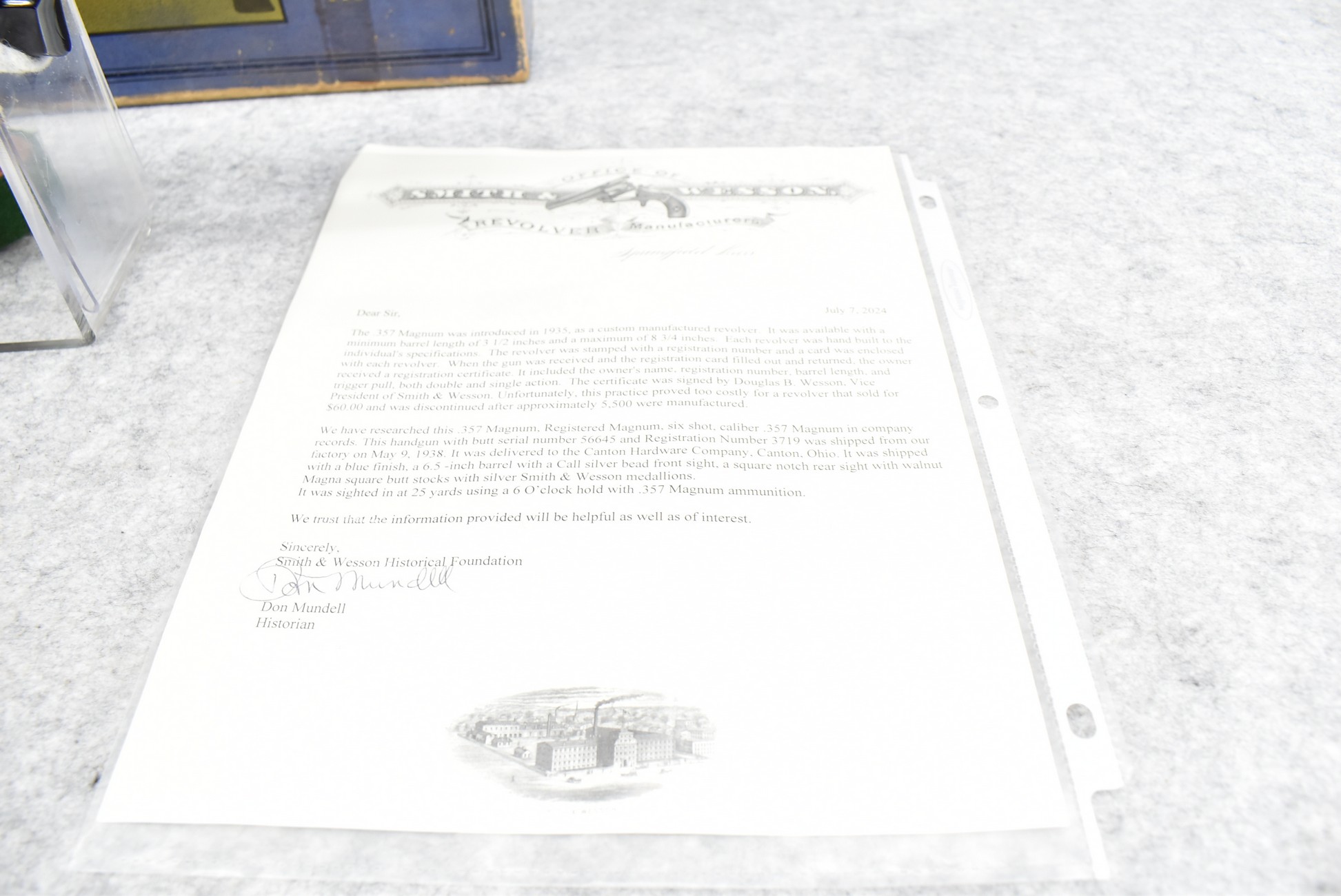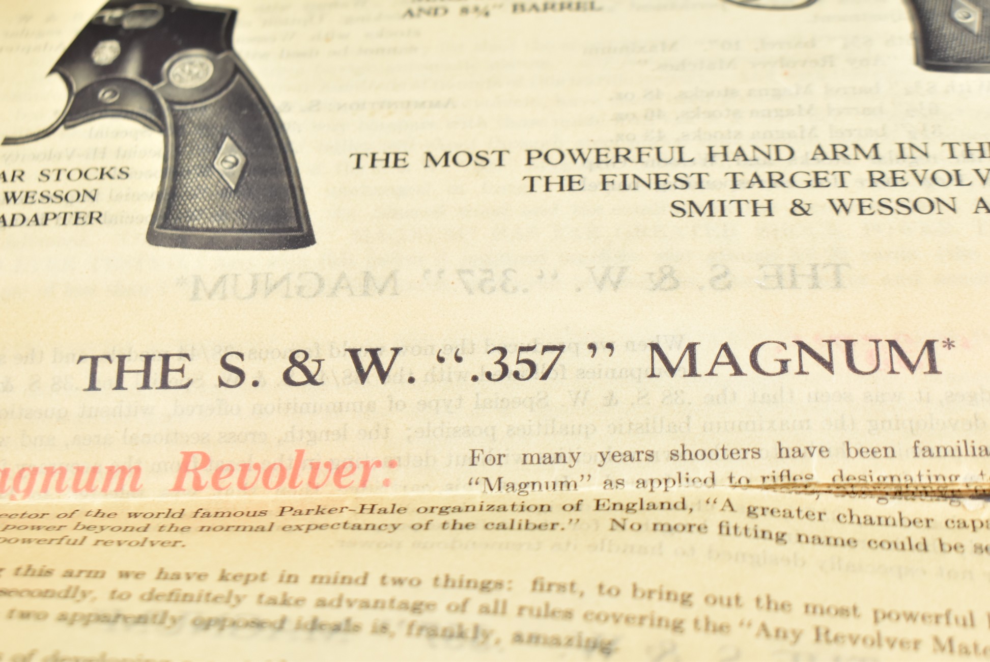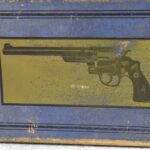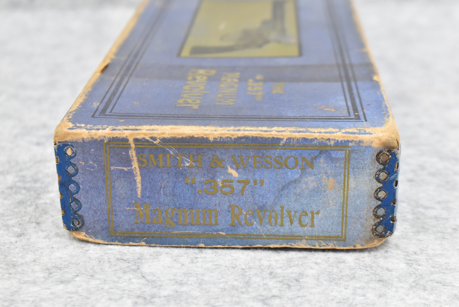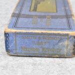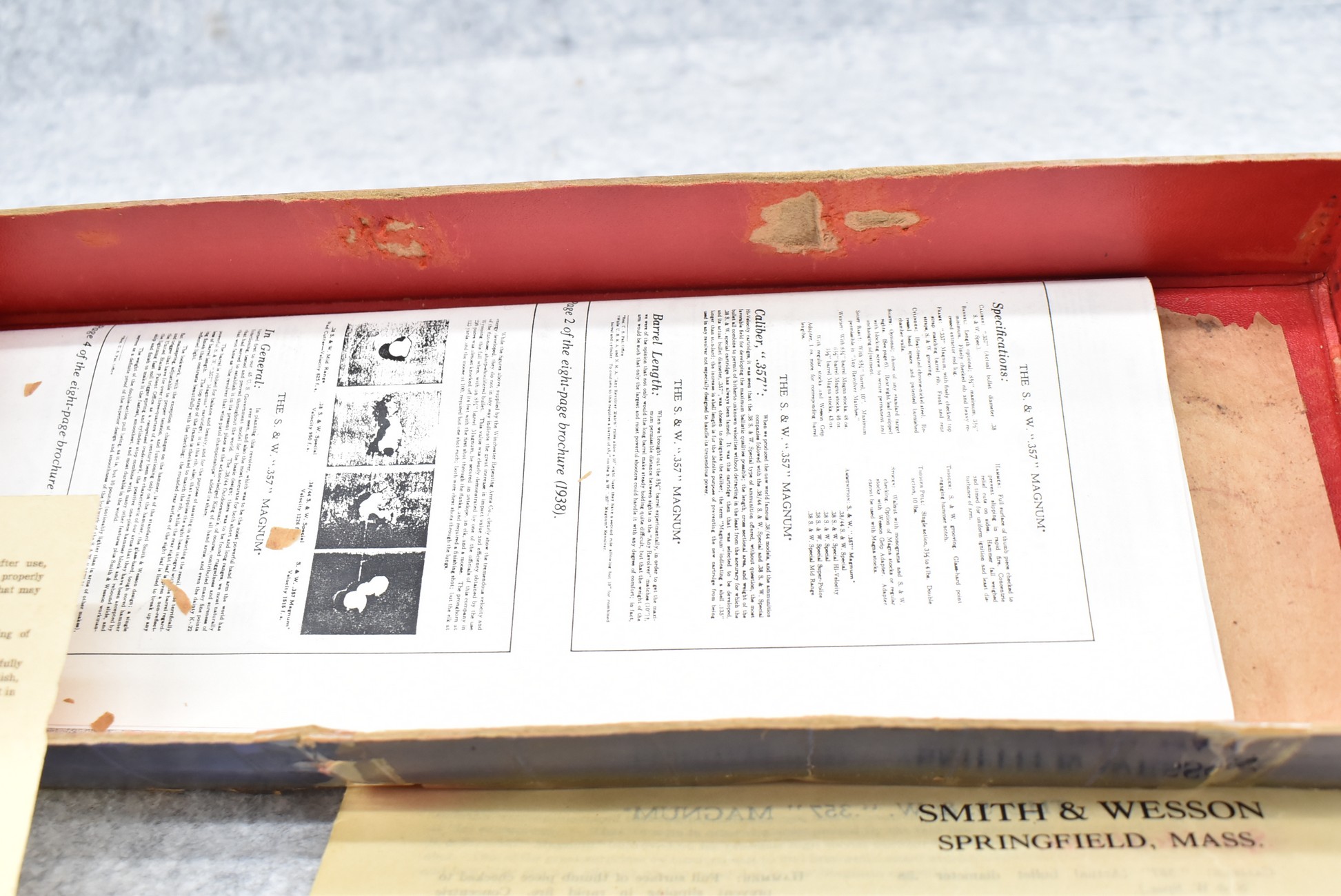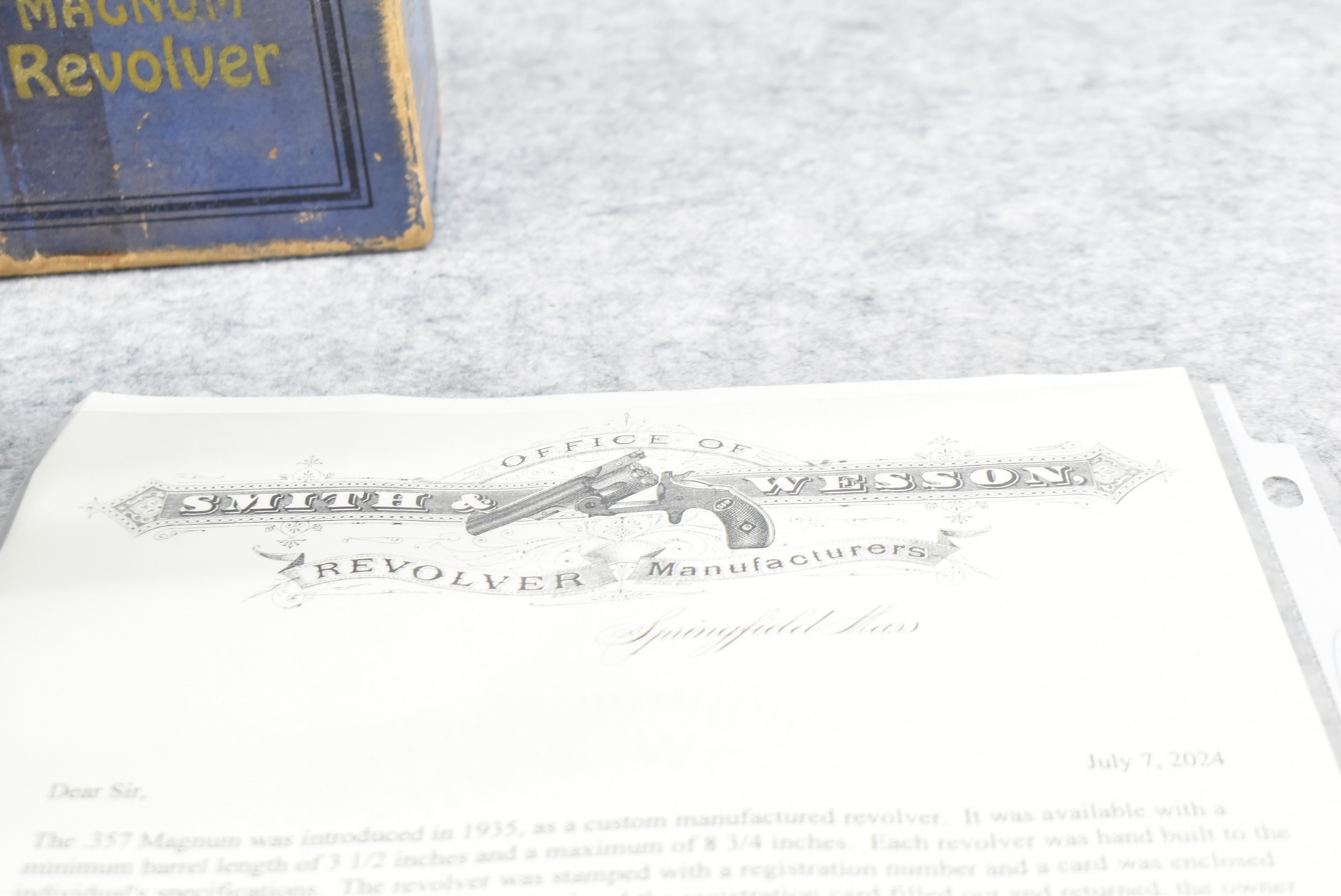 251R. Desirable! Smith & Wesson .357 Registered Magnum Double Action .357 Magnum Cal. Revolver – Serial #56645 & Registration No. 3719 – Gun Has a 6 ½” Barrel w/Finely Checkered Top Strap w/Call Silver Bead Front Sight & Square Notch Rear Sight – Gun Retains an Excellent Bright Blued Finish, as Well as Vivid Case Colors on the Hammer & Trigger – Gun is Stocked w/Factory Diamond Checkered Walnut Magna Square Butt Grips w/Silver Smith & Wesson Medallion – Serial Numbers Match on Butt, The Inside of the Ejector Rod Shroud & on the Back of the Cylinder! Registration Number is Stamped on the Yoke as “REG. 3719” – These .357 Registered Magnums Were Introduced in 1935 & Ceased Production only 4 Years Later in 1939 to Allow S&W to Shift Their Focus to the War Effort. It Was Decided to Stop the “Registration” Process for These 357 Registered Magnums Due to the Practice Being Too Costly for a Retailed $60 Revolver! Every Revolver Was Manufactured to the Individuals Specifications & a Card Was Enclosed & Shipped w/Each Gun. Once the Registration Card Was Filled Out & Returned to the Factory, the Owner Received a Registration Certificate w/Their Name & Their Gun’s Specifications on it, Such as the Registration Number, Barrel Length, Double & Single Action Trigger Pull, Yardage & Hold the Gun Was Sighted in at & Ammunition Used. While This Specific Registered Magnum is Not Accompanied by the Original Registration Certificate it is Accompanied by the Two-Piece Factory Box, Which Does Have Heavy Edge Wear & Some Tape Repairs – Also Accompanying the Gun is an Original Advertising Brochure for the Registered Magnum & A Smith & Wesson Factory Letter Confirming the Guns Features & Specifiations! A Must for Any Smith & Wesson Collector!