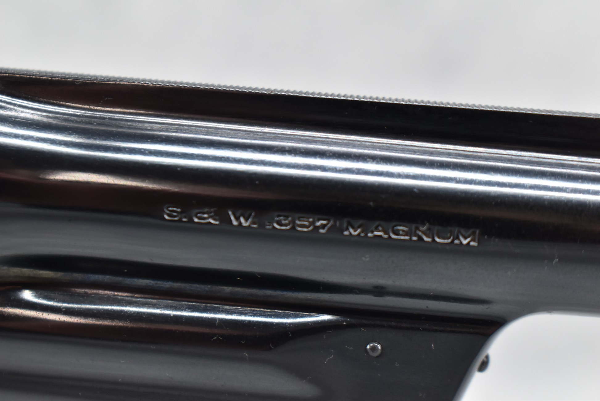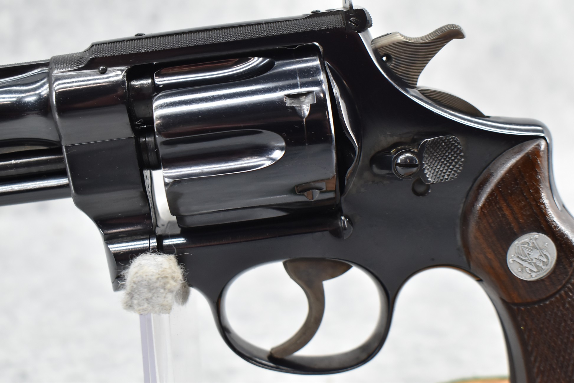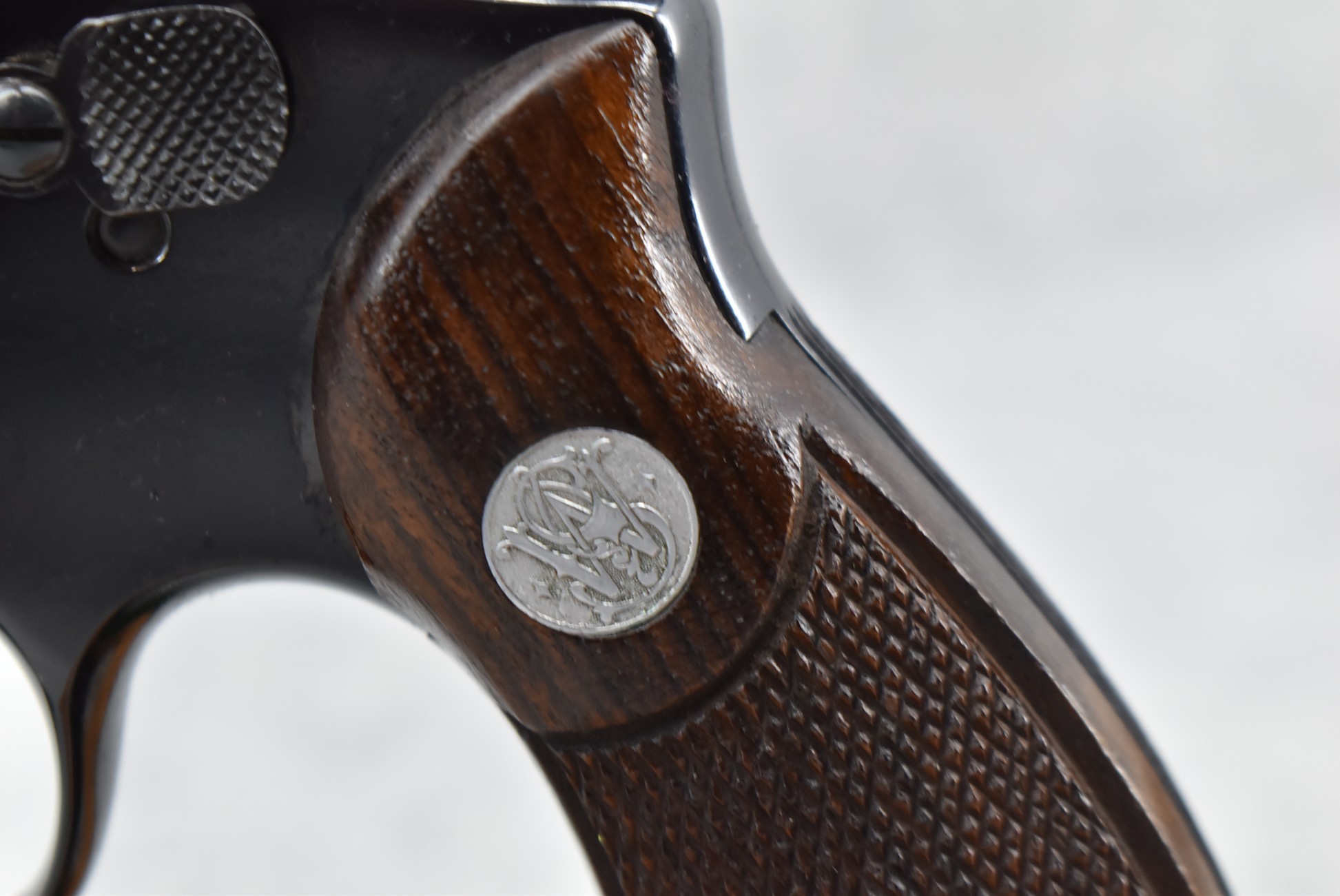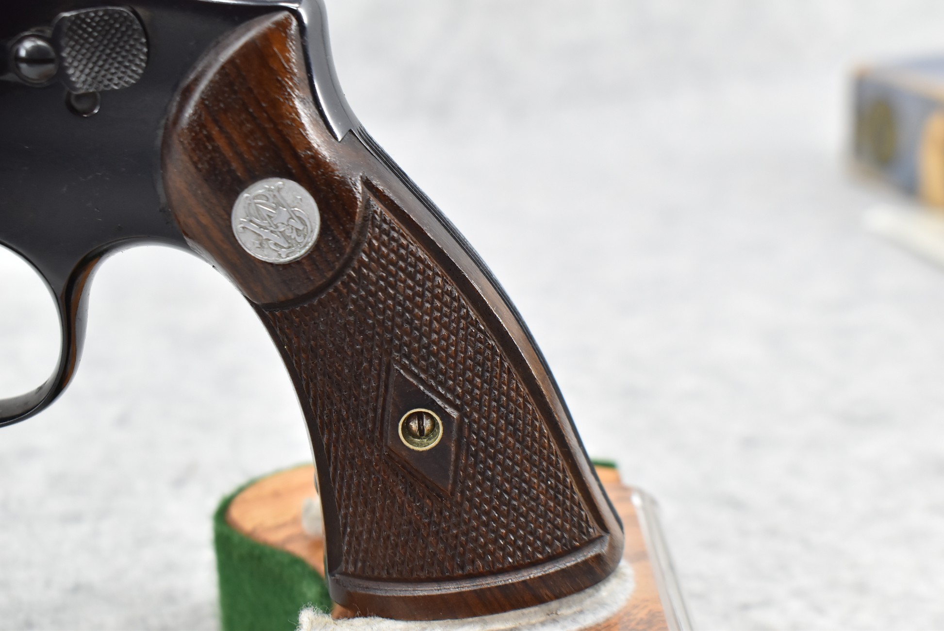 251R. Desirable! Smith & Wesson .357 Registered Magnum Double Action .357 Magnum Cal. Revolver – Serial #56645 & Registration No. 3719 – Gun Has a 6 ½” Barrel w/Finely Checkered Top Strap w/Call Silver Bead Front Sight & Square Notch Rear Sight – Gun Retains an Excellent Bright Blued Finish, as Well as Vivid Case Colors on the Hammer & Trigger – Gun is Stocked w/Factory Diamond Checkered Walnut Magna Square Butt Grips w/Silver Smith & Wesson Medallion – Serial Numbers Match on Butt, The Inside of the Ejector Rod Shroud & on the Back of the Cylinder! Registration Number is Stamped on the Yoke as “REG. 3719” – These .357 Registered Magnums Were Introduced in 1935 & Ceased Production only 4 Years Later in 1939 to Allow S&W to Shift Their Focus to the War Effort. It Was Decided to Stop the “Registration” Process for These 357 Registered Magnums Due to the Practice Being Too Costly for a Retailed $60 Revolver! Every Revolver Was Manufactured to the Individuals Specifications & a Card Was Enclosed & Shipped w/Each Gun. Once the Registration Card Was Filled Out & Returned to the Factory, the Owner Received a Registration Certificate w/Their Name & Their Gun’s Specifications on it, Such as the Registration Number, Barrel Length, Double & Single Action Trigger Pull, Yardage & Hold the Gun Was Sighted in at & Ammunition Used. While This Specific Registered Magnum is Not Accompanied by the Original Registration Certificate it is Accompanied by the Two-Piece Factory Box, Which Does Have Heavy Edge Wear & Some Tape Repairs – Also Accompanying the Gun is an Original Advertising Brochure for the Registered Magnum & A Smith & Wesson Factory Letter Confirming the Guns Features & Specifiations! A Must for Any Smith & Wesson Collector!