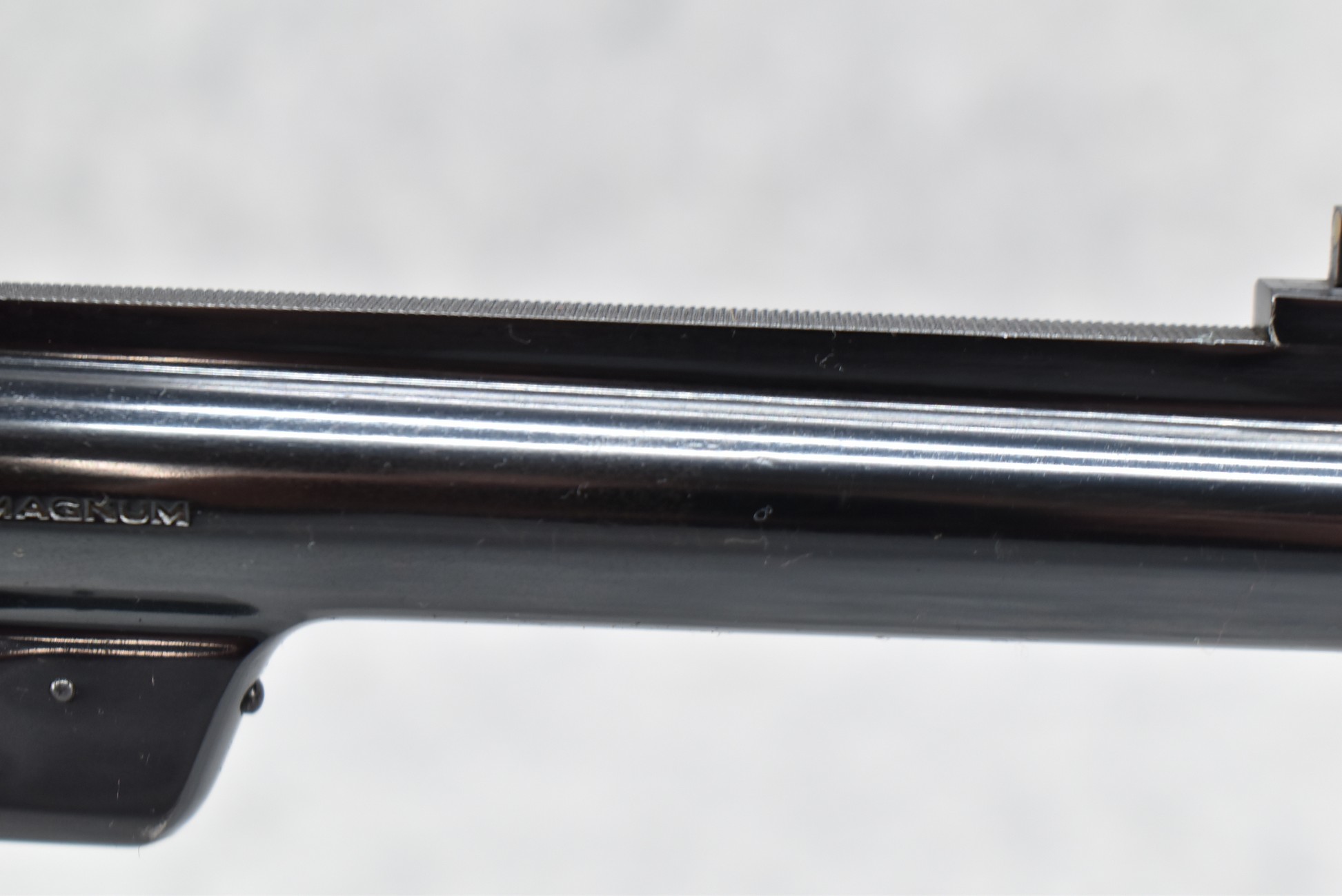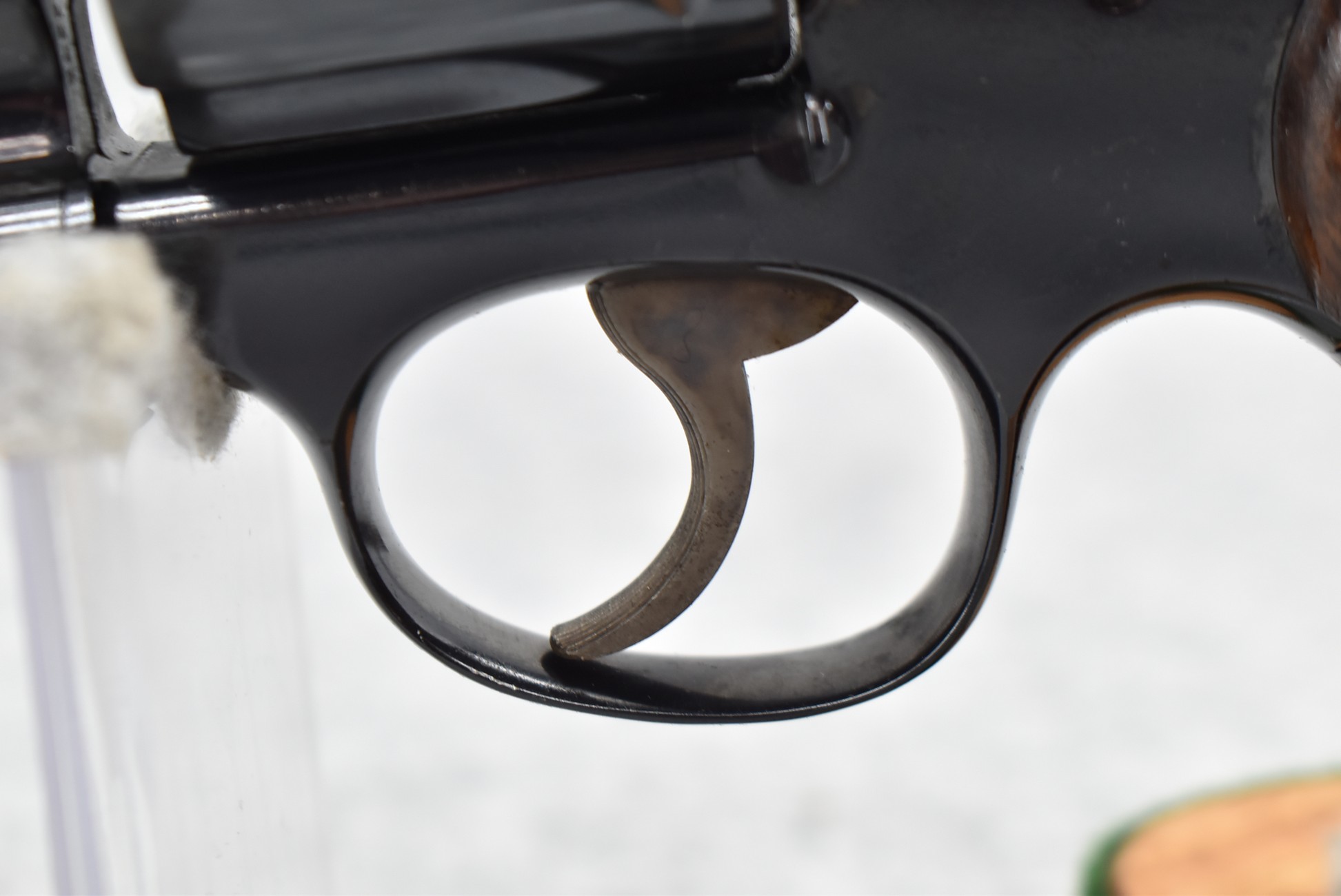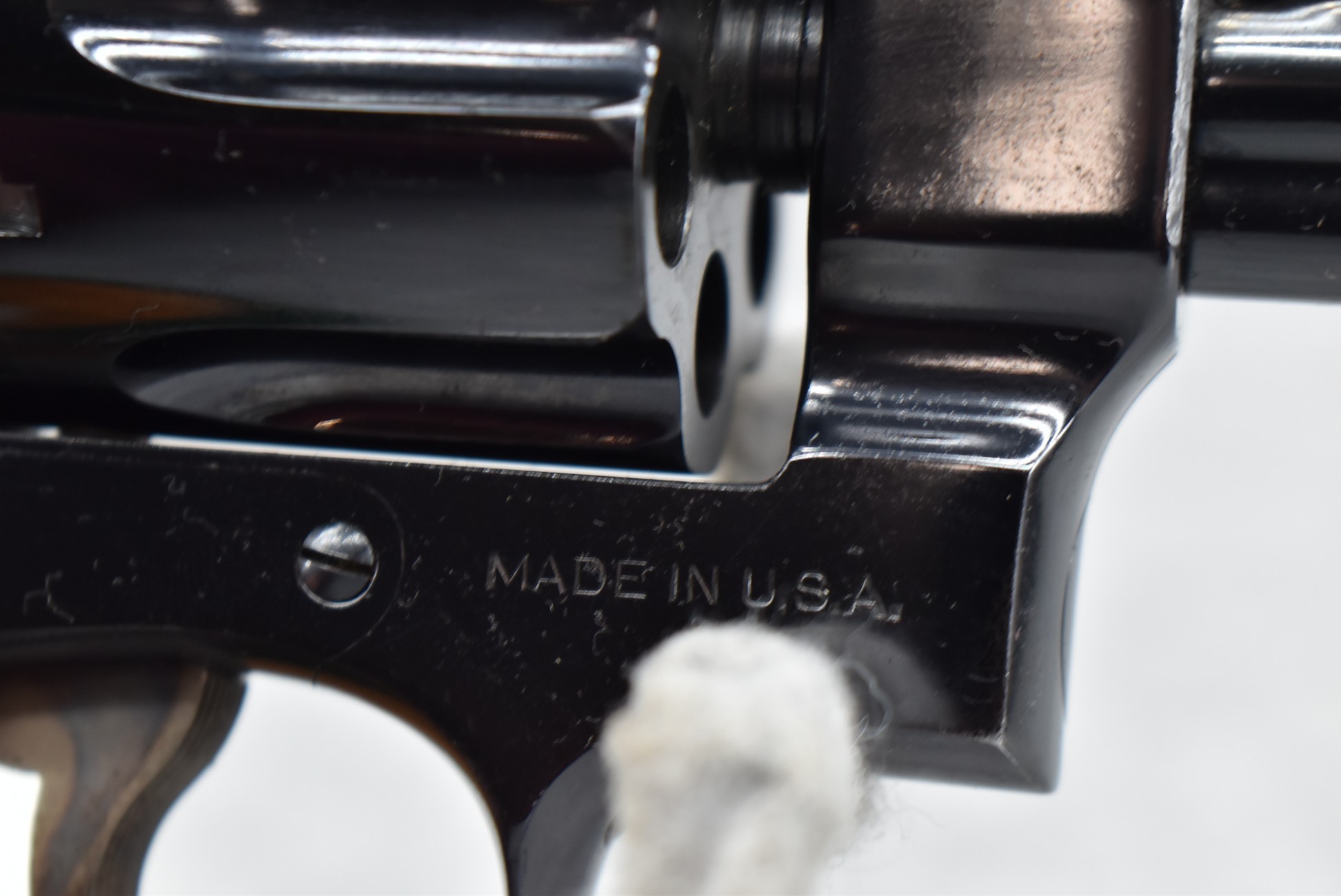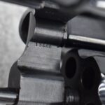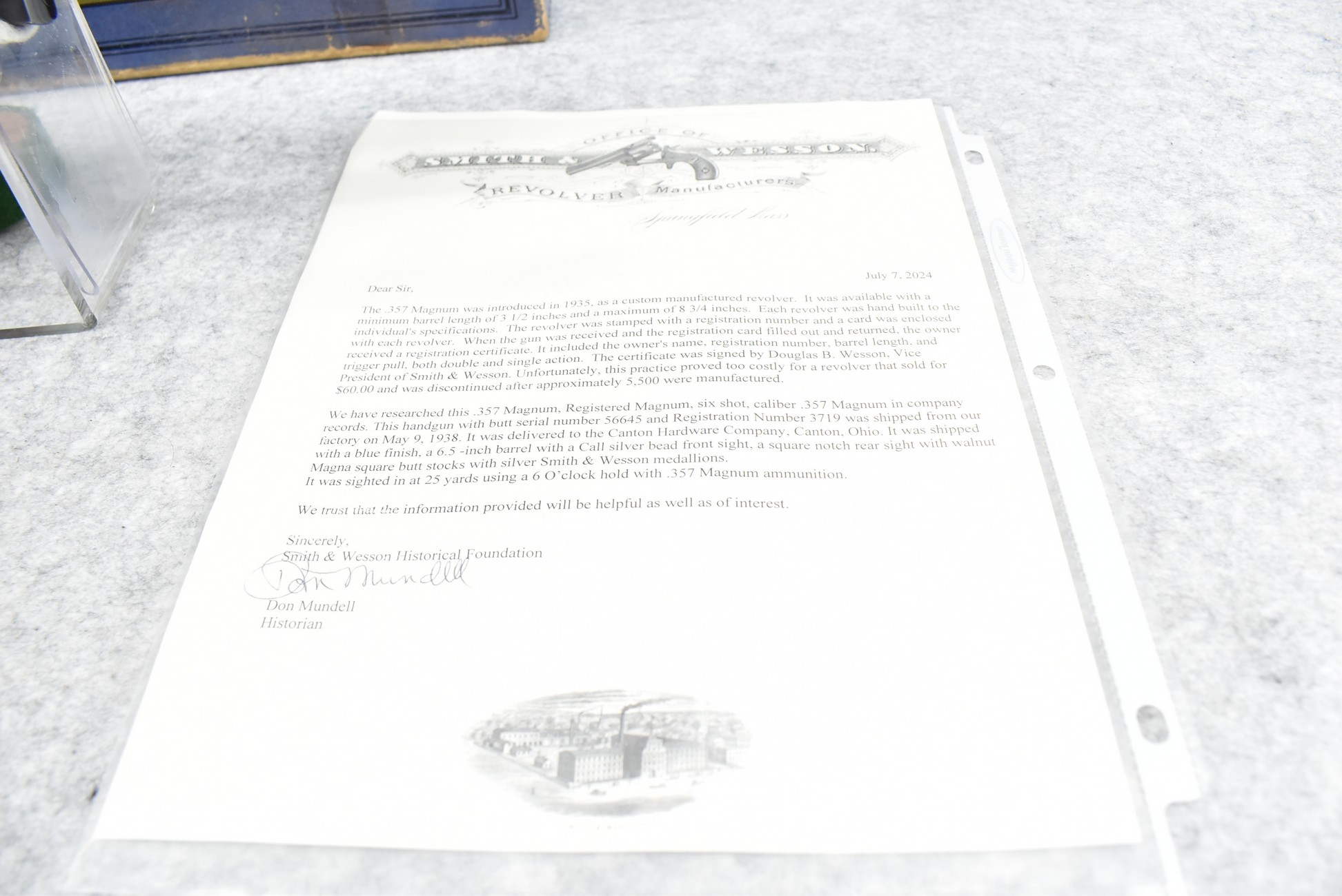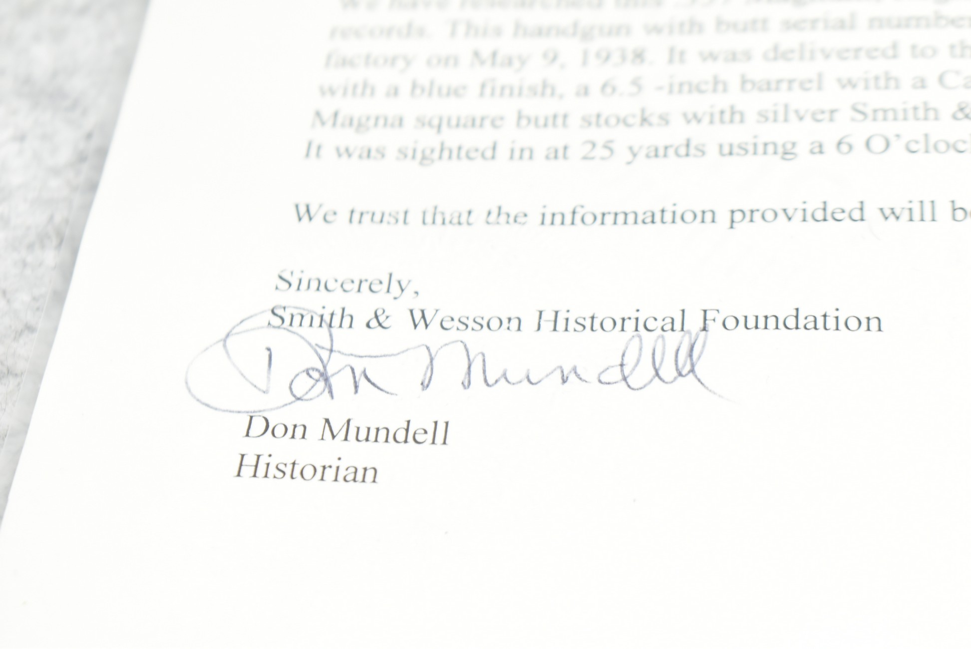 251R. Desirable! Smith & Wesson .357 Registered Magnum Double Action .357 Magnum Cal. Revolver – Serial #56645 & Registration No. 3719 – Gun Has a 6 ½” Barrel w/Finely Checkered Top Strap w/Call Silver Bead Front Sight & Square Notch Rear Sight – Gun Retains an Excellent Bright Blued Finish, as Well as Vivid Case Colors on the Hammer & Trigger – Gun is Stocked w/Factory Diamond Checkered Walnut Magna Square Butt Grips w/Silver Smith & Wesson Medallion – Serial Numbers Match on Butt, The Inside of the Ejector Rod Shroud & on the Back of the Cylinder! Registration Number is Stamped on the Yoke as “REG. 3719” – These .357 Registered Magnums Were Introduced in 1935 & Ceased Production only 4 Years Later in 1939 to Allow S&W to Shift Their Focus to the War Effort. It Was Decided to Stop the “Registration” Process for These 357 Registered Magnums Due to the Practice Being Too Costly for a Retailed $60 Revolver! Every Revolver Was Manufactured to the Individuals Specifications & a Card Was Enclosed & Shipped w/Each Gun. Once the Registration Card Was Filled Out & Returned to the Factory, the Owner Received a Registration Certificate w/Their Name & Their Gun’s Specifications on it, Such as the Registration Number, Barrel Length, Double & Single Action Trigger Pull, Yardage & Hold the Gun Was Sighted in at & Ammunition Used. While This Specific Registered Magnum is Not Accompanied by the Original Registration Certificate it is Accompanied by the Two-Piece Factory Box, Which Does Have Heavy Edge Wear & Some Tape Repairs – Also Accompanying the Gun is an Original Advertising Brochure for the Registered Magnum & A Smith & Wesson Factory Letter Confirming the Guns Features & Specifiations! A Must for Any Smith & Wesson Collector!