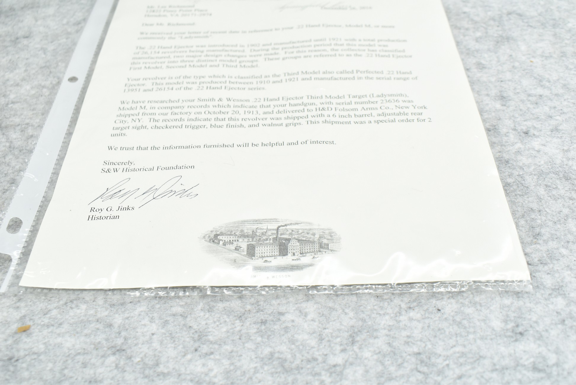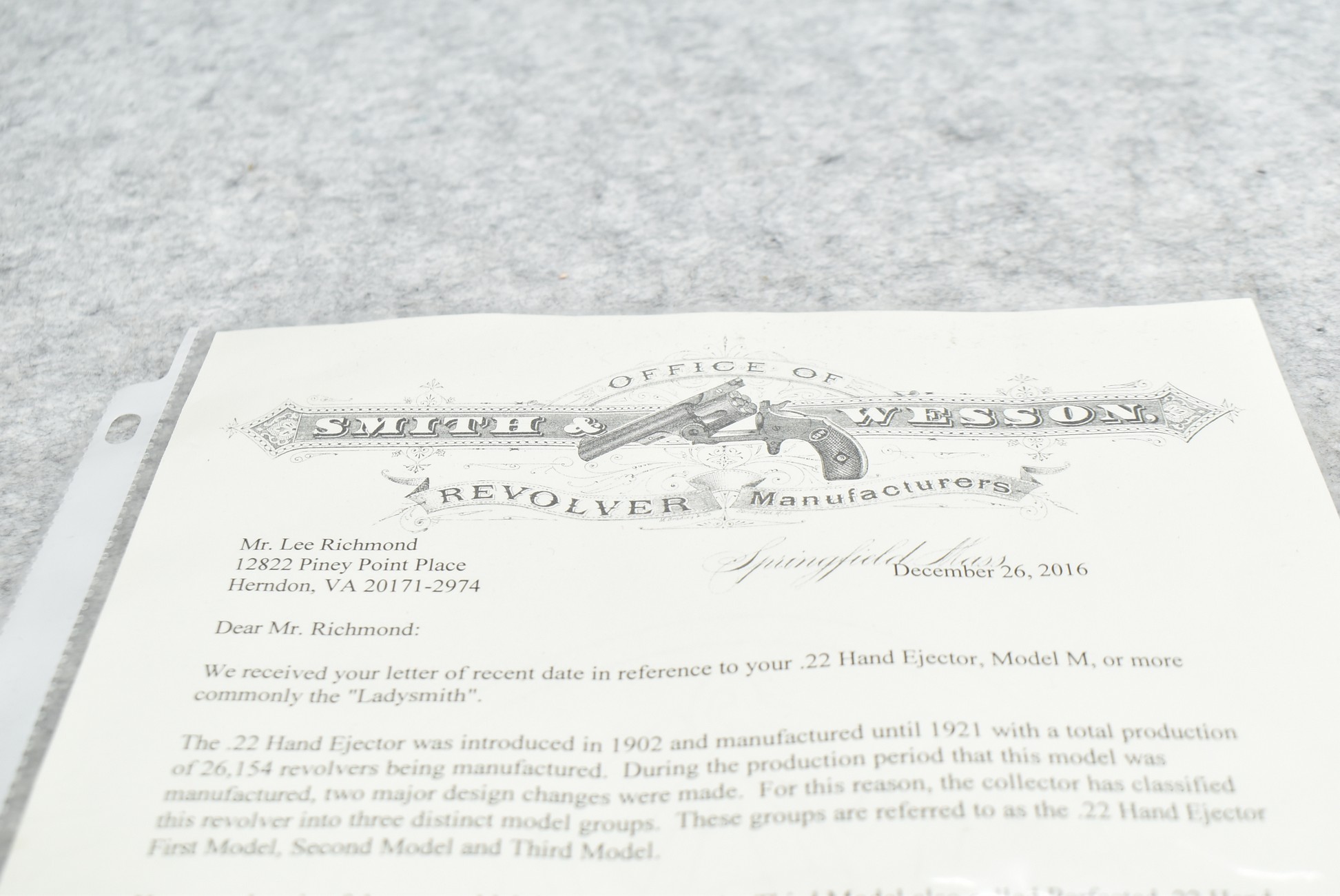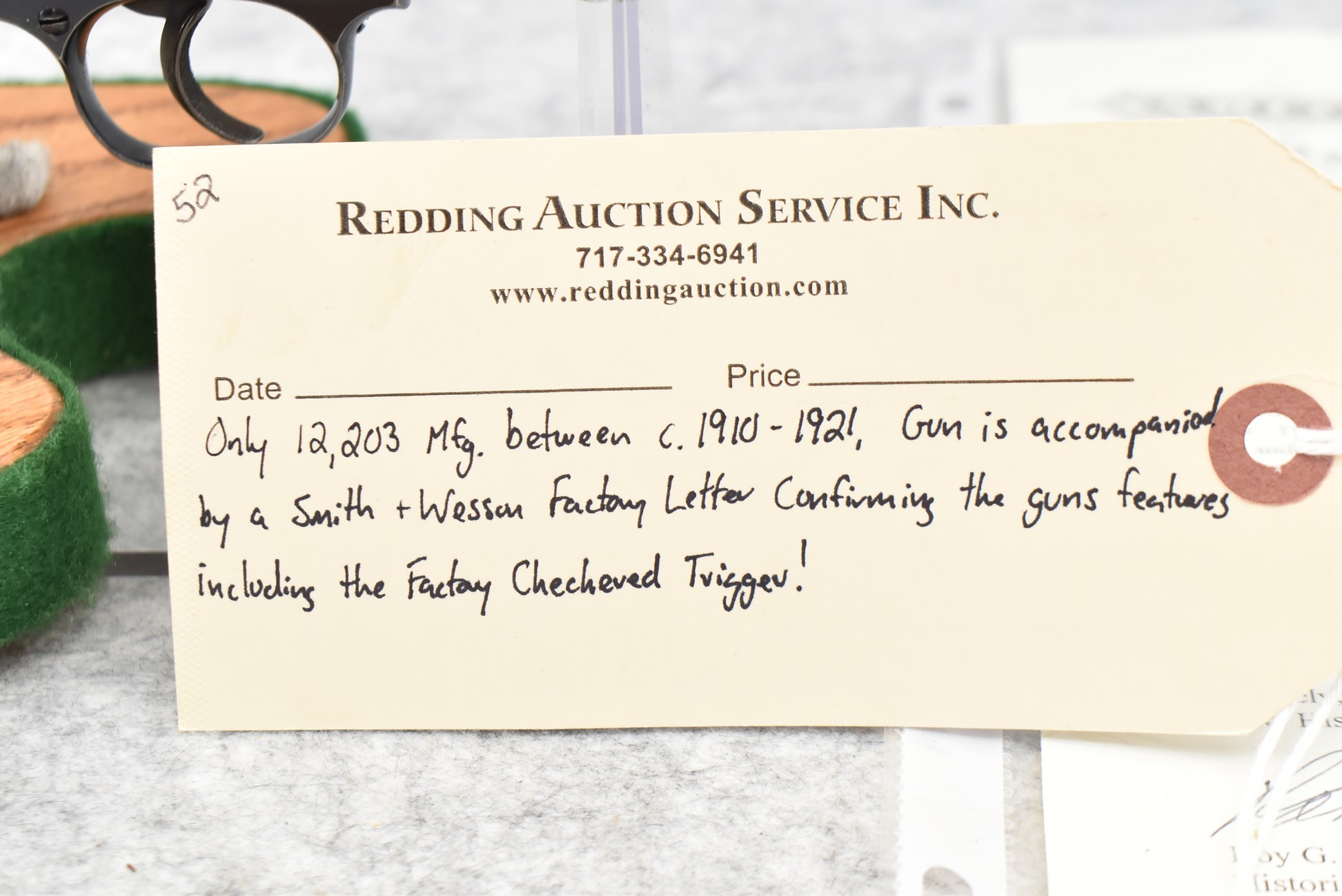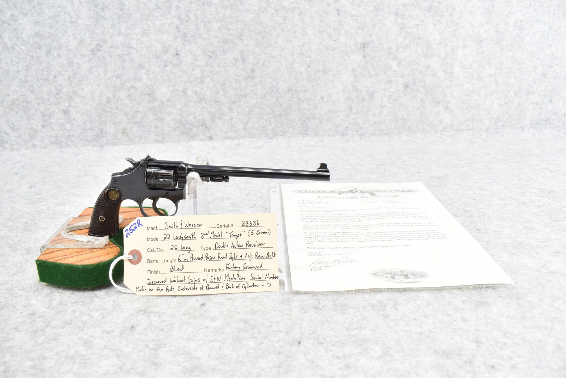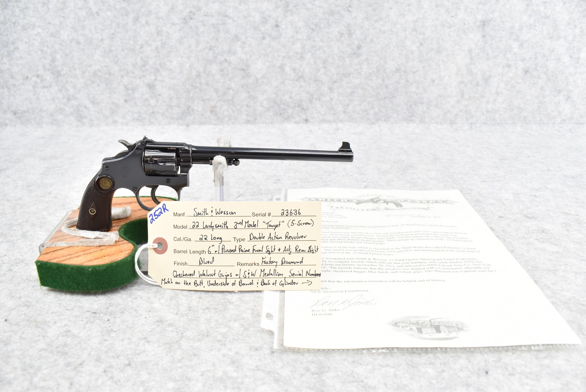 252R. Smith & Wesson – Mod. .22 Ladysmith 3rd Model “Target” (5-Screw) – 22 Long Cal. Double Action Revolver – w/6” Barrel w/Pinned Pained Front Sight & Adj. Rear Sight – Blued Finish – w/Factory Diamond Checkered Walnut Grips w/S&W Medallion – Serial Numbers Match on the Butt, Underside of Barrel & Back of Cylinder – Gun is Accompanied by a Smith & Wesson Factory Letter Confirming the Gun’s Features Including the Factory Special Order Checkered Trigger! – Only 12,203 Mfg. Between Circa 1910-1921