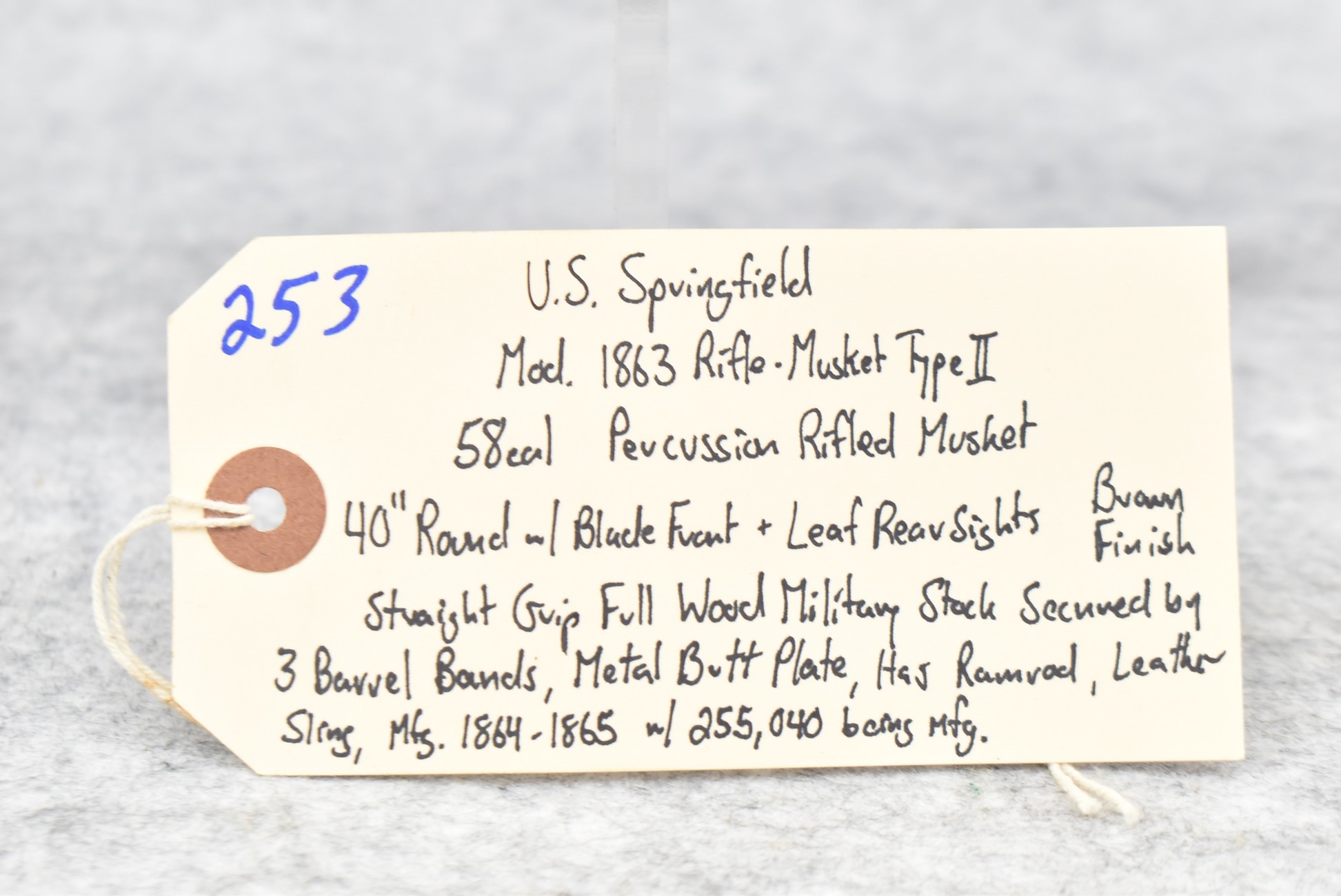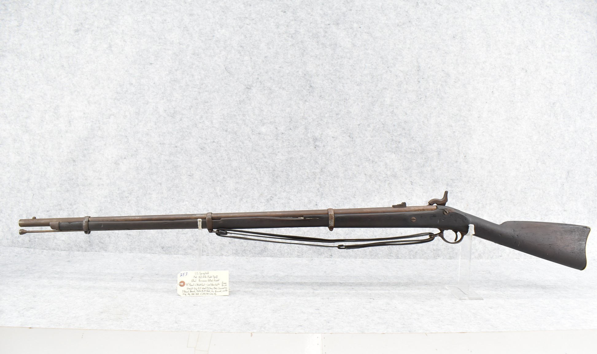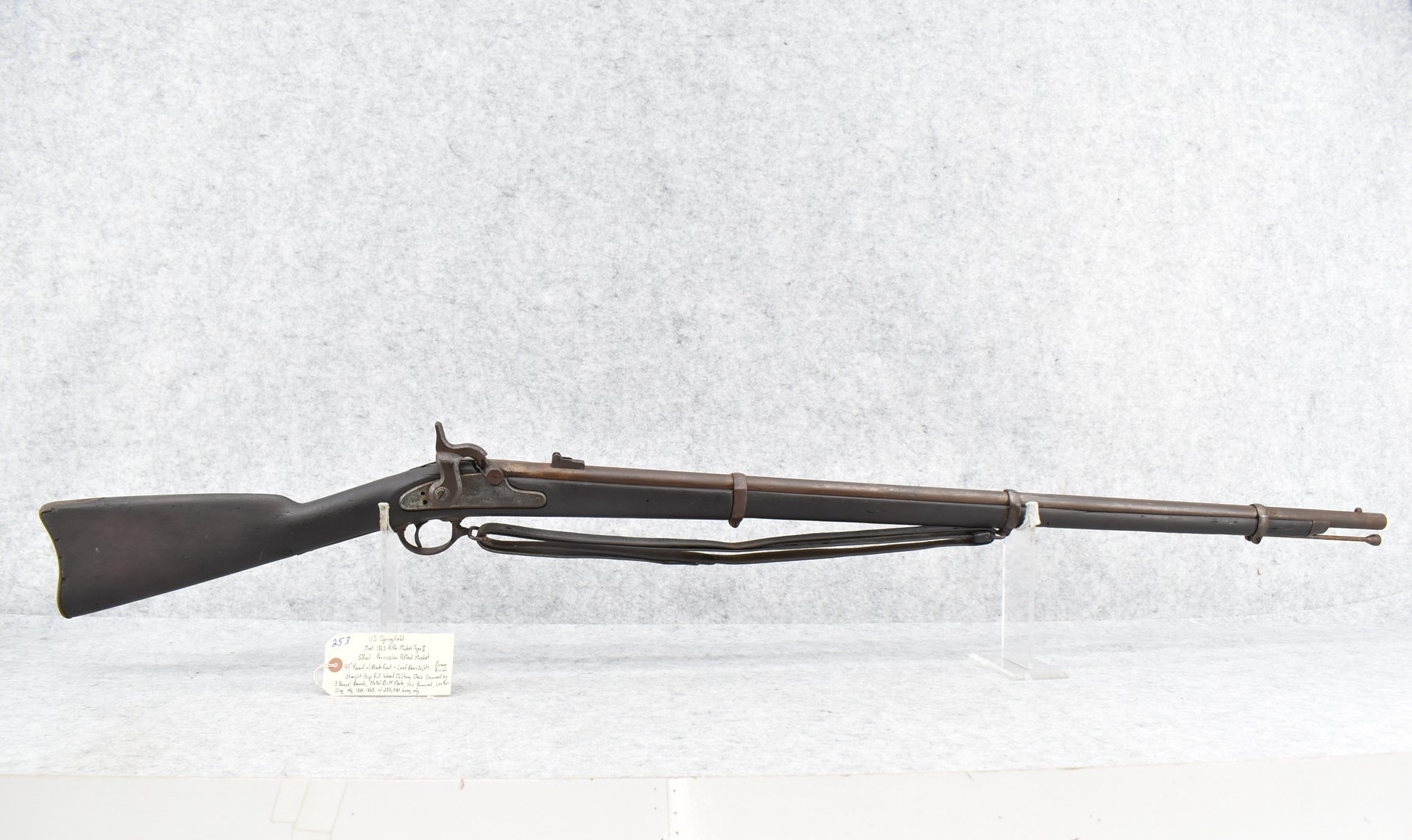 253. U.S. Springfield – Mod. 1863 Rifle-Musket Type II – 58 Cal. Percussion Rifled Musket – w/40” Round Barrel w/Blade Front & Leaf Rear Sights – Brown Finish – w/Straight Grip Full Wood Military Stock Secured by 3 Barrel Bands w/Metal Butt Plate – w/Leather Sling – w/Ram Rod – Mfg. Between 1864-1865 w/255,040 Being Mfg