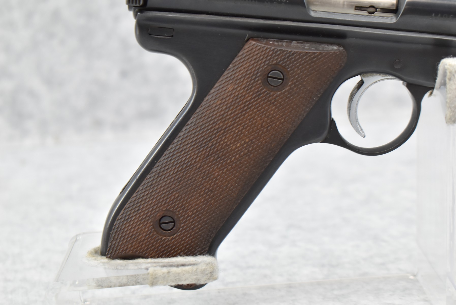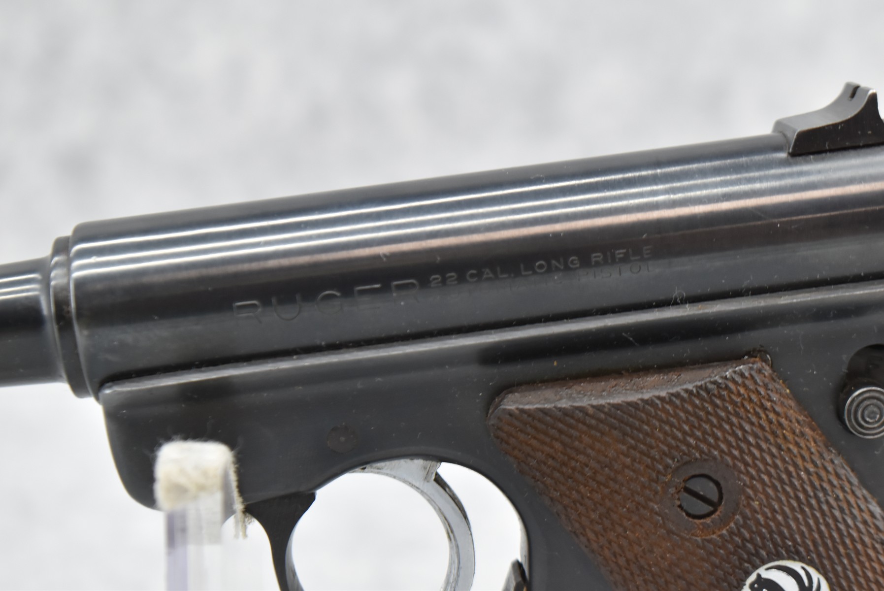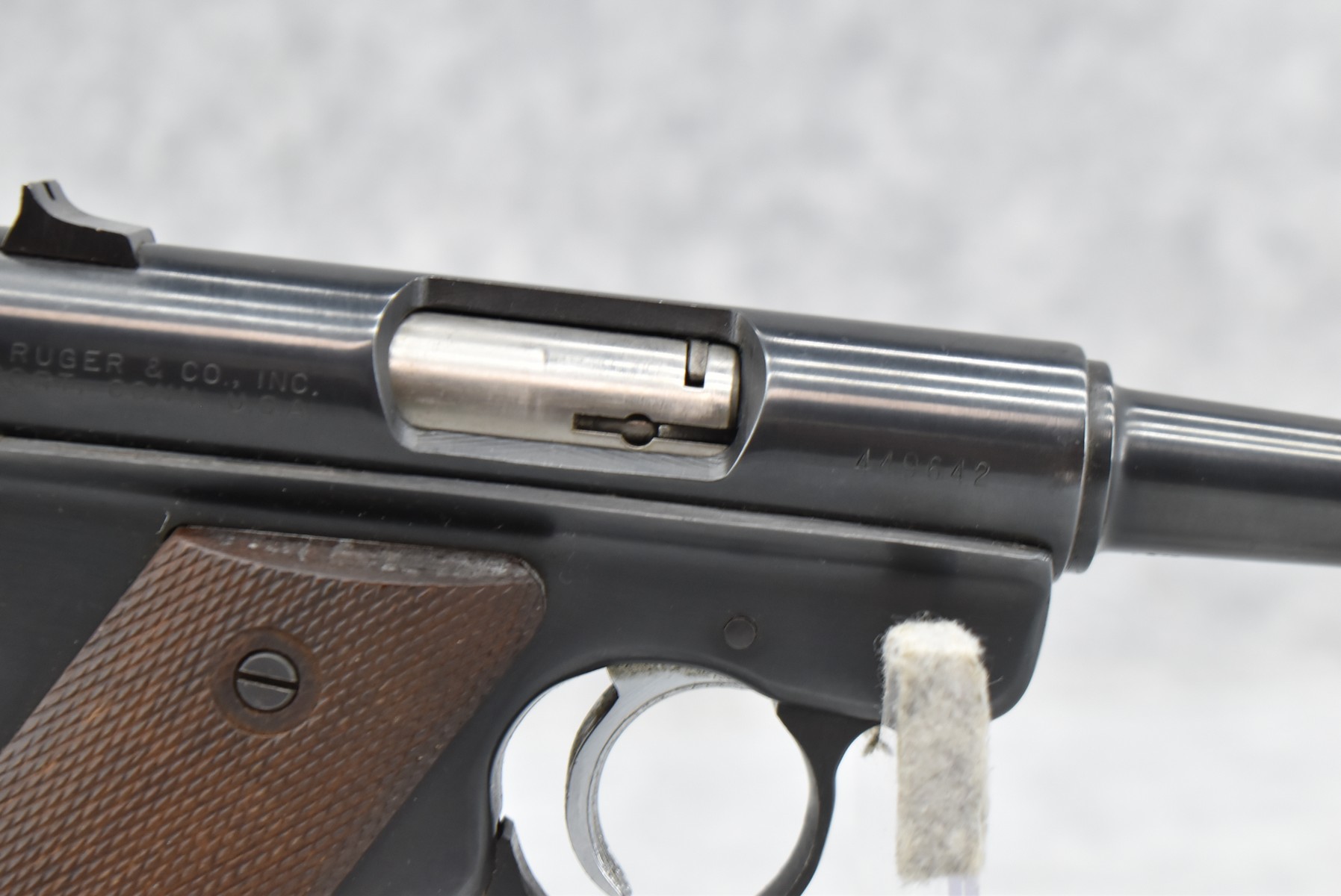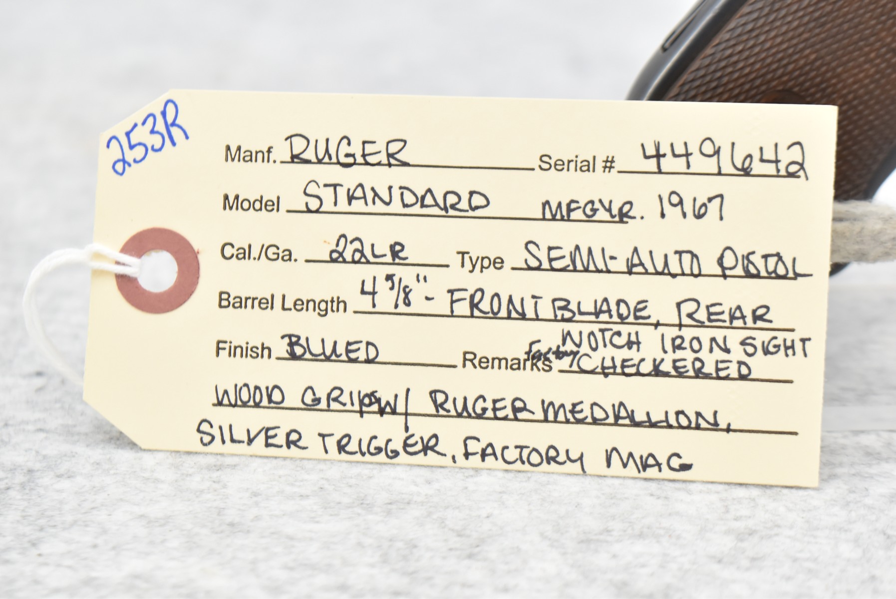 253R.     Ruger – Mod. Standard – 22LR Cal. Semi-Auto Pistol – w/4 5/8” Barrel w/Blade Front and Rear Notch Iron Sights – Blued Finish – w/Factory Checkered Wood Grips w/Ruger Medallion – w/Factory Magazine