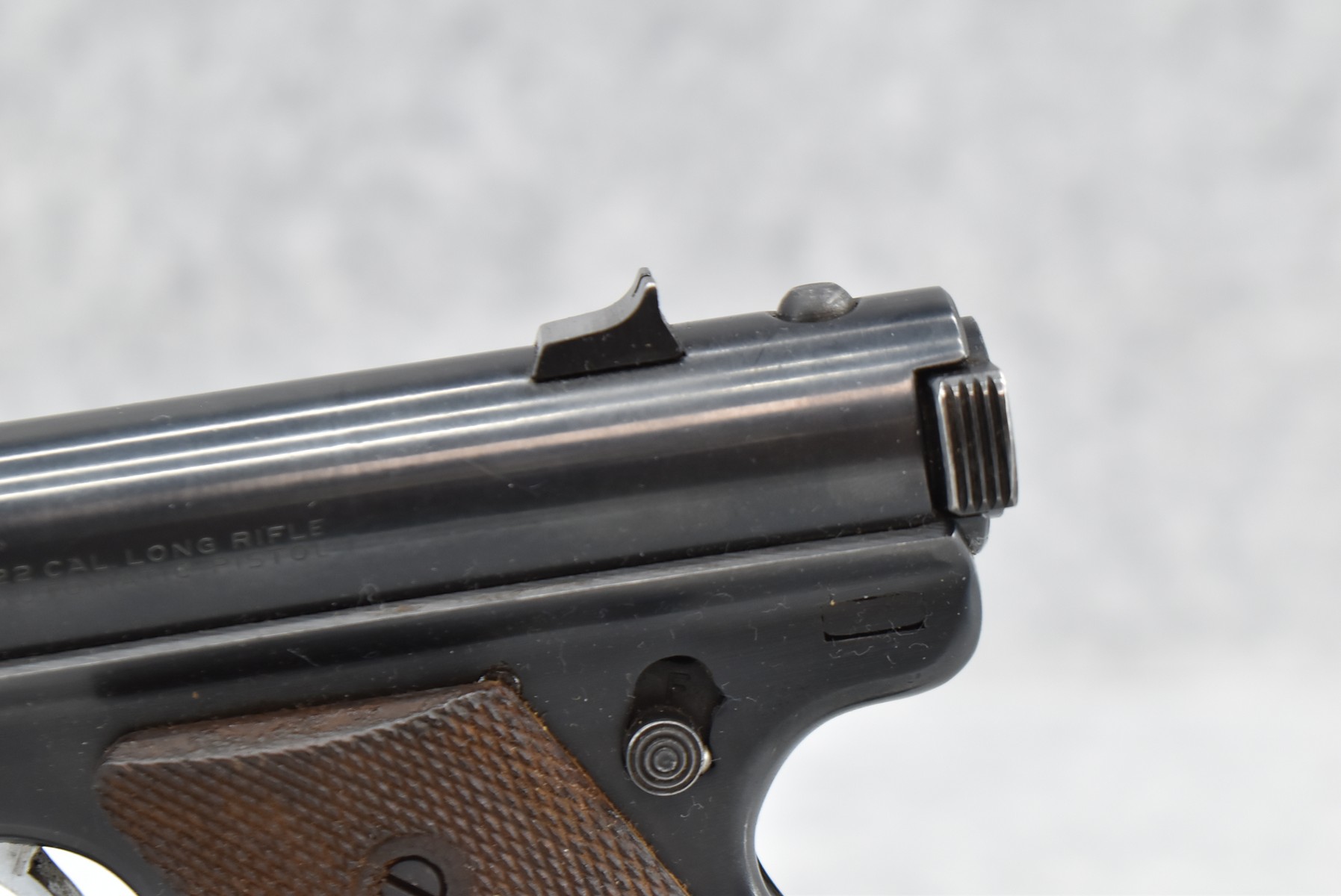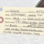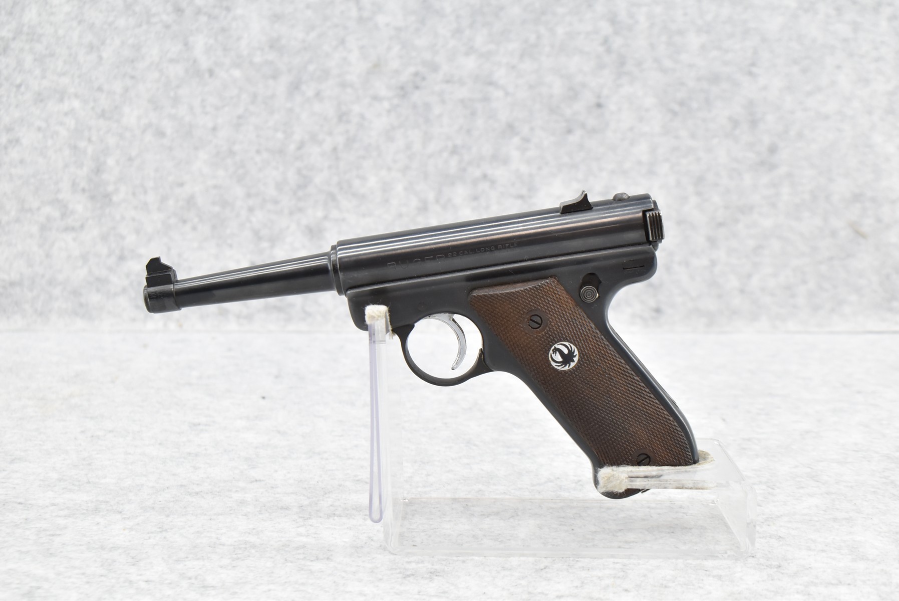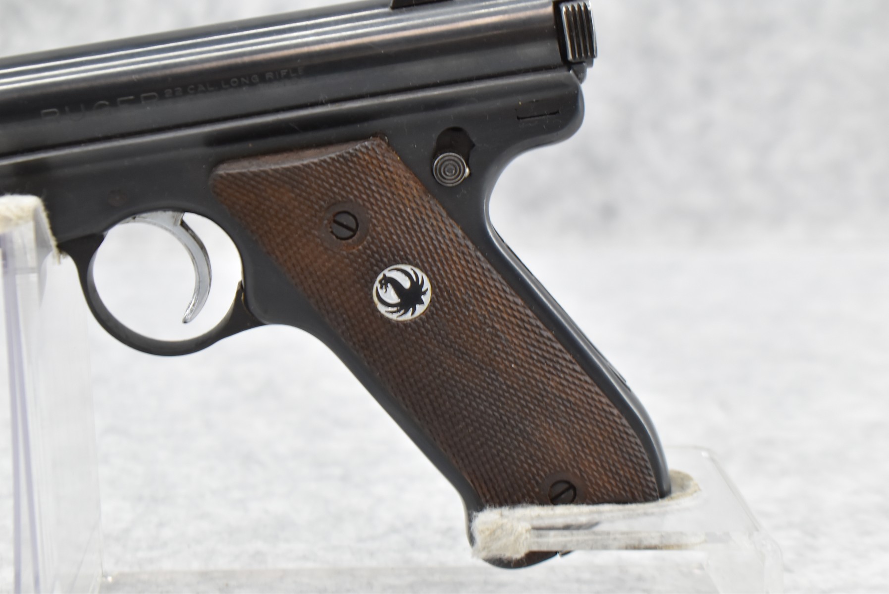 253R.     Ruger – Mod. Standard – 22LR Cal. Semi-Auto Pistol – w/4 5/8” Barrel w/Blade Front and Rear Notch Iron Sights – Blued Finish – w/Factory Checkered Wood Grips w/Ruger Medallion – w/Factory Magazine