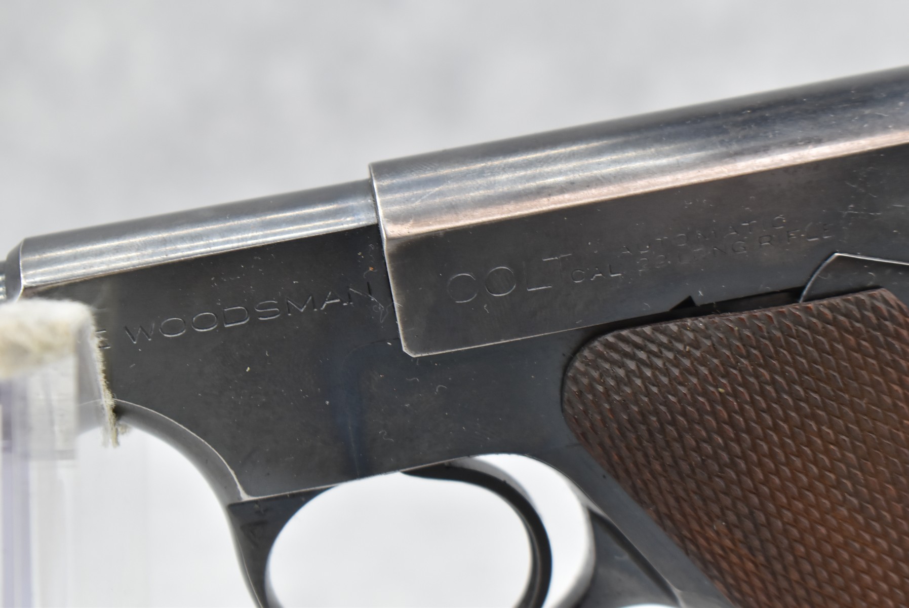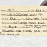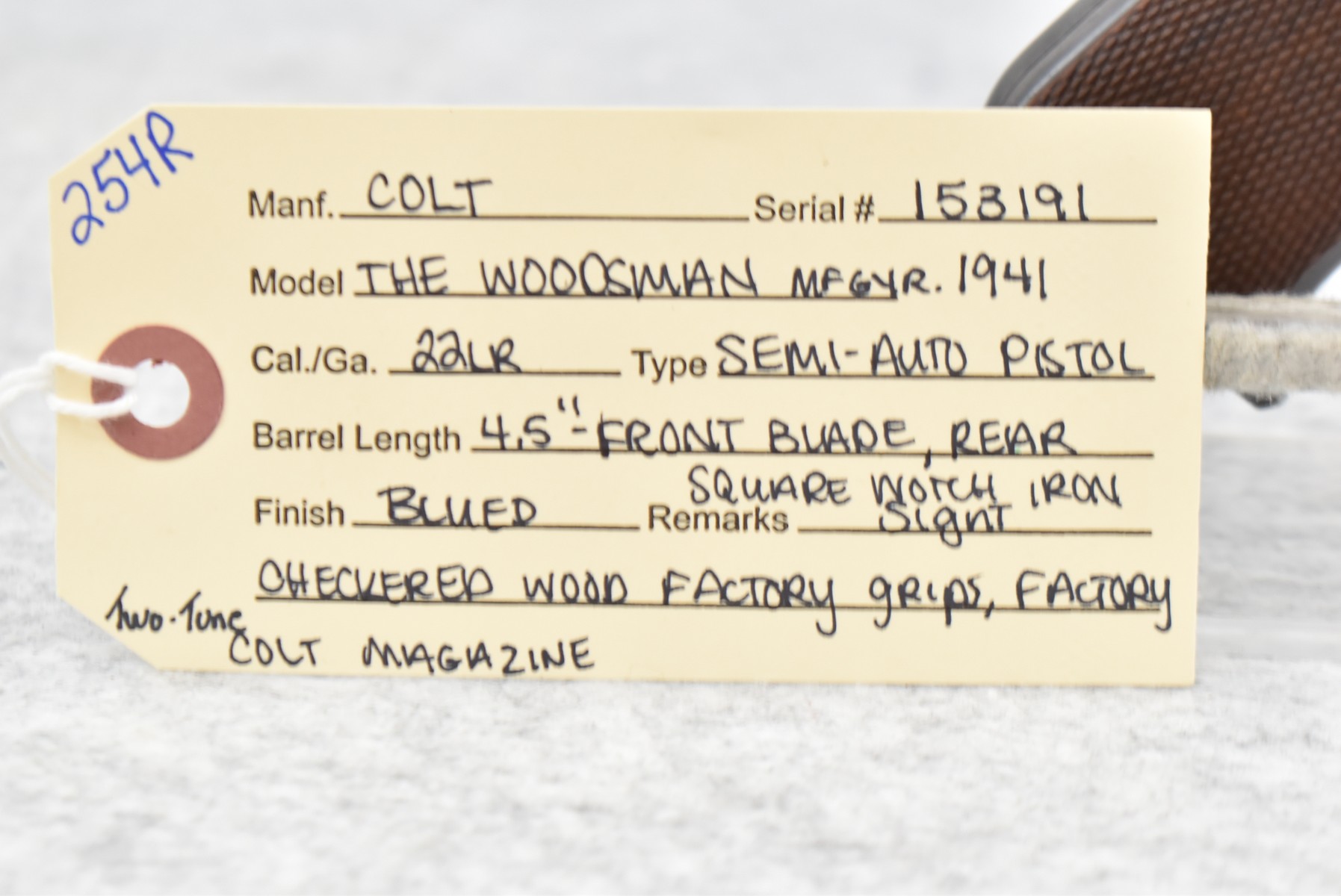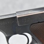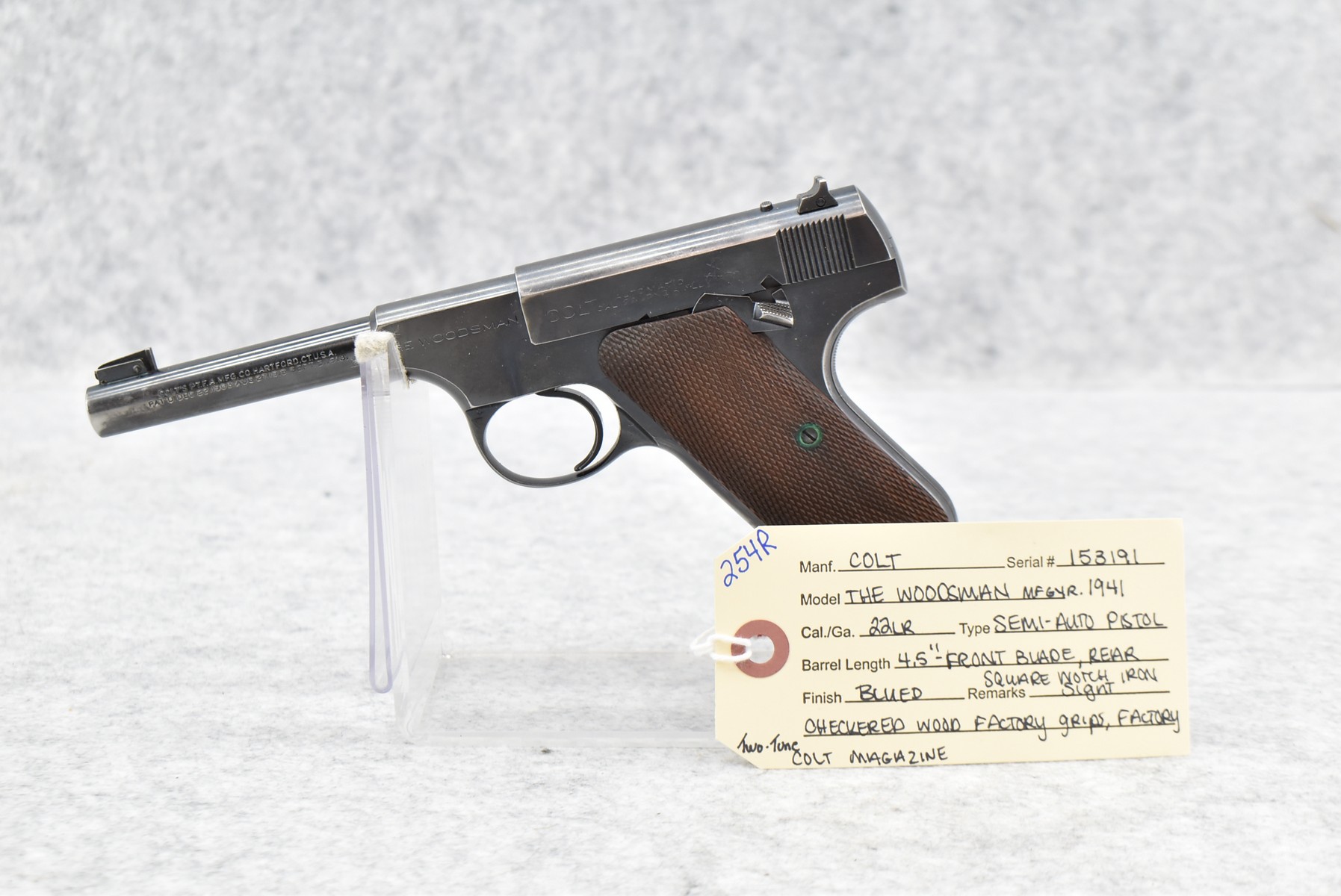254R. Colt – Mod. The Woodsman – 22LR Cal. Semi-Auto Pistol – w/4½” Barrel w/Front Blade and Rear Square Notch Iron Sights – Blued Finish – w/Factory Checkered Wood Grips – w/Factory Two-Toned Colt Magazine