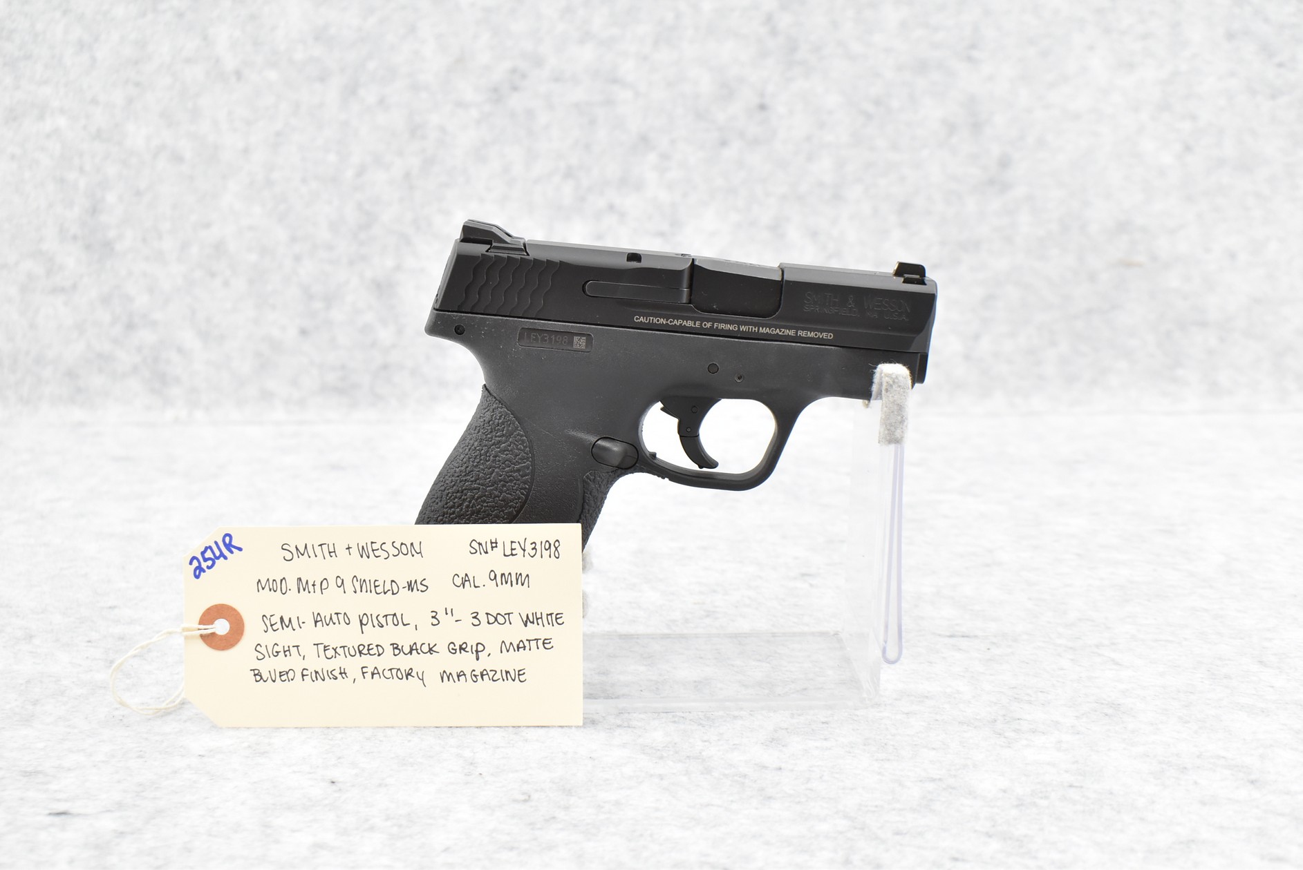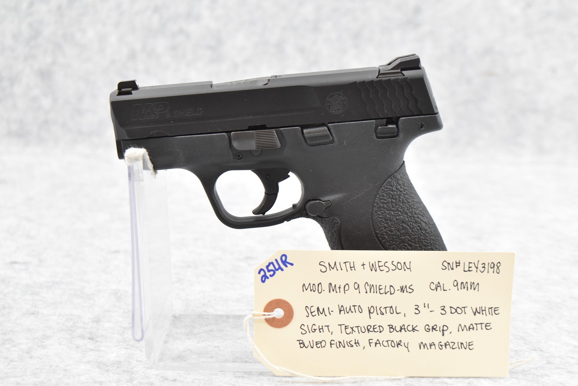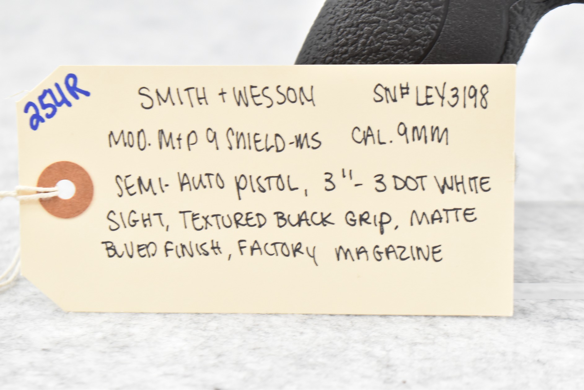 254R. Smith & Wesson – Mod. M&P 9 Shield-MS – 9mm Cal. Semi-Auto Pistol – w/3” Barrel w/3-Dot White Sight – Matte Blued Finish – w/Textured Black Grip – w/Factory Magazine