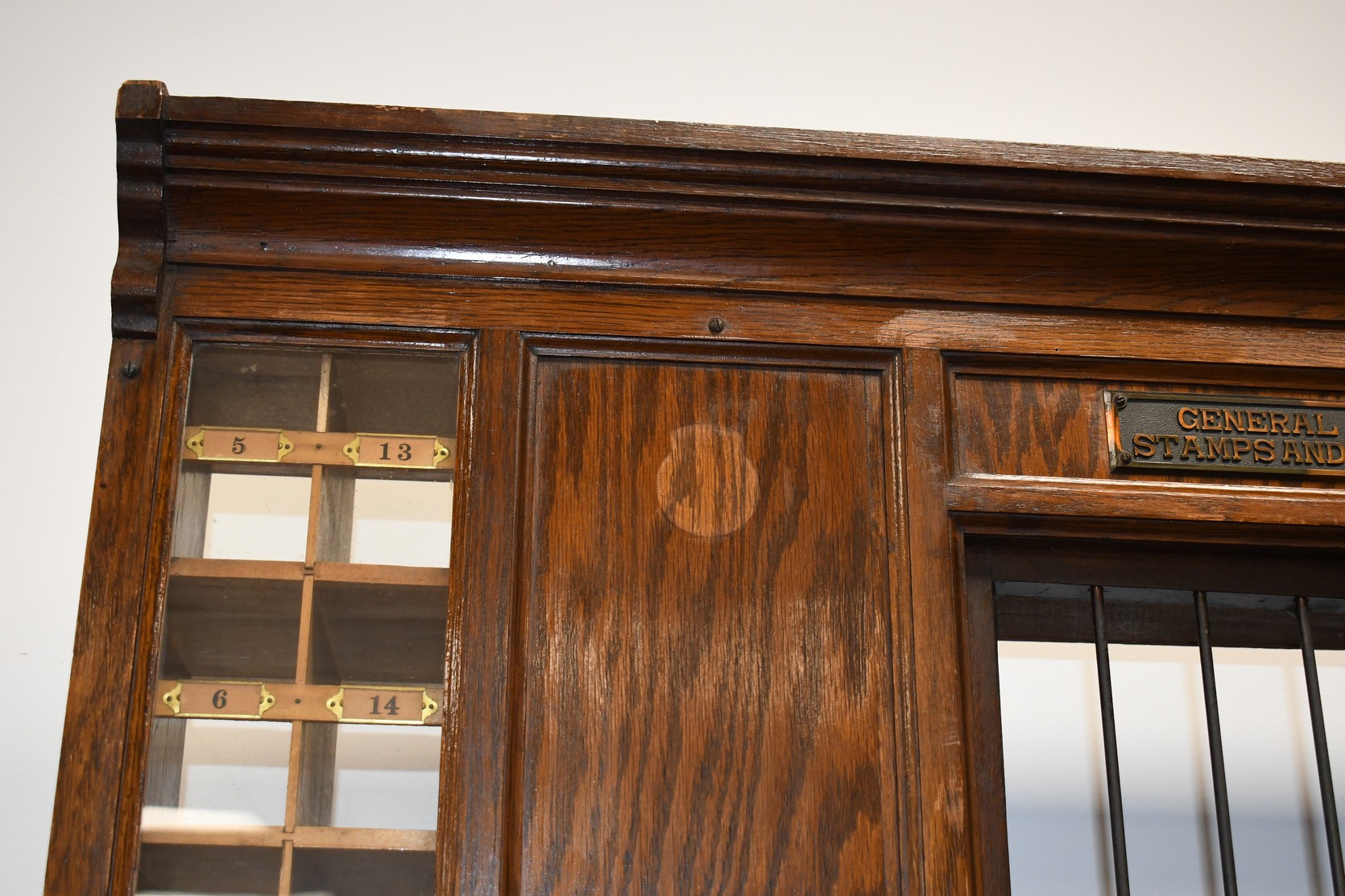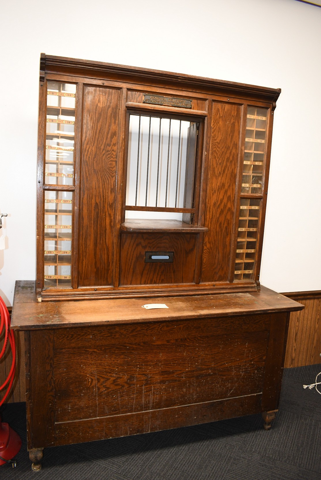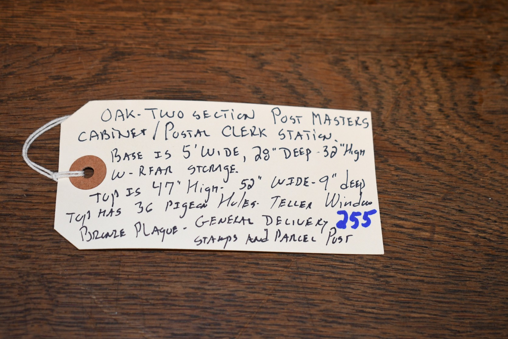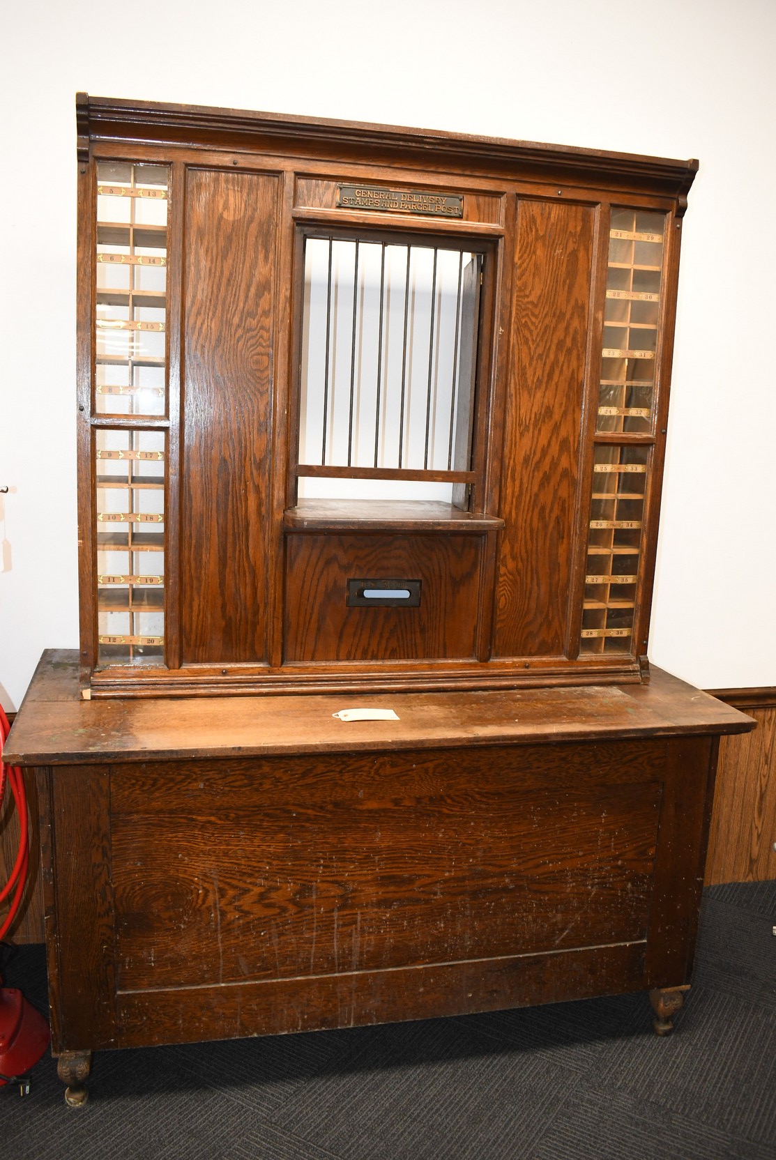 255. Unique Oak 2-Section Post Masters/Postal Clerk Station – Base of the Unit is 5’ Wide x 32” High x 28” Deep w/Rear Storage – Top is 47” High x 52” Wide x 9” Deep – The Top has 36 Rear Access Pigeonholes and Teller Window w/Bars – The Bronze Plaque Reads General Delivery Stamp and Parcel Post – Will Not Ship, Pickup Only or You Must Arrange Your Own Shipping!