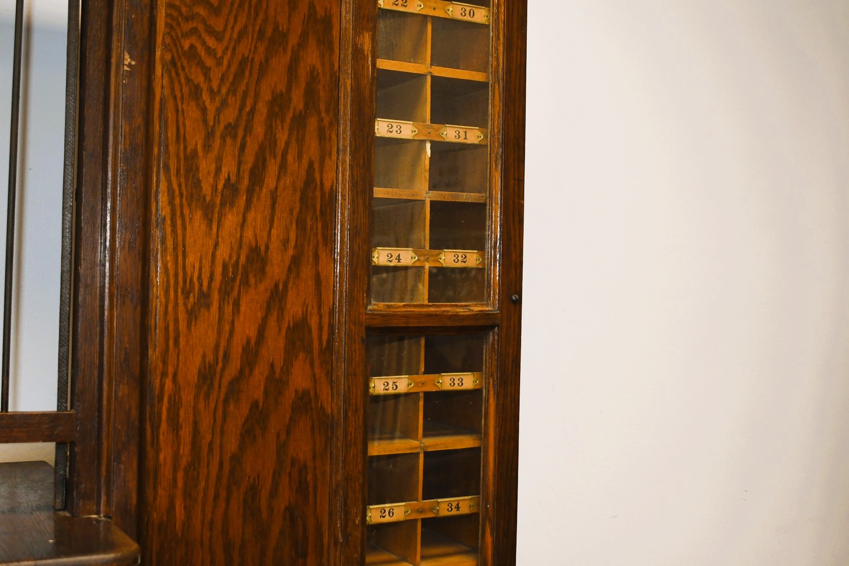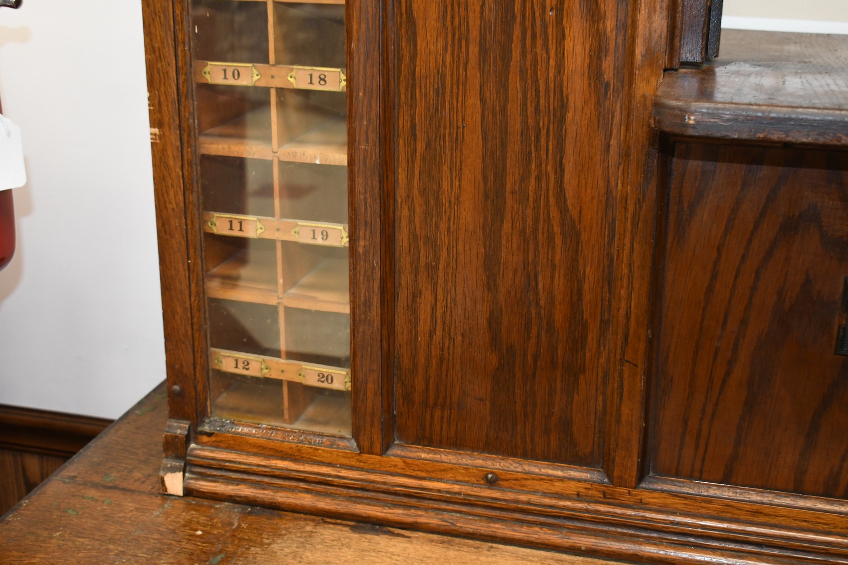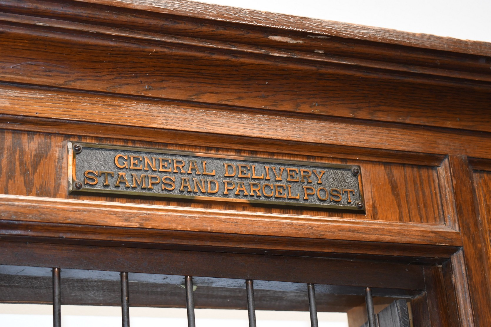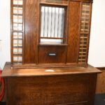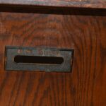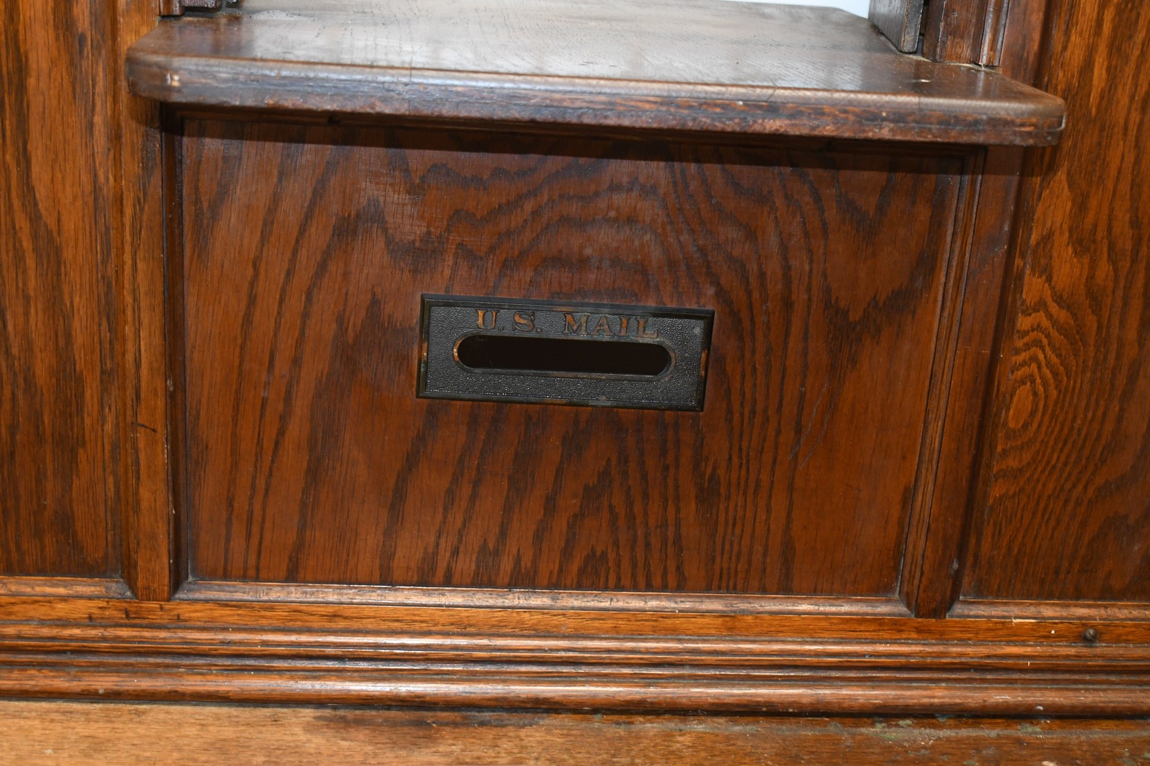 255. Unique Oak 2-Section Post Masters/Postal Clerk Station – Base of the Unit is 5’ Wide x 32” High x 28” Deep w/Rear Storage – Top is 47” High x 52” Wide x 9” Deep – The Top has 36 Rear Access Pigeonholes and Teller Window w/Bars – The Bronze Plaque Reads General Delivery Stamp and Parcel Post – Will Not Ship, Pickup Only or You Must Arrange Your Own Shipping!
