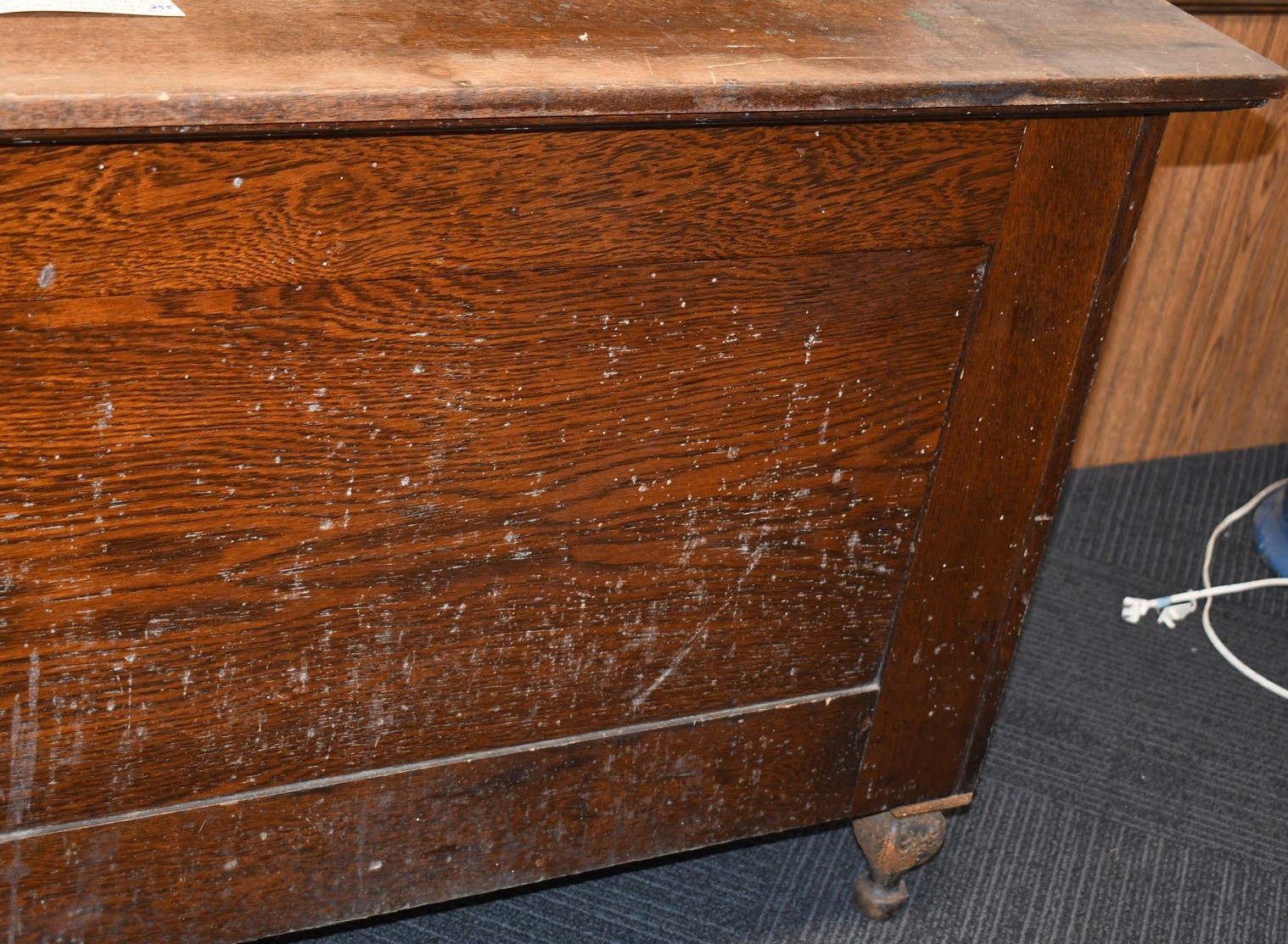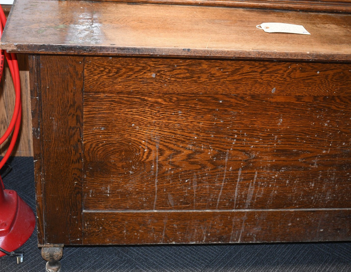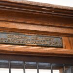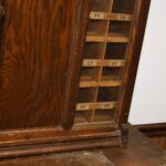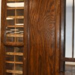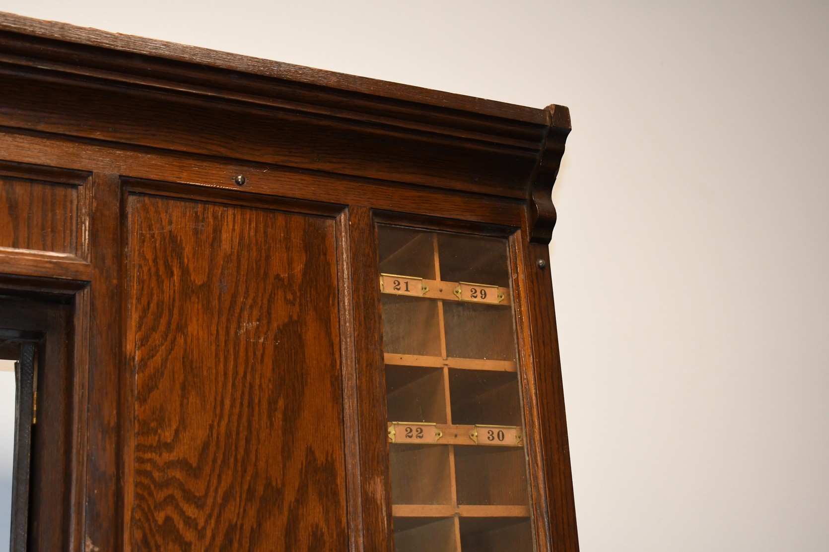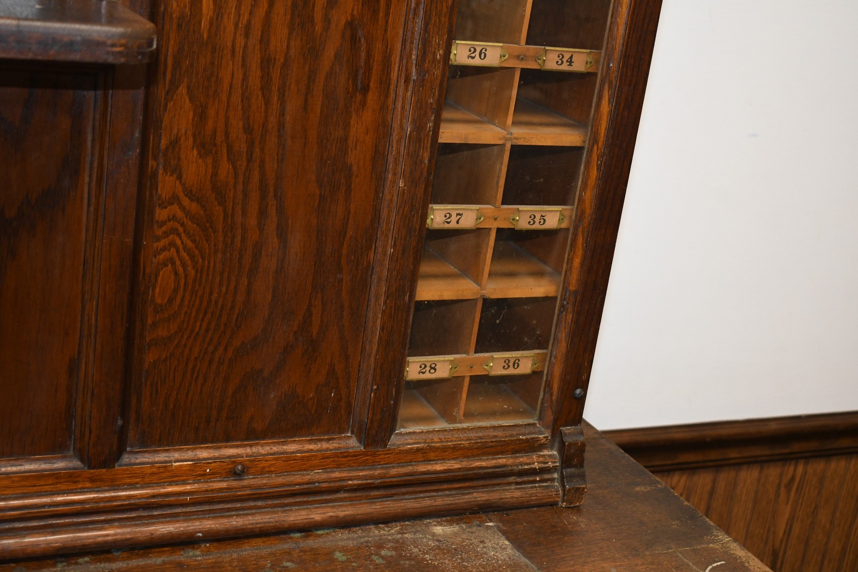 255. Unique Oak 2-Section Post Masters/Postal Clerk Station – Base of the Unit is 5’ Wide x 32” High x 28” Deep w/Rear Storage – Top is 47” High x 52” Wide x 9” Deep – The Top has 36 Rear Access Pigeonholes and Teller Window w/Bars – The Bronze Plaque Reads General Delivery Stamp and Parcel Post – Will Not Ship, Pickup Only or You Must Arrange Your Own Shipping!