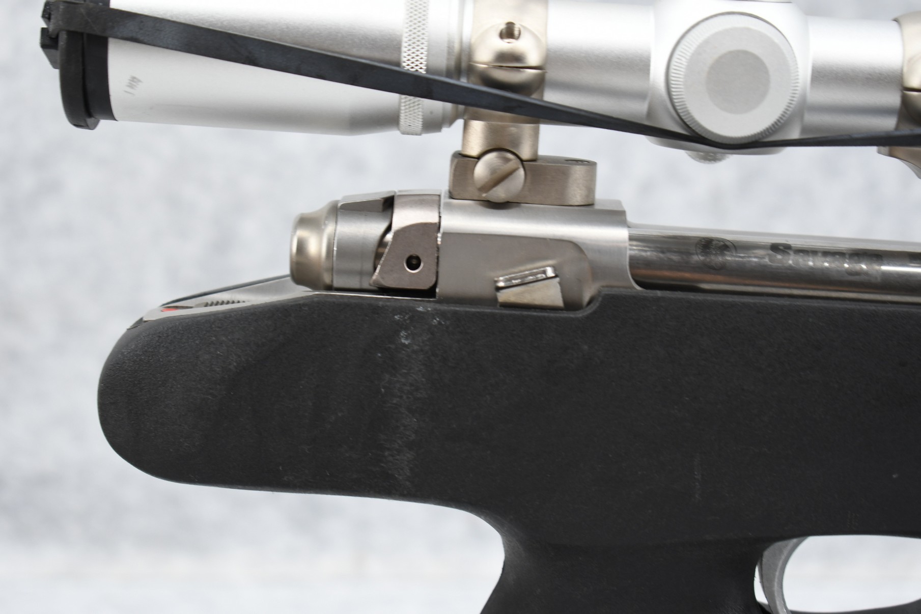 255R. Savage – Mod. 516-Striker Handgun – 22-250 Rem. Cal. Bolt Action Pistol – w/14 ½” Barrel w/Adj. Muzzle Brake – Stainless Finish – w/Black Synthetic Pistol Grip Stock – w/Burris 2x EER Stainless Hand Gun Scope – w/Burris Stainless Rings & Mounting Bases – As New w/Factory Box