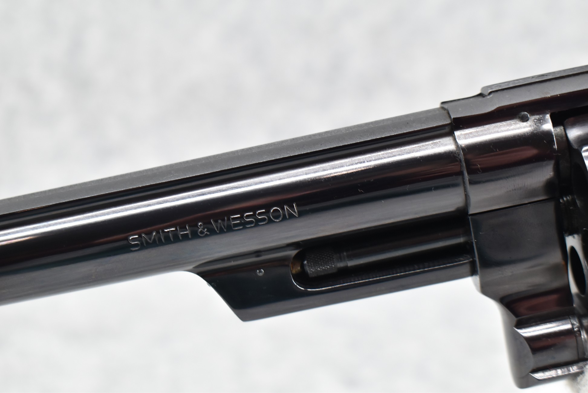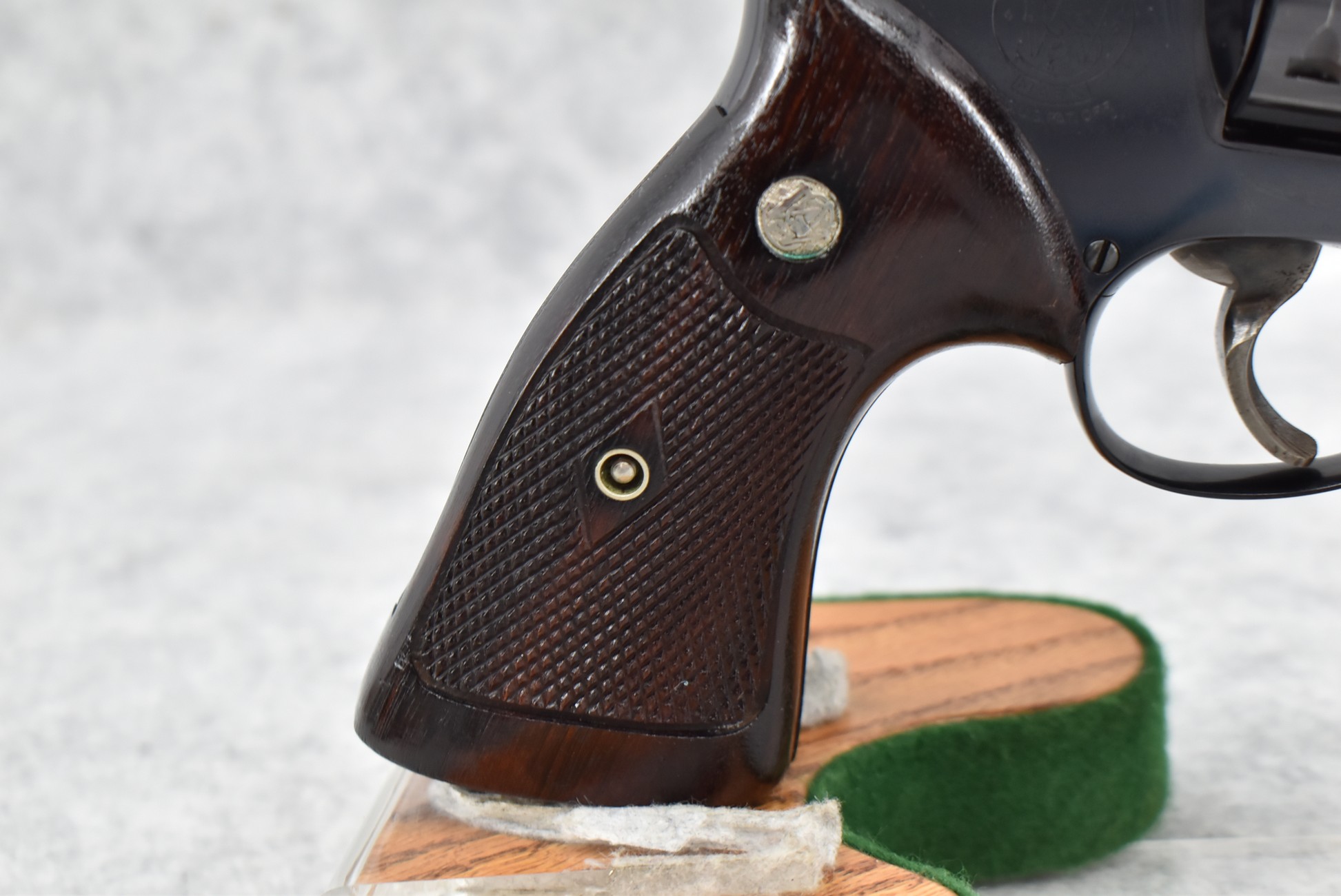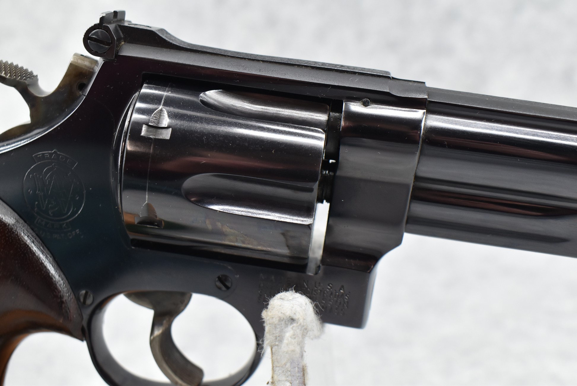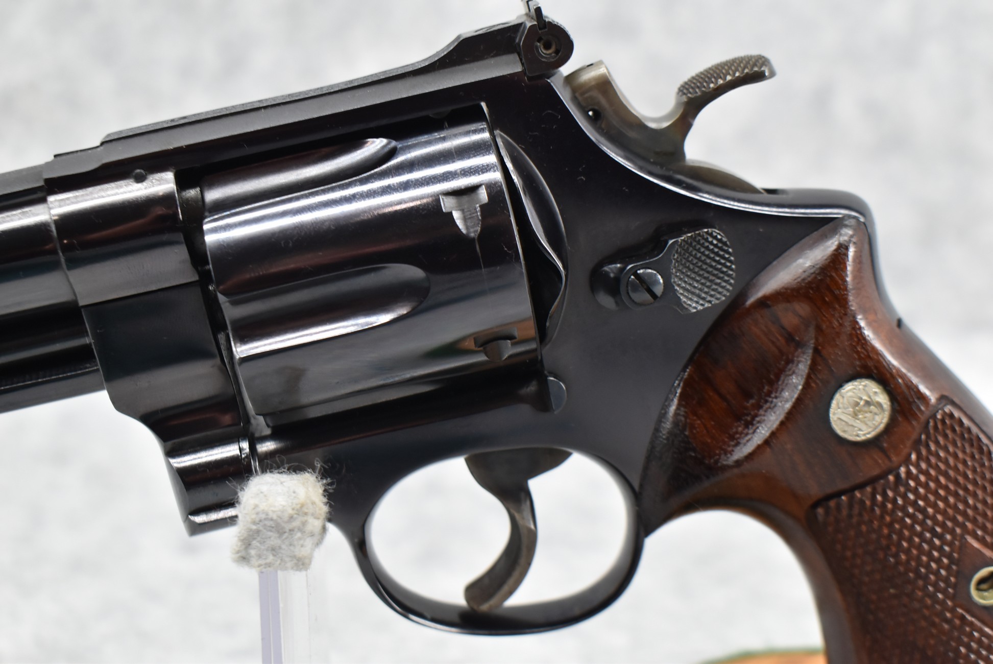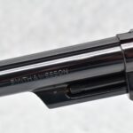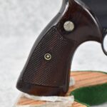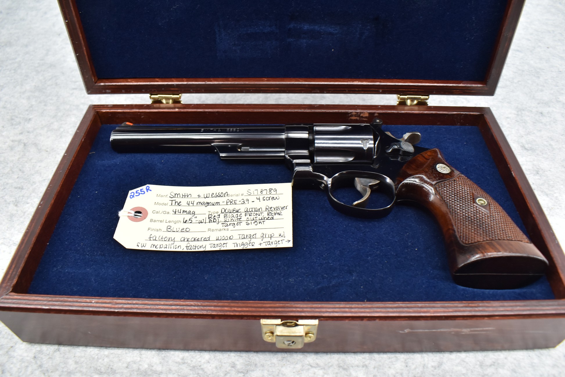 255R. Smith & Wesson – Mod. The 44 Magnum-Pre-29 (4-Screw) – 44 Mag. Cal. Double Action Revolver – w/6.5” Barrel w/Red Blade Front & Rear Adj. White Outlined Target Sights – Blued Finish – w/Factory Checkered Wood Target Grip w/S&W Medallion, Factory Target Trigger & Target Hammer – 3 T’s – All Matching Serial Numbers Inside Ejector Shroud, Back of Cylinder & Butt – w/Newer Factory Presentation Box w/Blue Felt – Mfg. Around 1957-1957