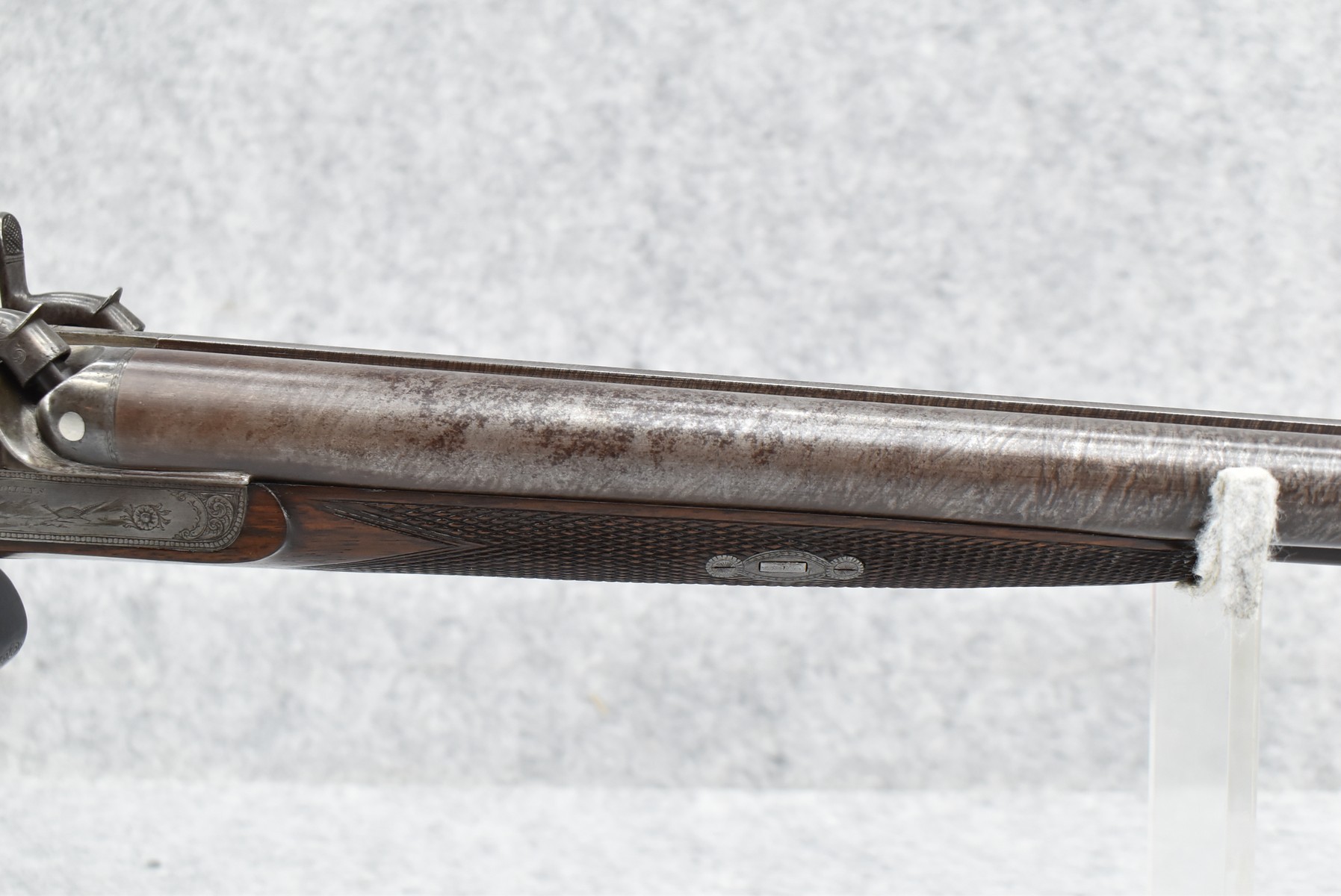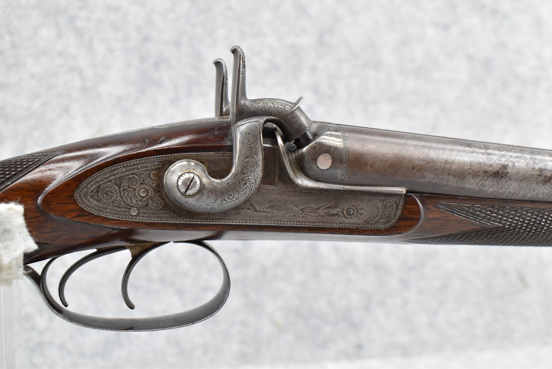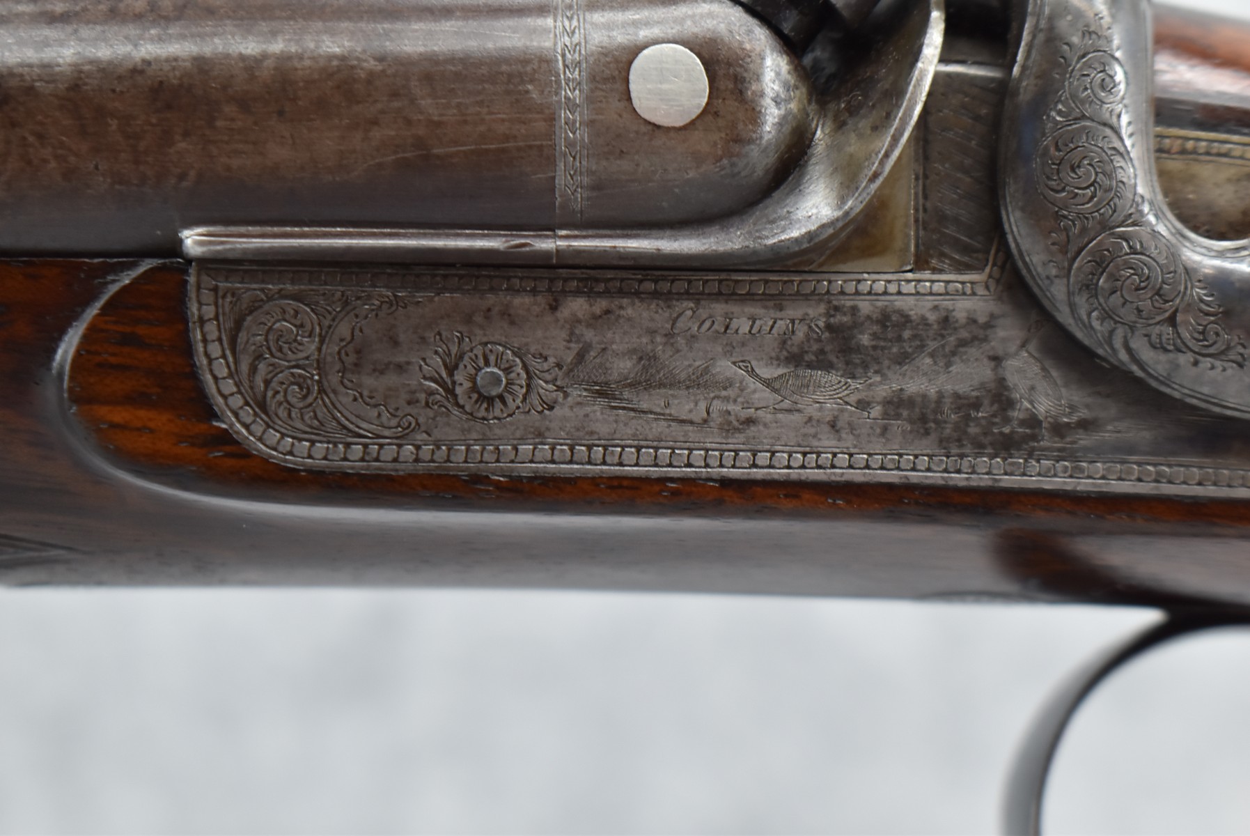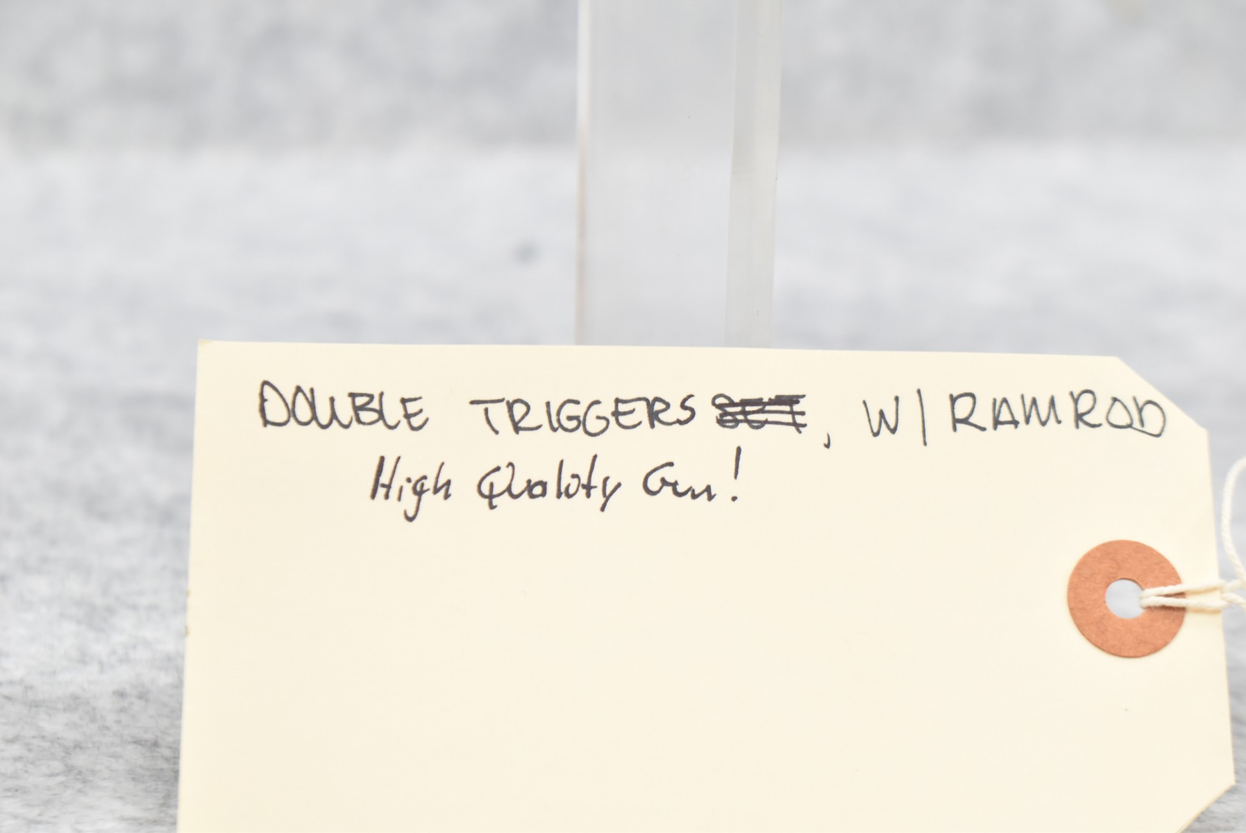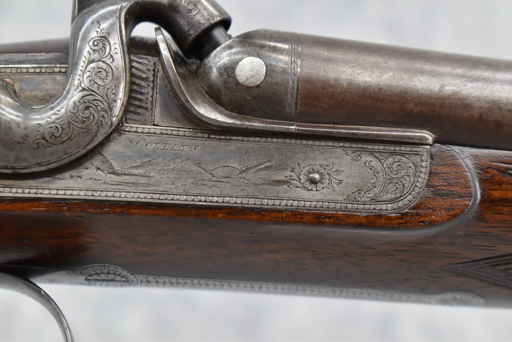 257.        Collins – 12ga. Black Powder Double Barrel Shotgun – w/31” Damascus Barrels w/Front Bead Sight – Fine Engraved Receiver – w/Checkered Straight Grip Wood Stock – w/Double Triggers – w/Ram Rod – High Quality Gun!