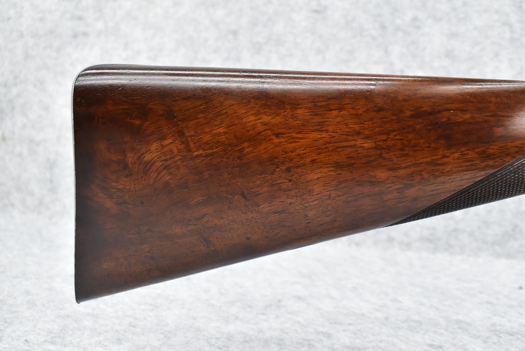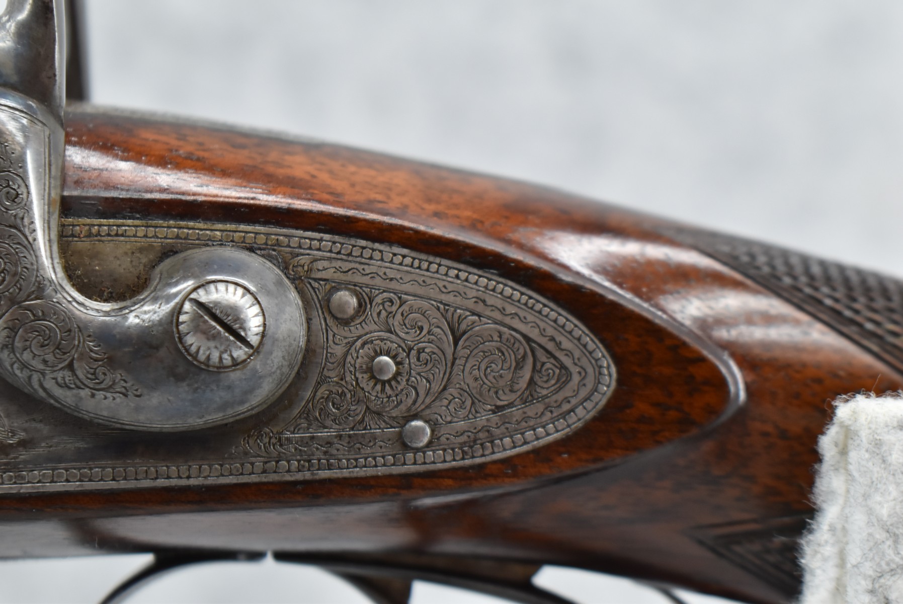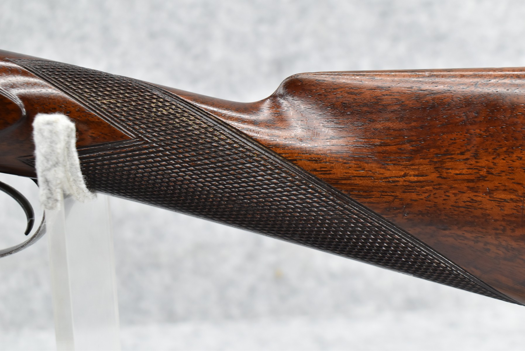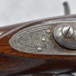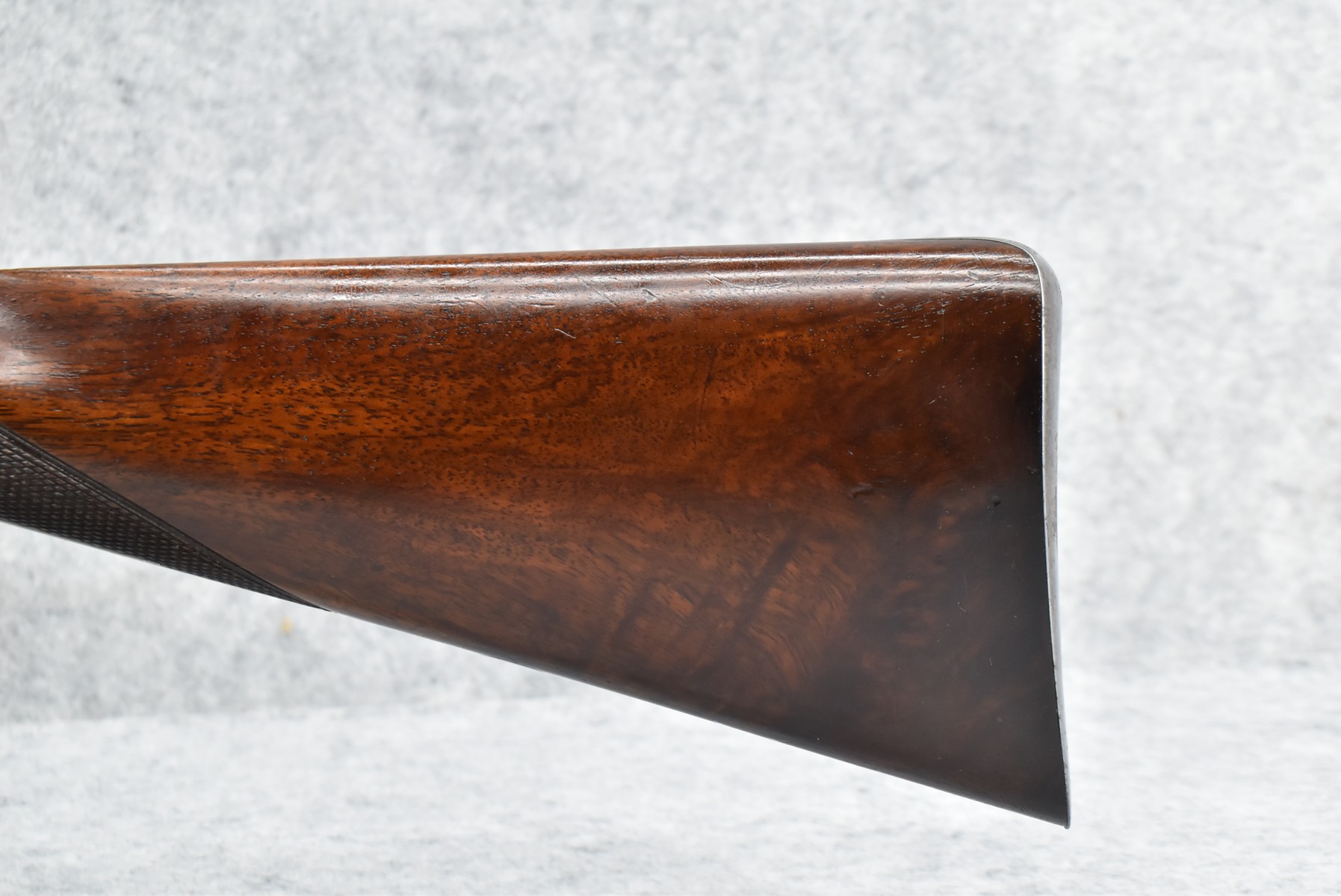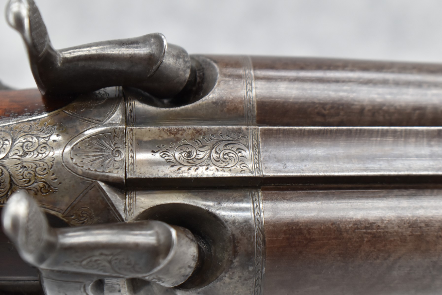 257.        Collins – 12ga. Black Powder Double Barrel Shotgun – w/31” Damascus Barrels w/Front Bead Sight – Fine Engraved Receiver – w/Checkered Straight Grip Wood Stock – w/Double Triggers – w/Ram Rod – High Quality Gun!