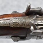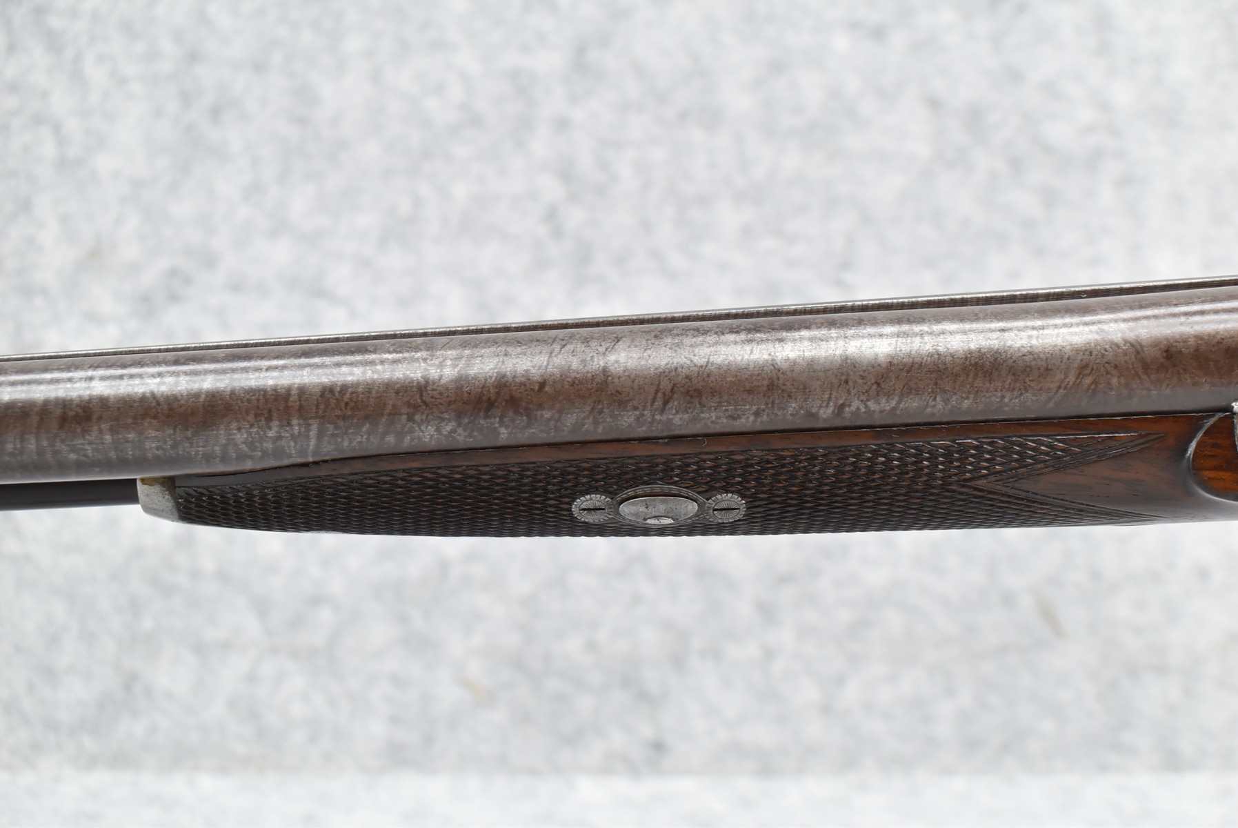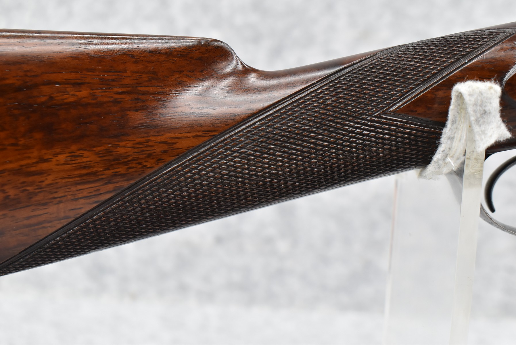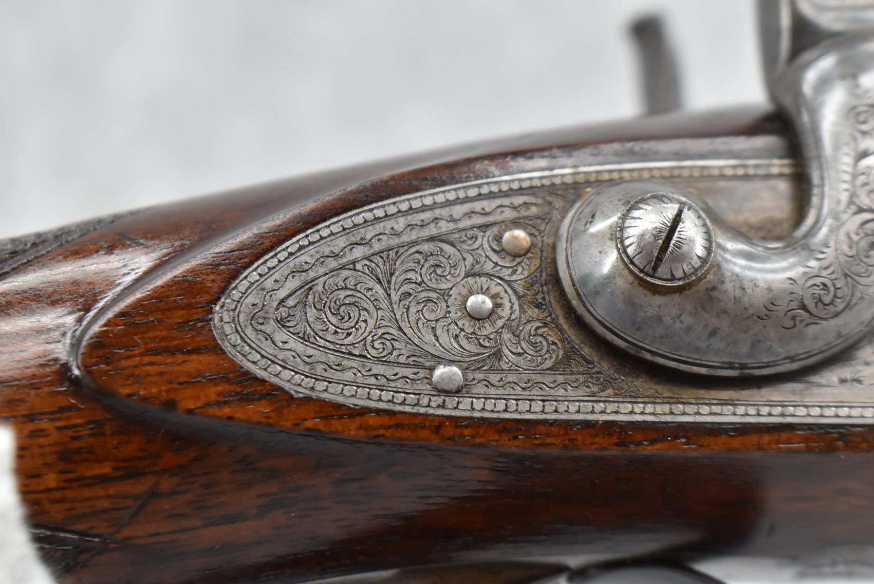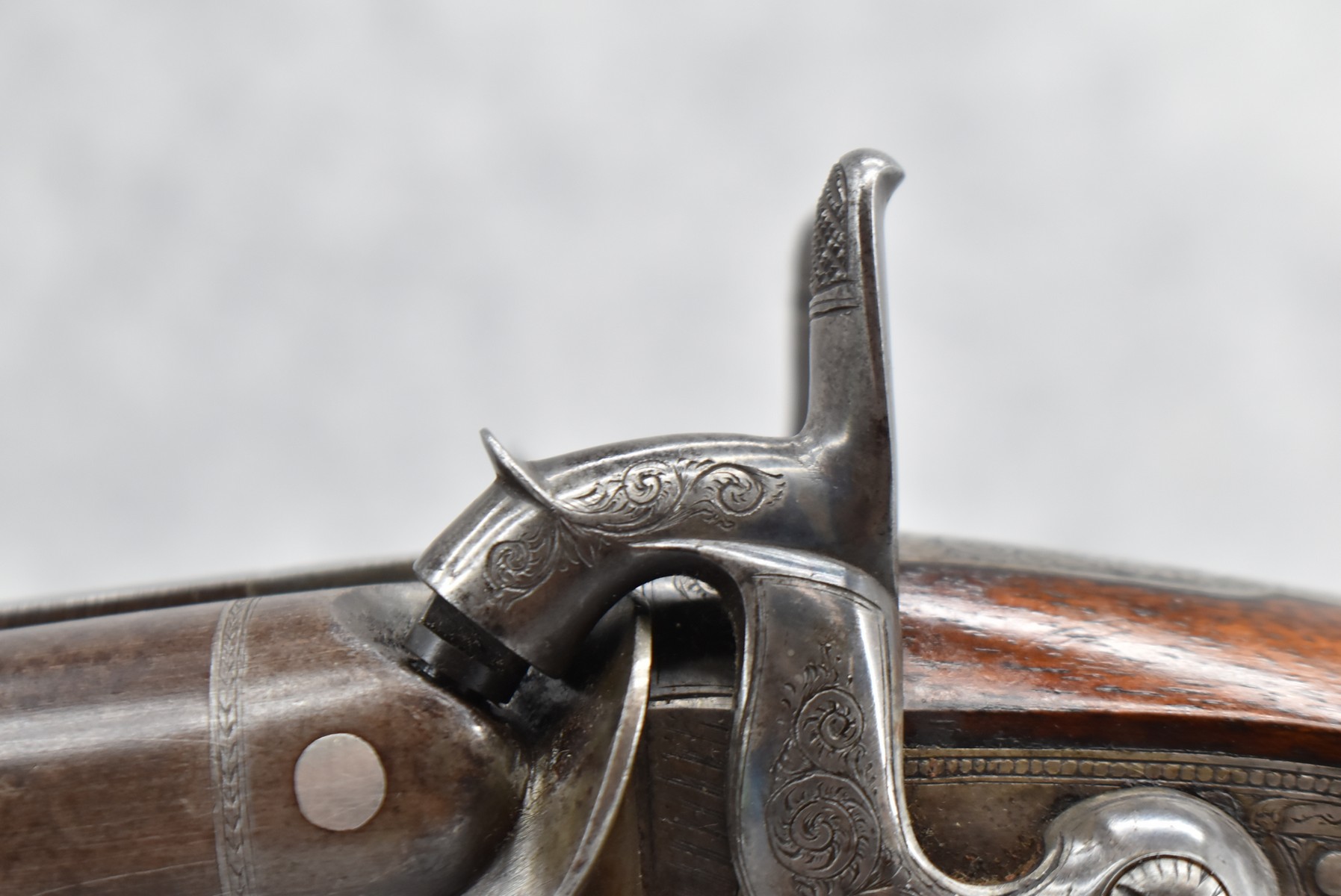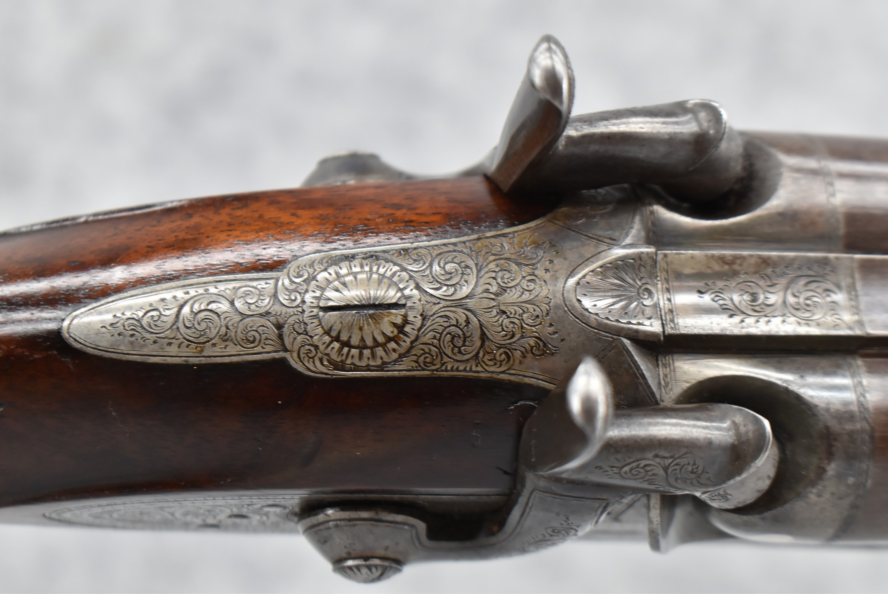 257.        Collins – 12ga. Black Powder Double Barrel Shotgun – w/31” Damascus Barrels w/Front Bead Sight – Fine Engraved Receiver – w/Checkered Straight Grip Wood Stock – w/Double Triggers – w/Ram Rod – High Quality Gun!