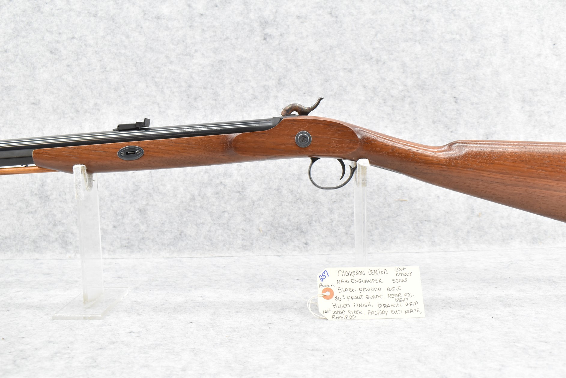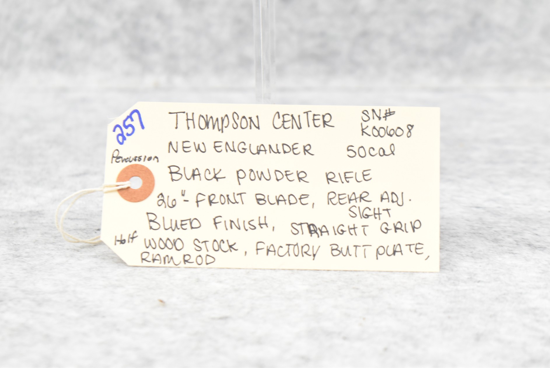 257. Thompson Center – Mod. New Englander – 50 Cal. Percussion Black Powder Rifle – w/26” Barrel w/Front Blade & Rear Adj. Sights – Blued Finish – w/Straight Grip Half Wood Stock w/Factory Butt Plate – w/Ram Rod