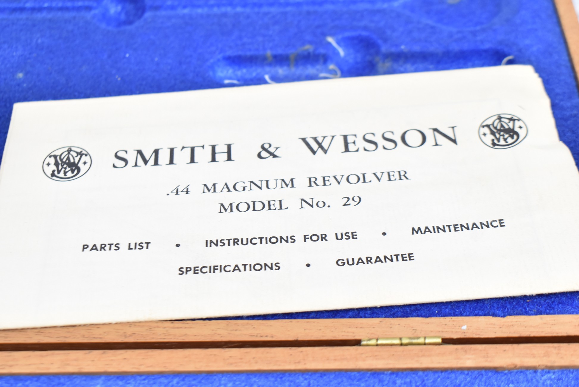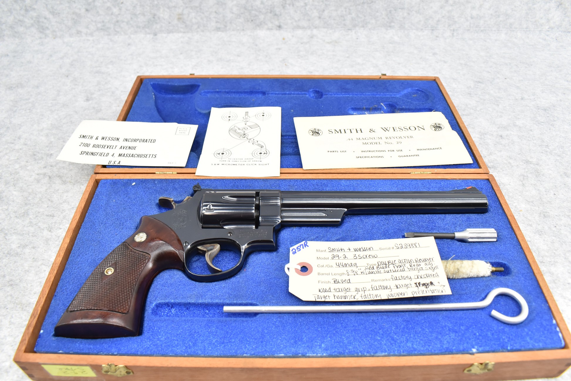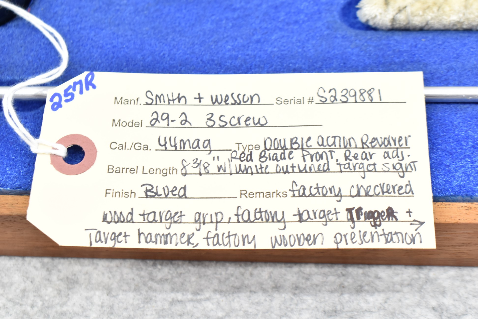 257R. Smith & Wesson – Mod. 29-2 (3-Screw) – 44 Mag. Cal. Double Action Revolver – w/8 3/8” Barrel w/Red Blade Front & Rear Adj. White Outlined Target Sights – Blued Finish – w/Factory Checkered Wood Target Grip, Factory Target Trigger & Target Hammer – 3 T’s – w/Factory Wooden Presentation Box w/Blue Felt, Factory Manual, Cleaning Tools w/Rod & Swab & Screwdriver – Mfg. Around 1964-1965